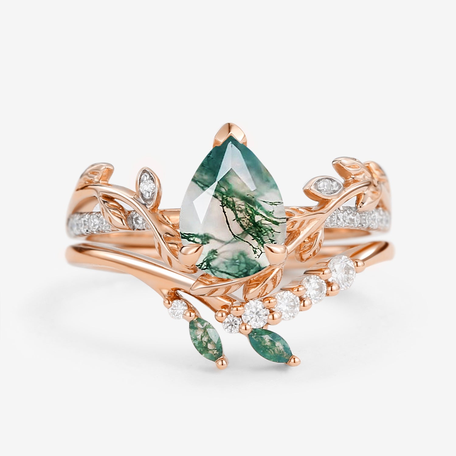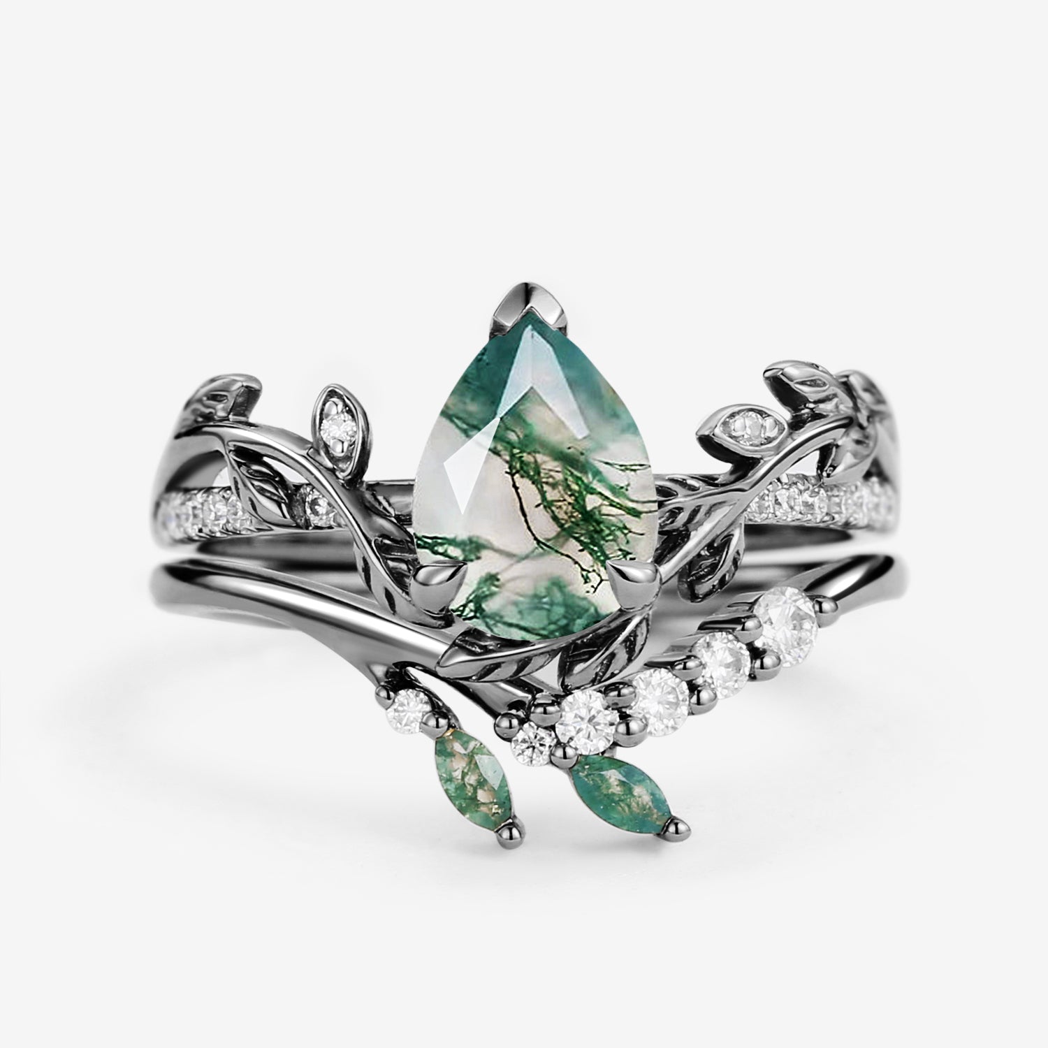 Leafy Pear Shaped Moss Agate Bridal Ring Set 2pcs