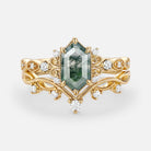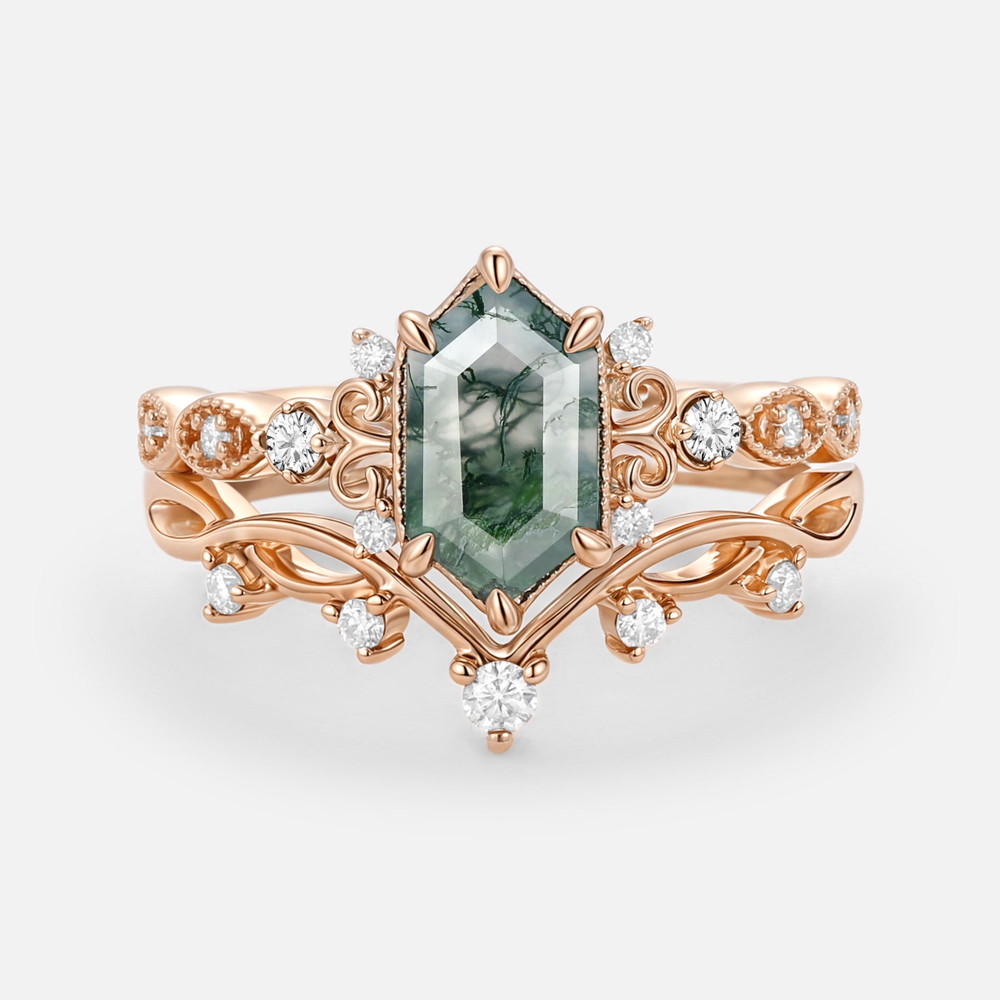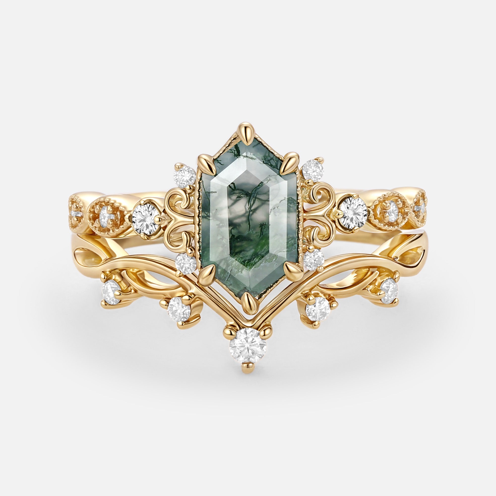 Long Hexagon Moss Agate Engagement Ring Set 2pcs - Beryl