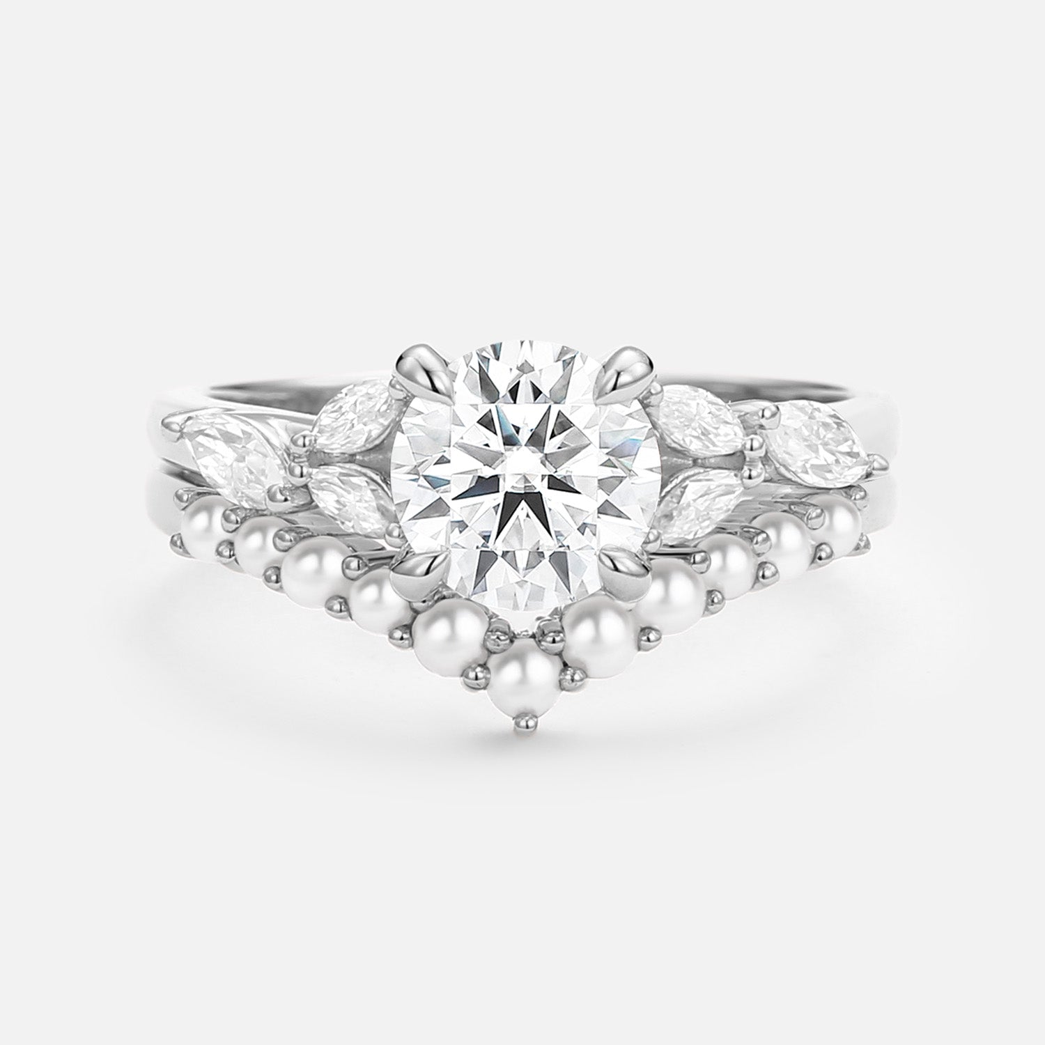 Felicegals 1ct Moissanite & Freshwater Pearl Engagement Rose Gold Ring Set 2pcs Leafy Vine Ring Cluster Marquise Moissanite Ring Pearl Chevron Band Women Cluster Ring Birthstone