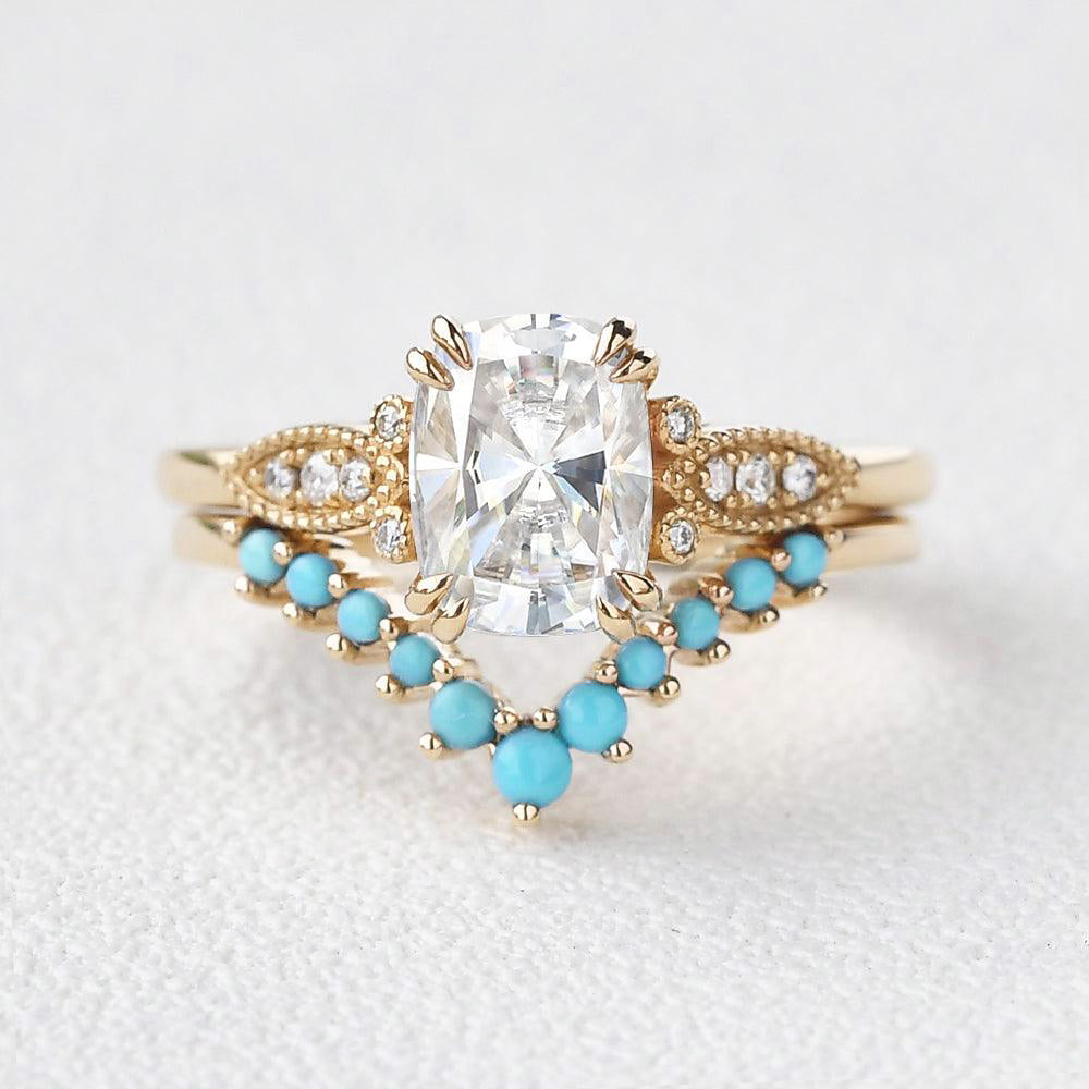 Felicegals 6*8mm Moissanite & Turquoise Vintage Inspired Engagement Ring Set 2pcs Chevron Turquoise Vintage Inspired Rose Gold Ring Custom Curved Matching Ring