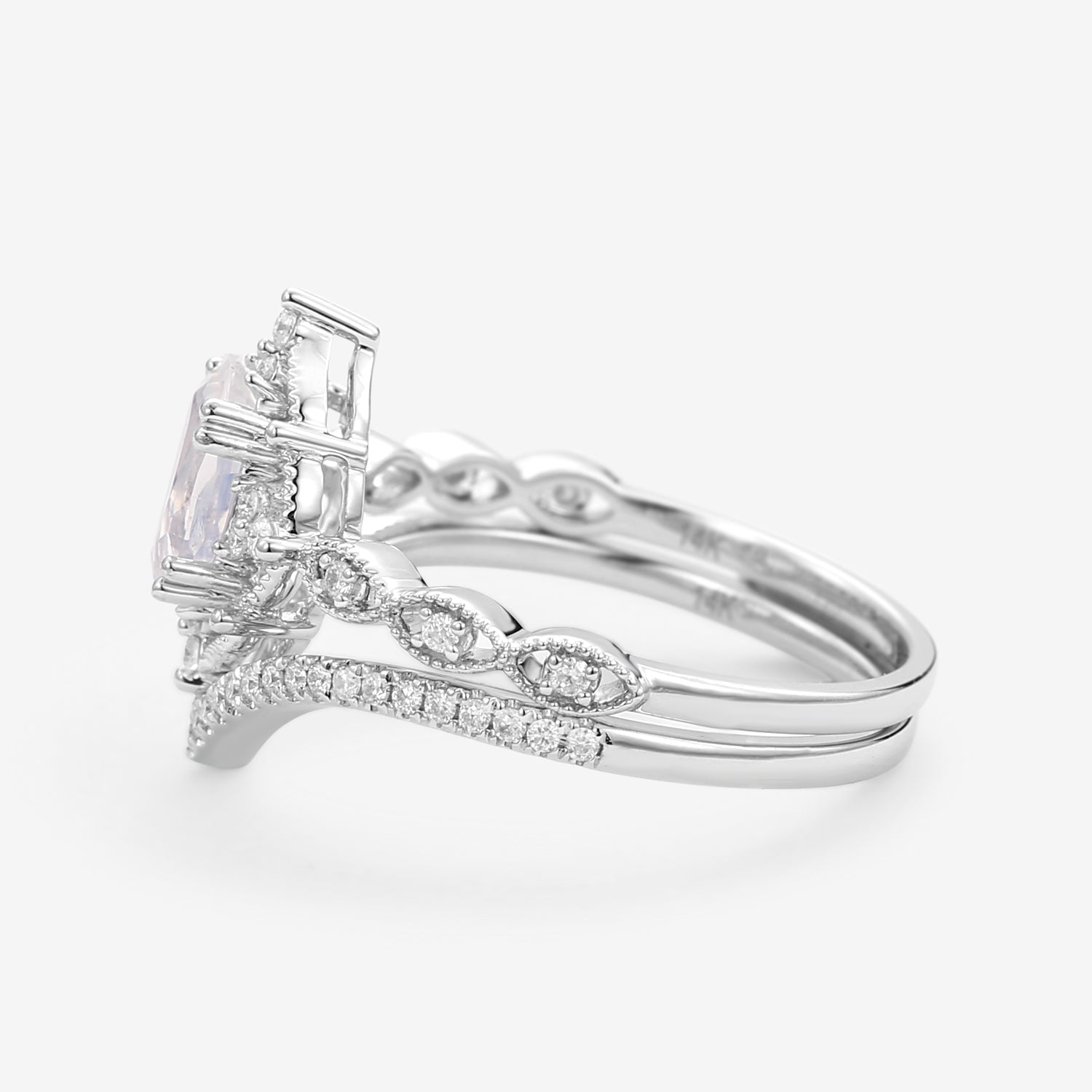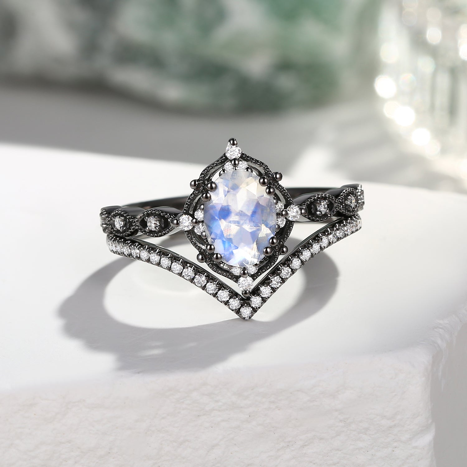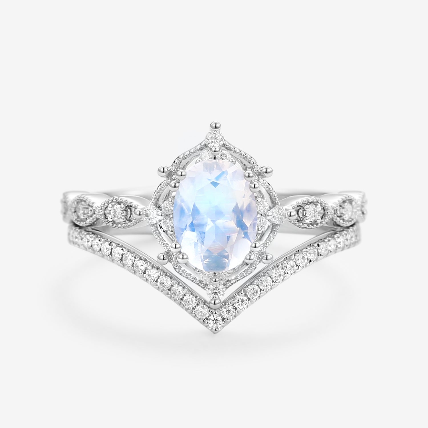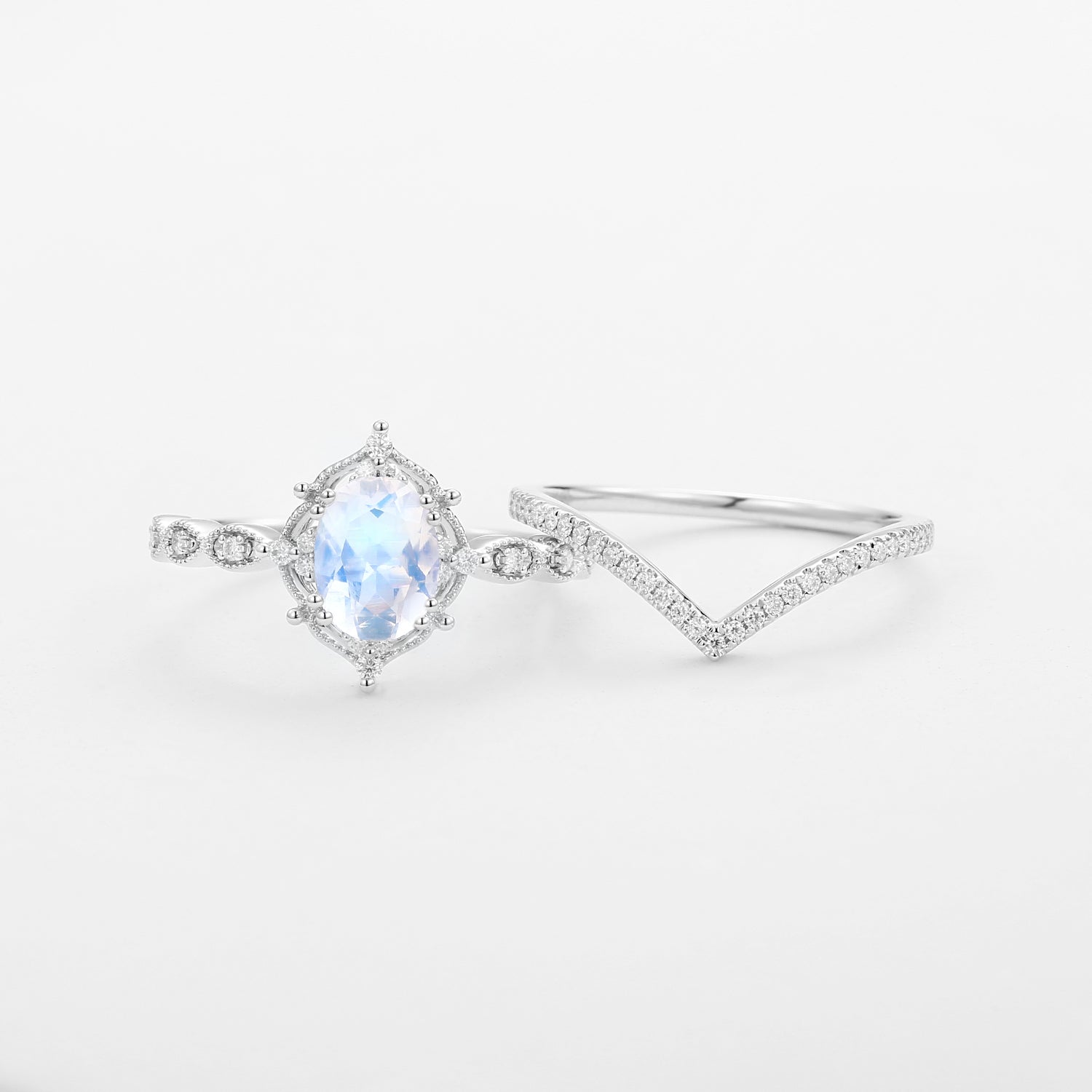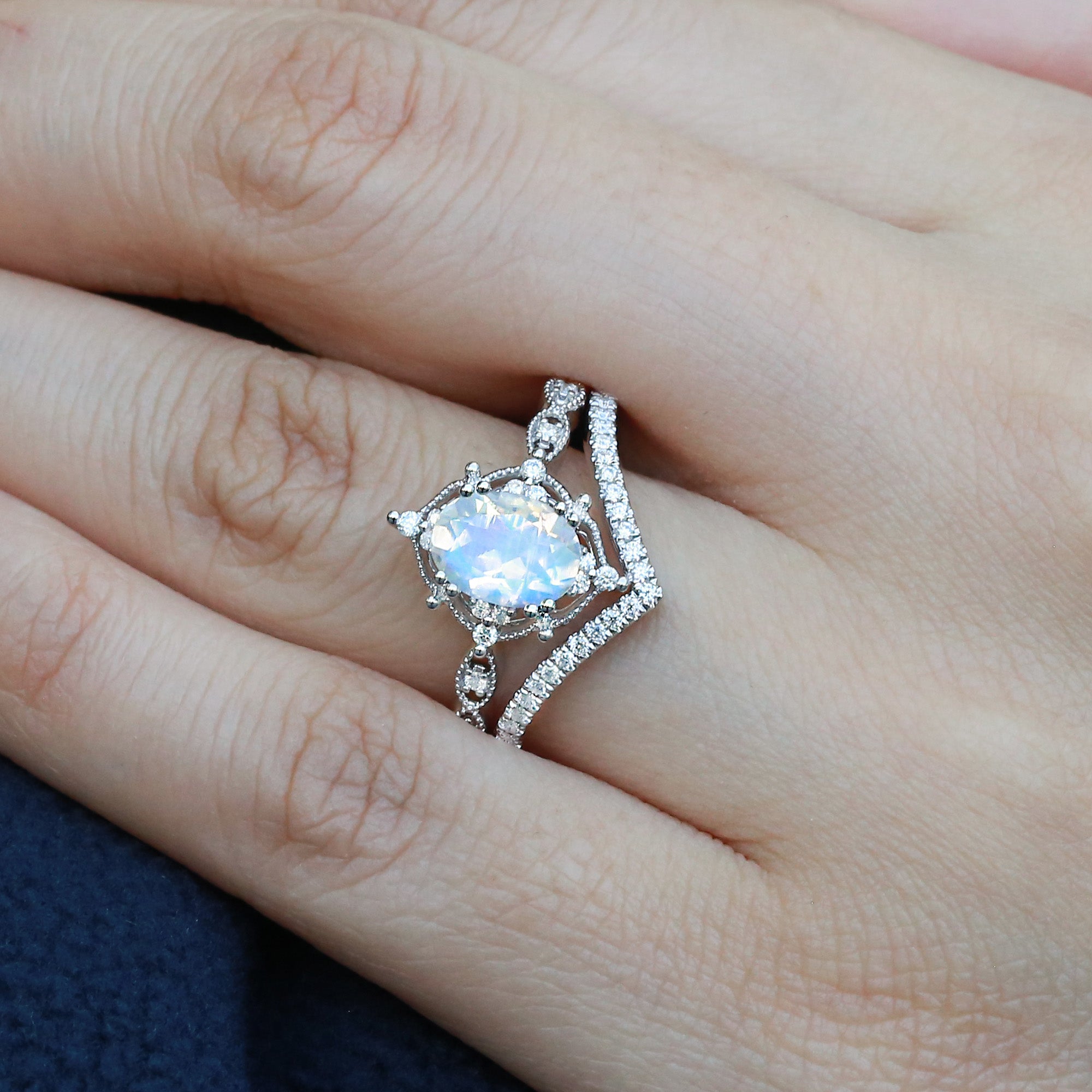 Felicegals Moonstone & Moissanite Engagement Ring Set 2pcs Antique Oval Vine Vintage Inspired Wedding Ring Moissanite V Shaped Wedding Band Anniversary Gift for Her