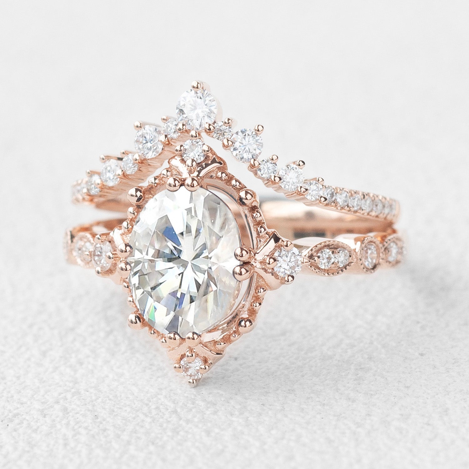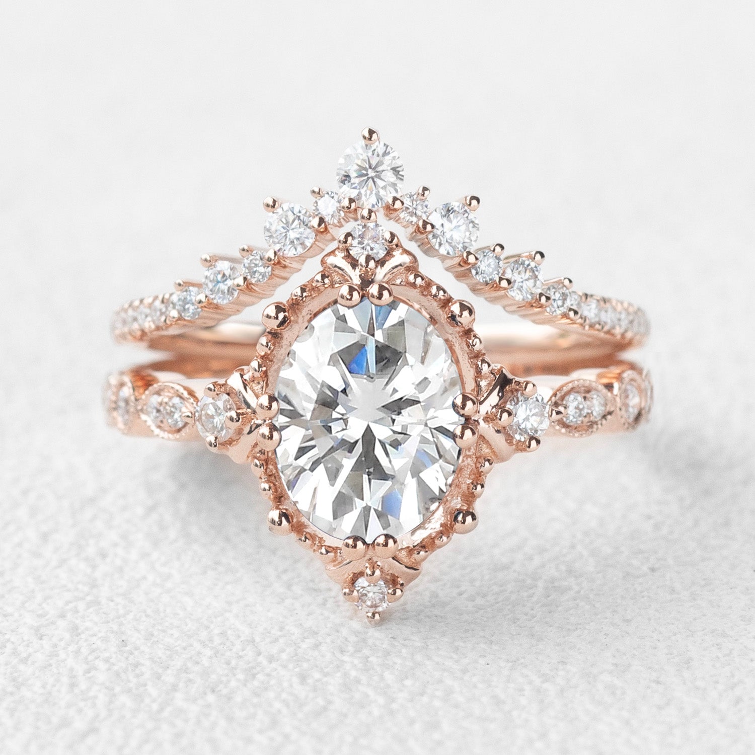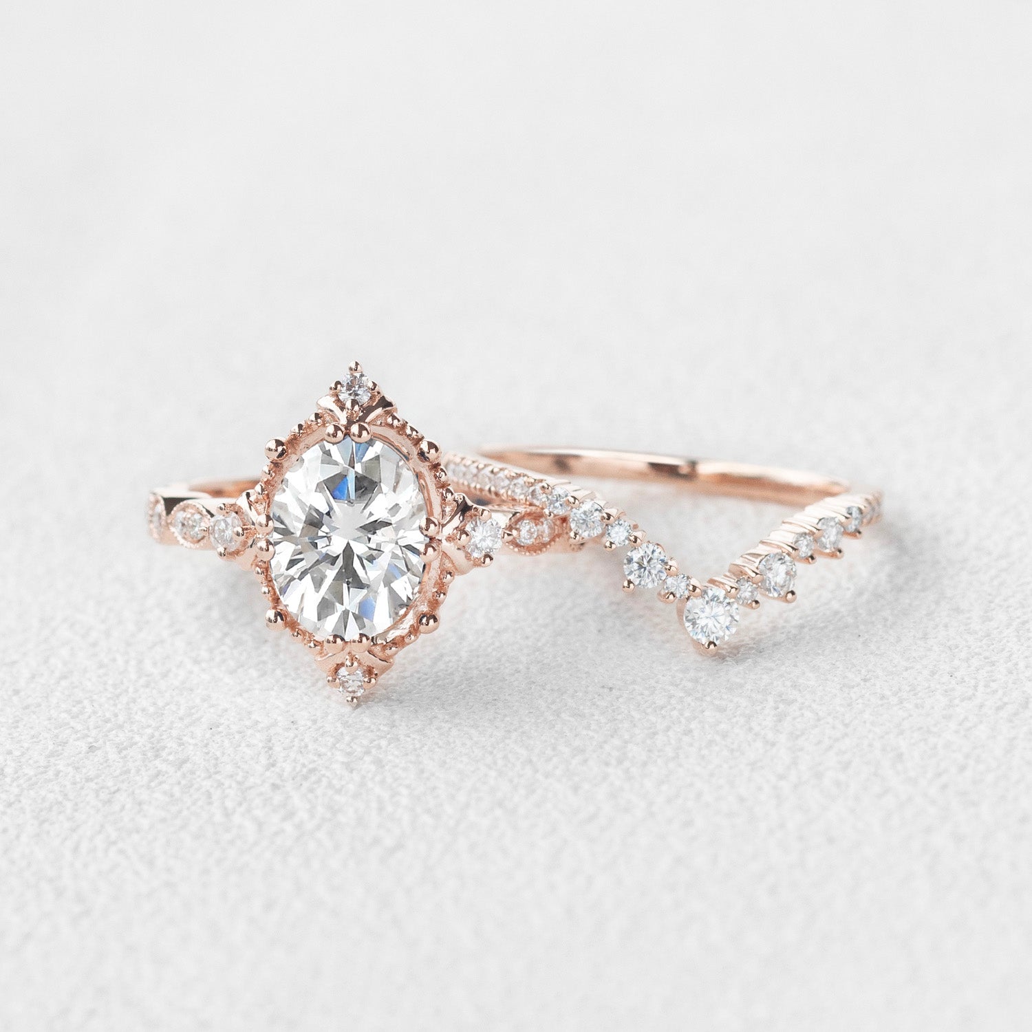 Felicegals Oval Moissanite Art Deco Ring Set 2pcs Cut Halo Birthstone Wedding Rose Gold Ring Moissanite Antique Ring Custom Jewellry