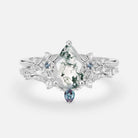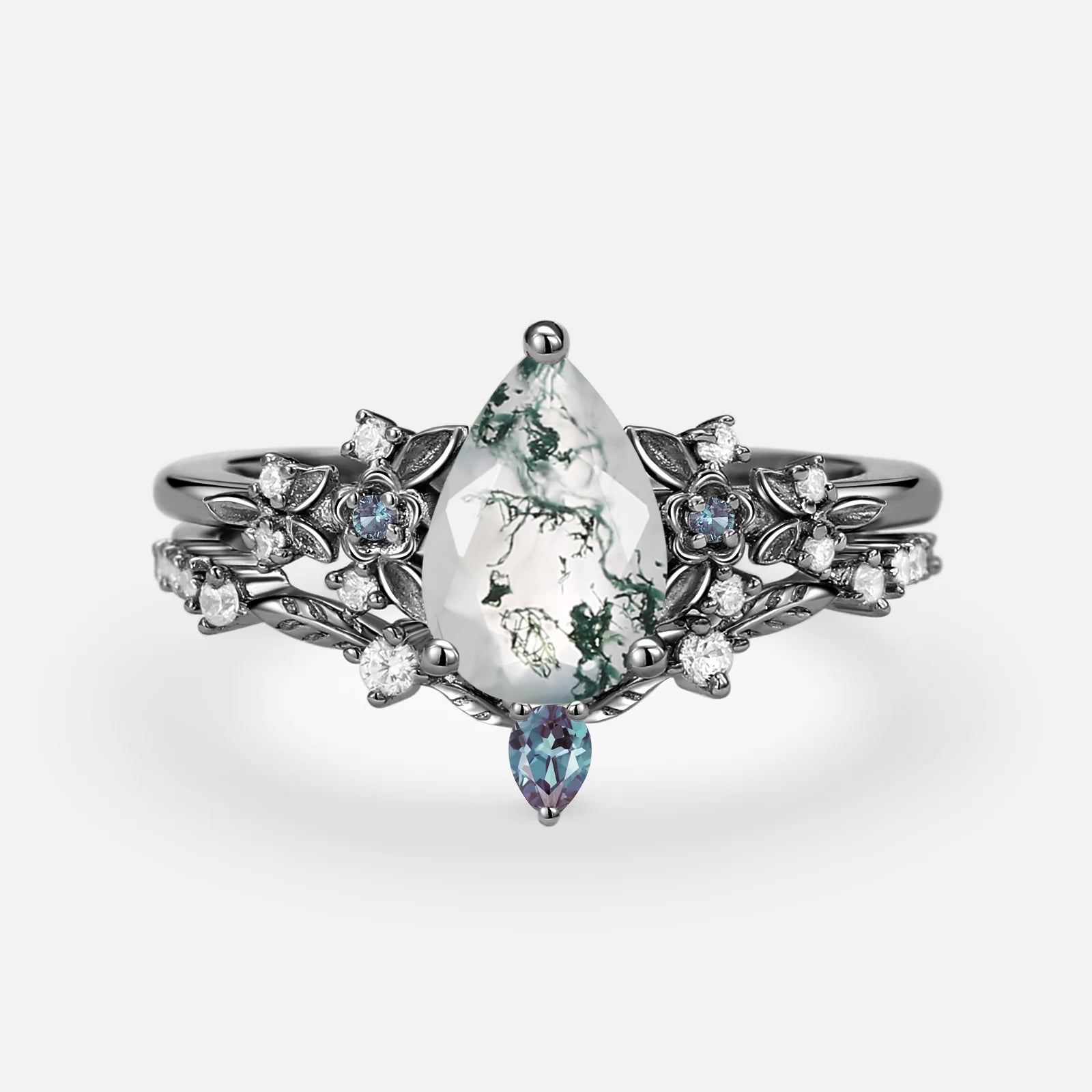 Pear Shaped Moss Agate Flower Bridal Ring Set 2pcs - Loretta