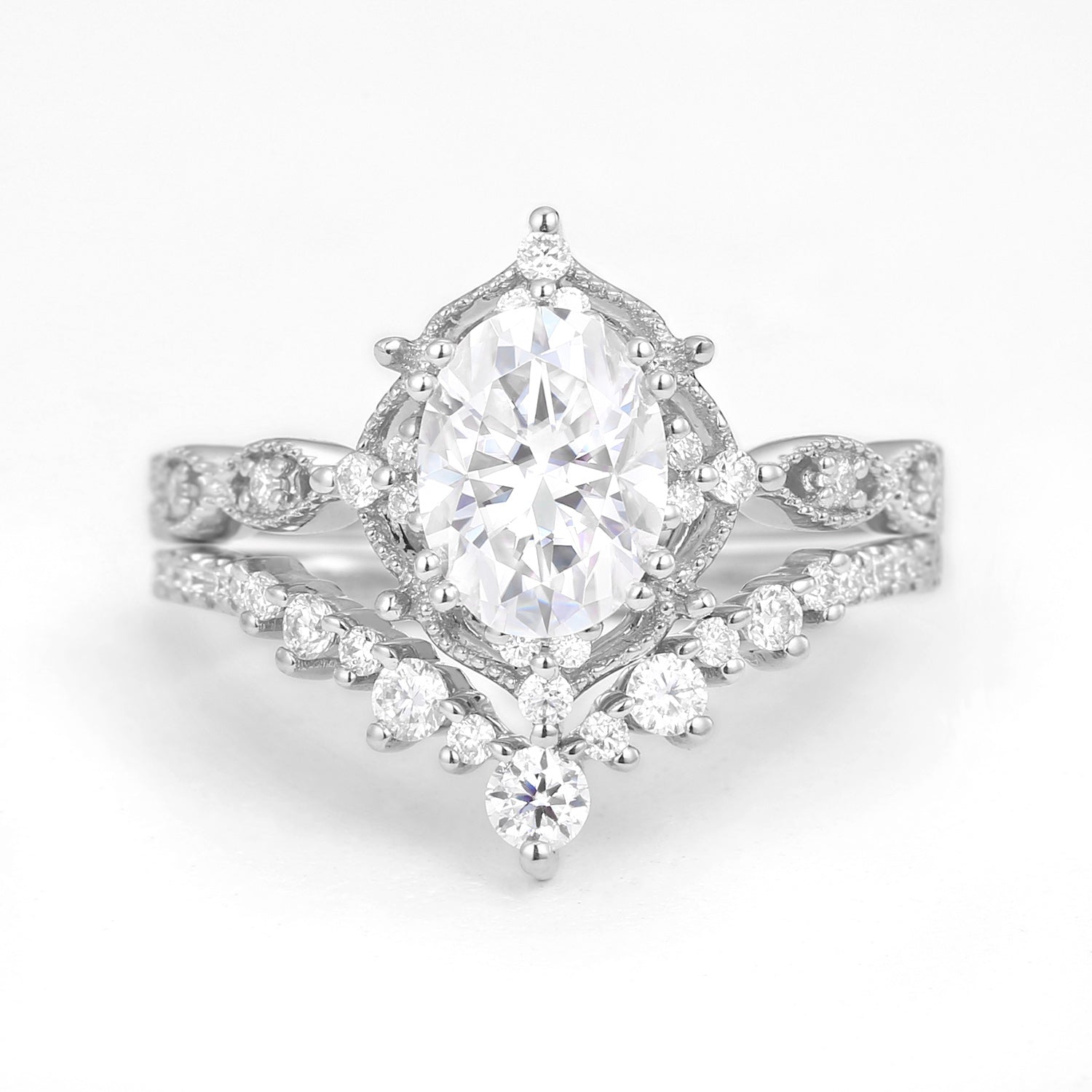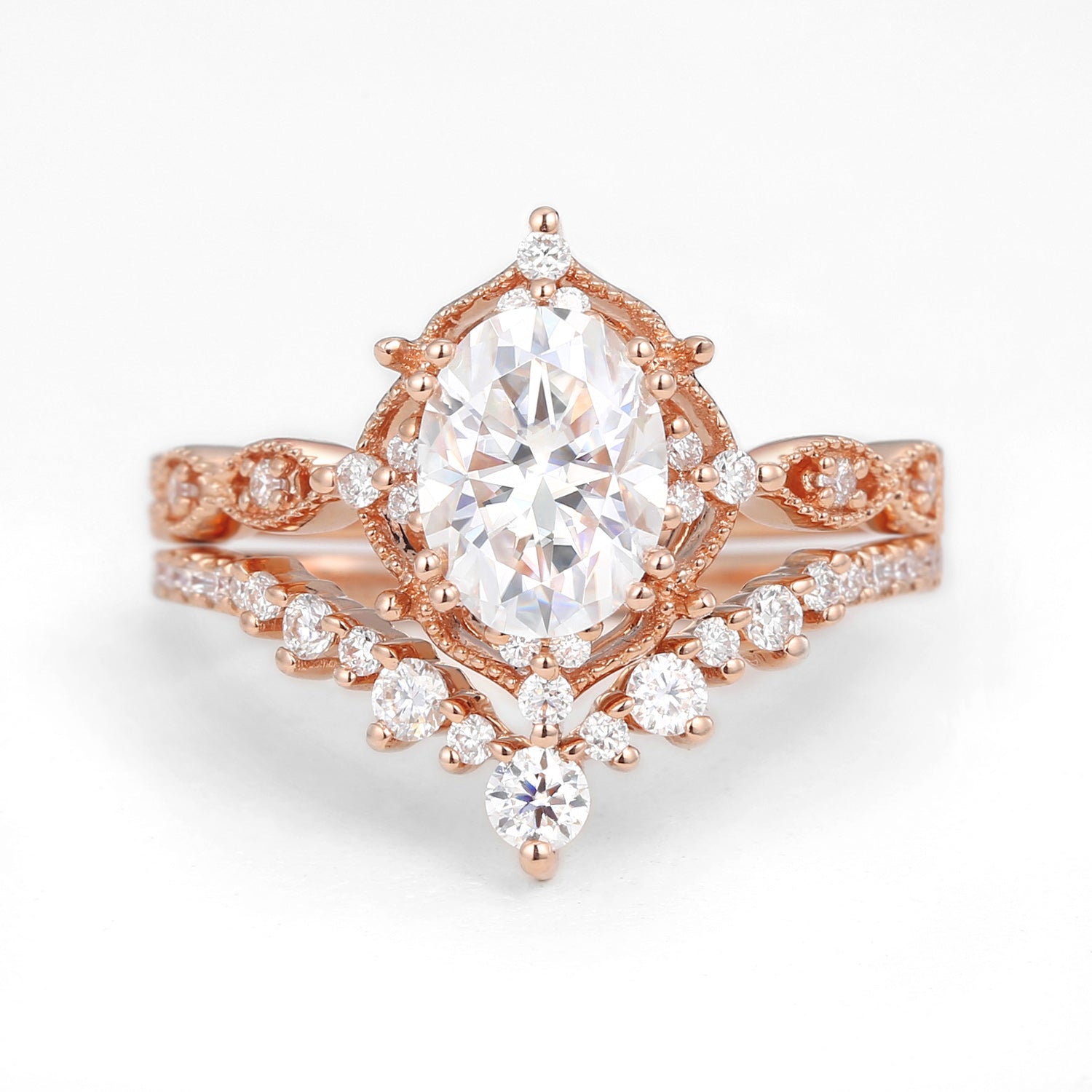 The ring set is our proudest and best-selling design by far. The beautifully crafted milgrain details and the moissanite accents truly serve the perfect amount of vintage vibes that are elegant and unique yet - not extra. A design that is suitable for every scene.