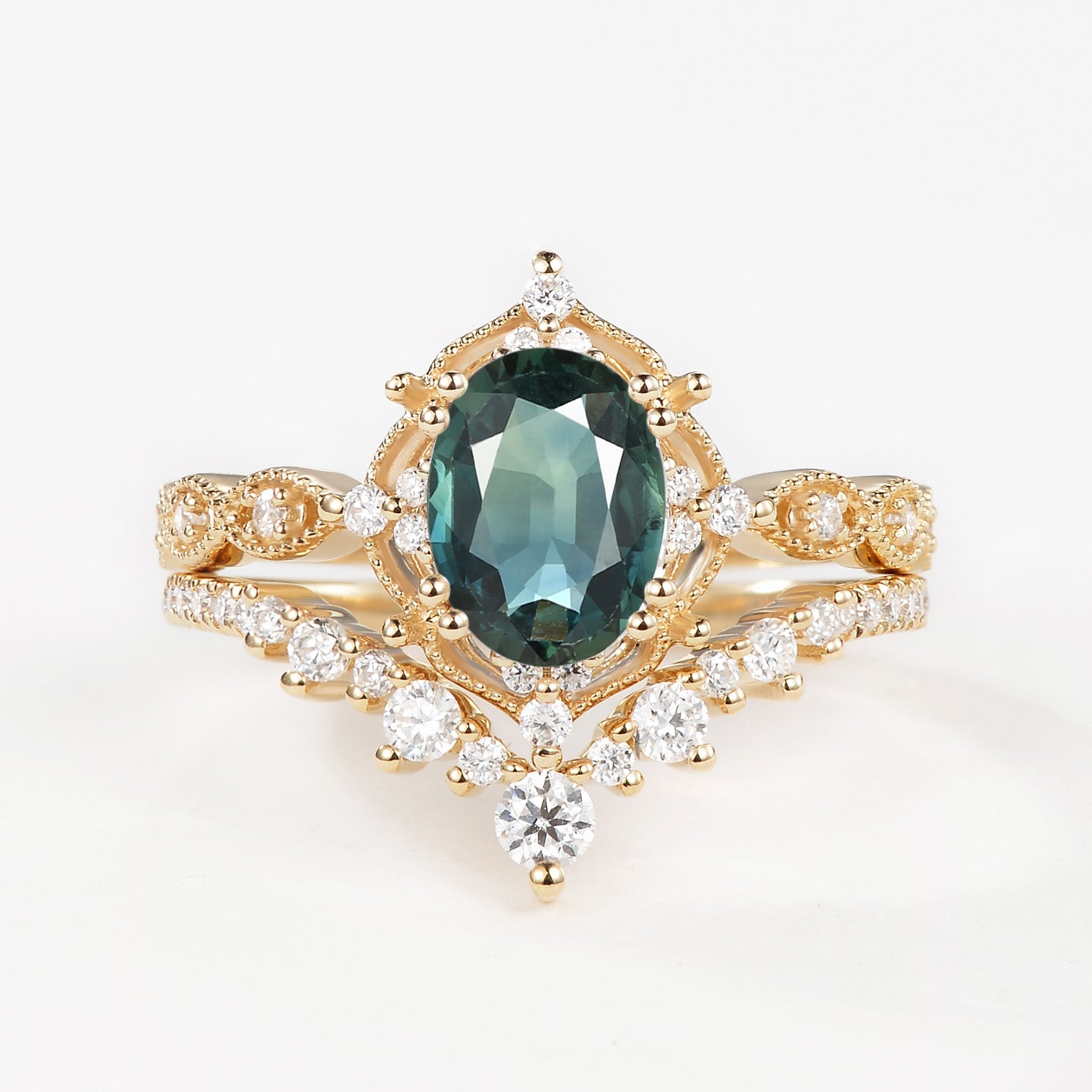 Signature Vintage - Oval Cut Teal Sapphire Vintage Ring Set 2pcs - Charlotte