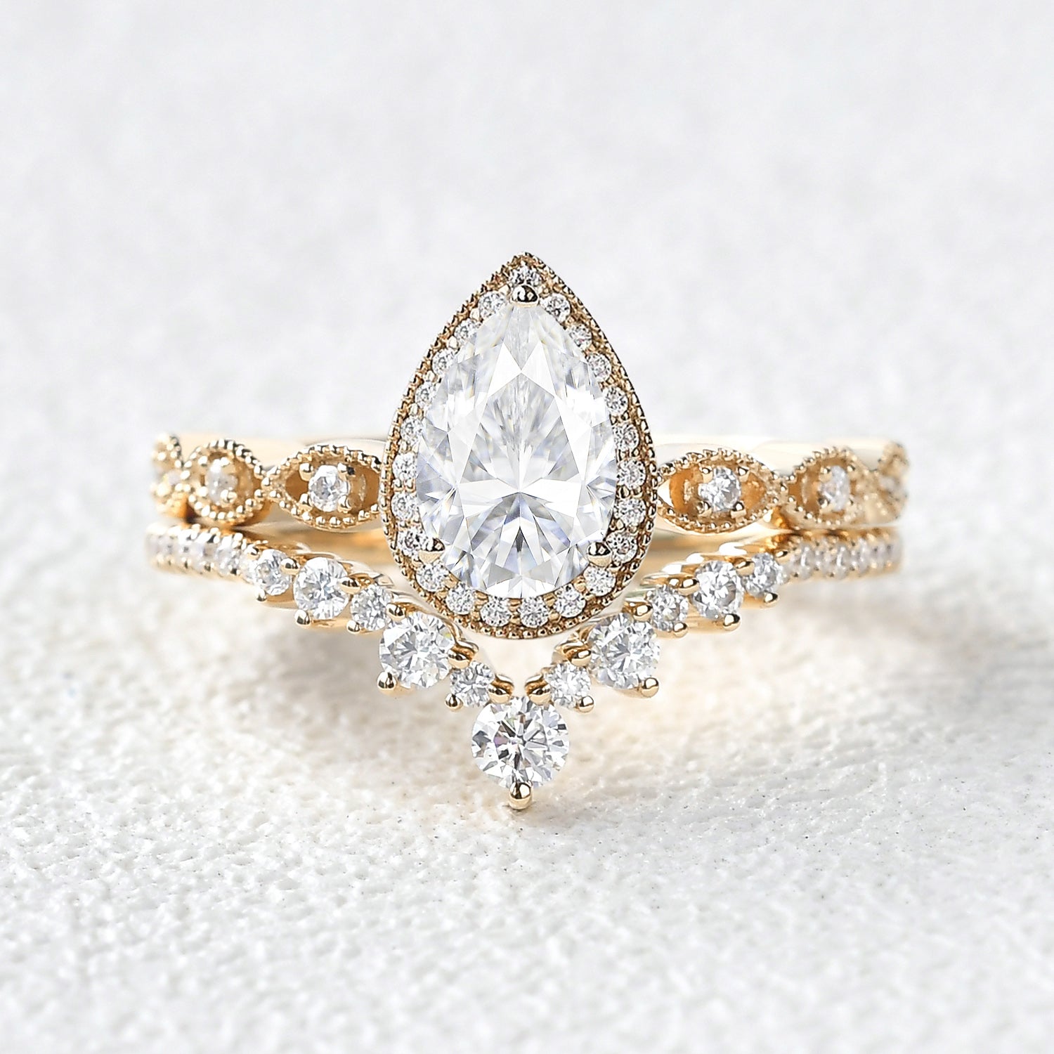 Vintage Pear Shaped Moissanite Yellow Gold Ring Set 2pcs