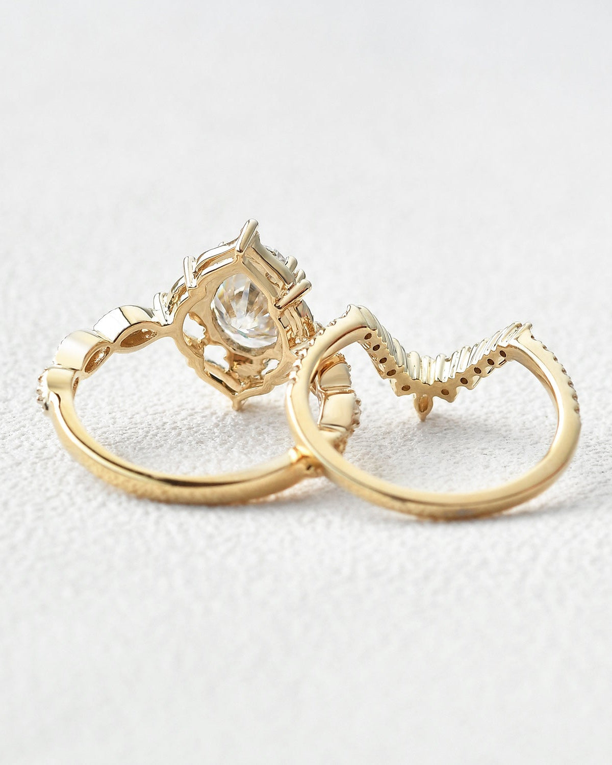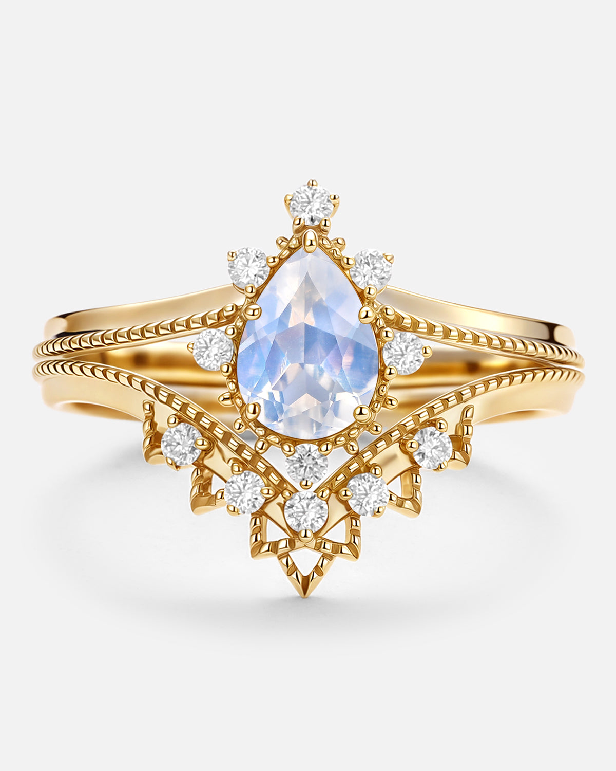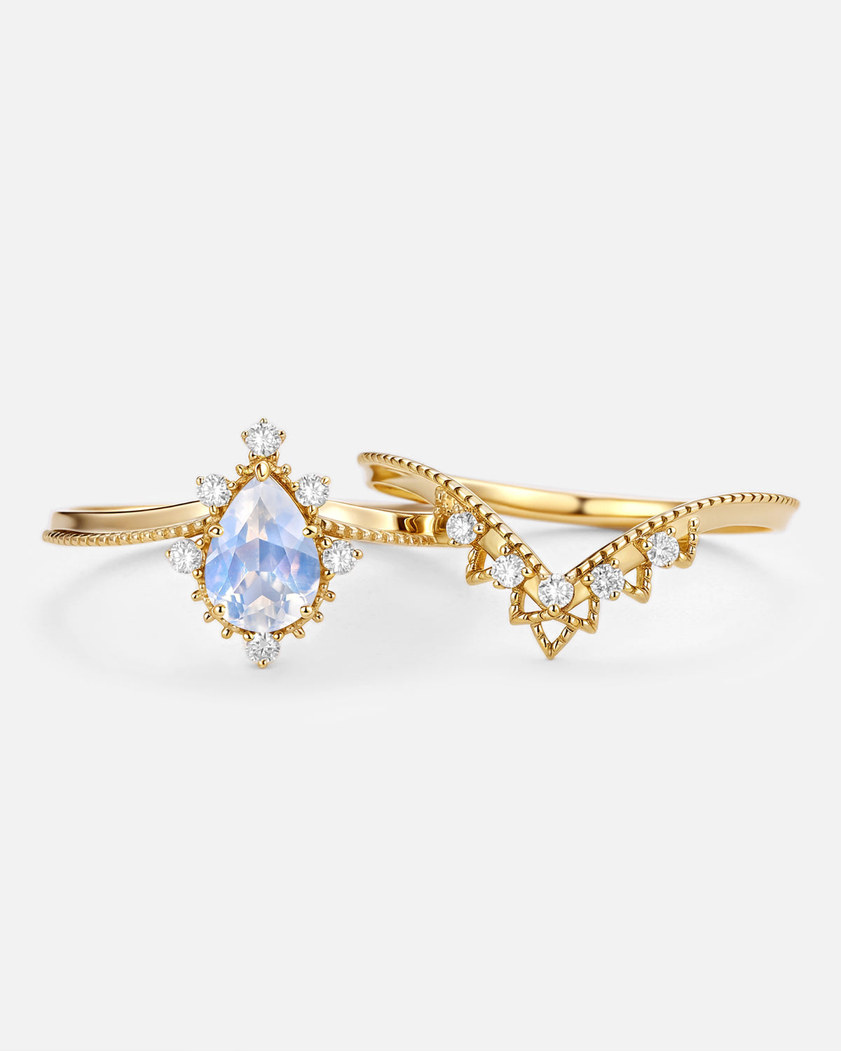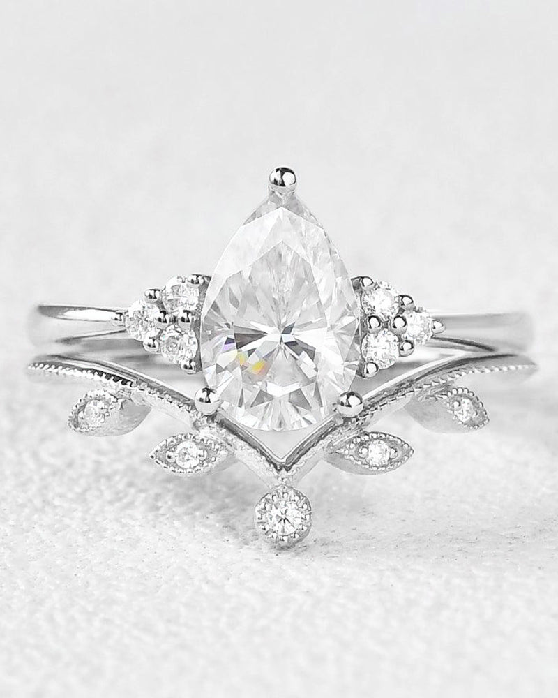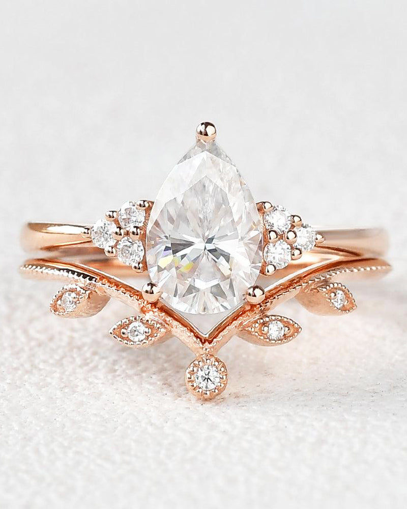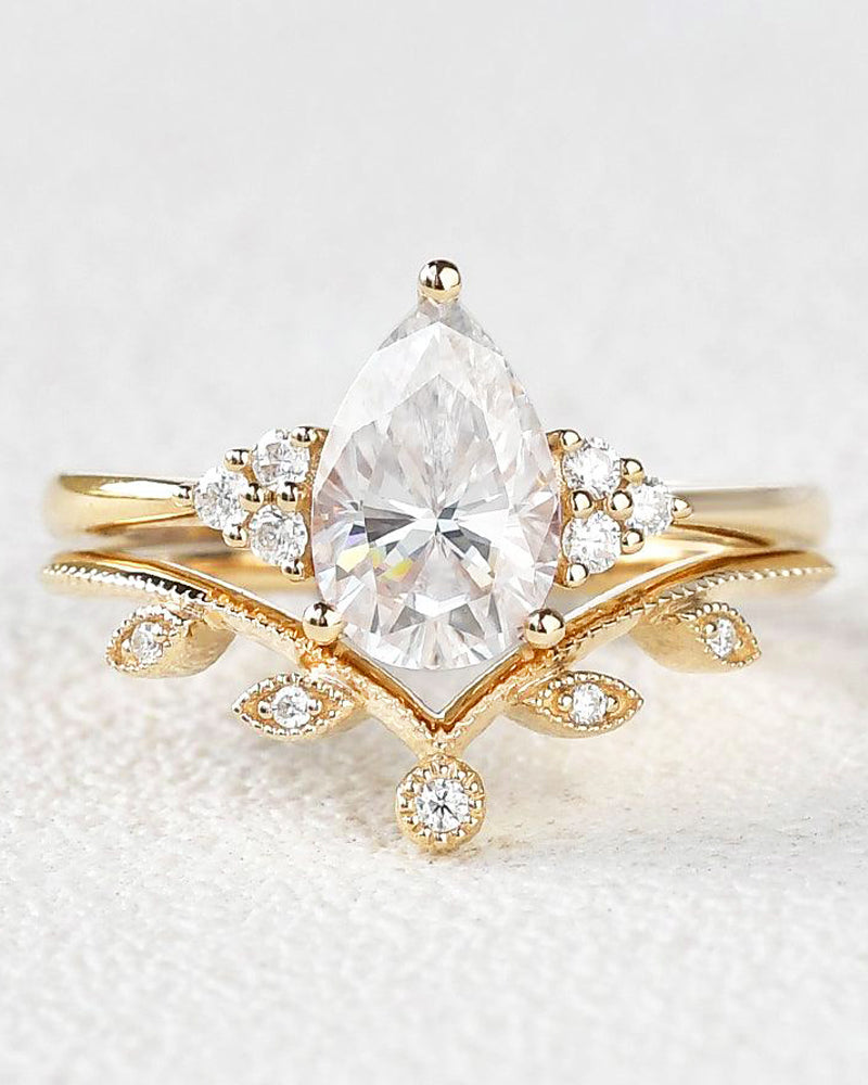The Vintage Rings collection brings together exquisite rings in a vintage style, adding romance and elegance to your special moments. Each pear ring in this collection has been carefully designed, showcasing the charm of tradition and classic beauty while incorporating modern elements. Our moissanite vintage ring set is one of the highlights of this collection. Featuring high-quality moissanite as the main stone, these rings exude captivating brilliance and shimmer, making your engagement ring truly unique and eye-catching.