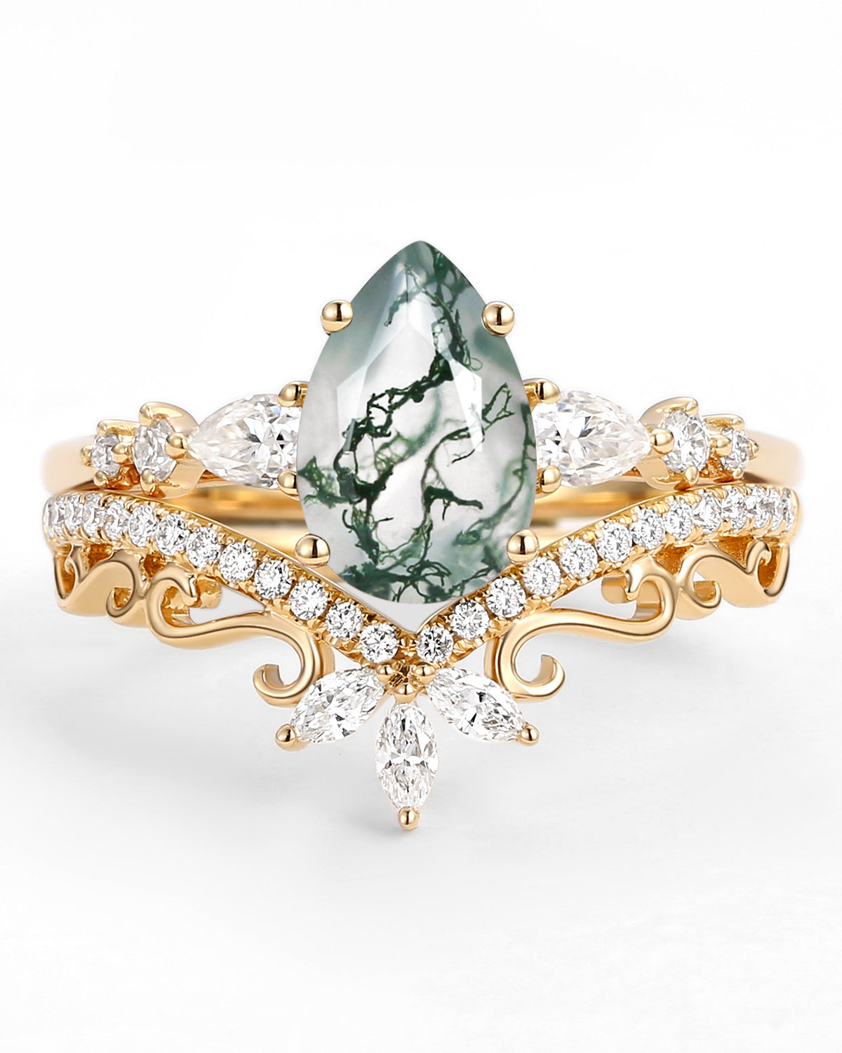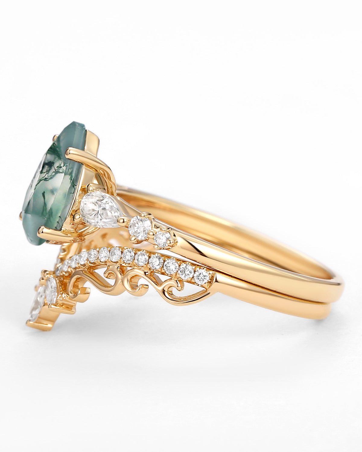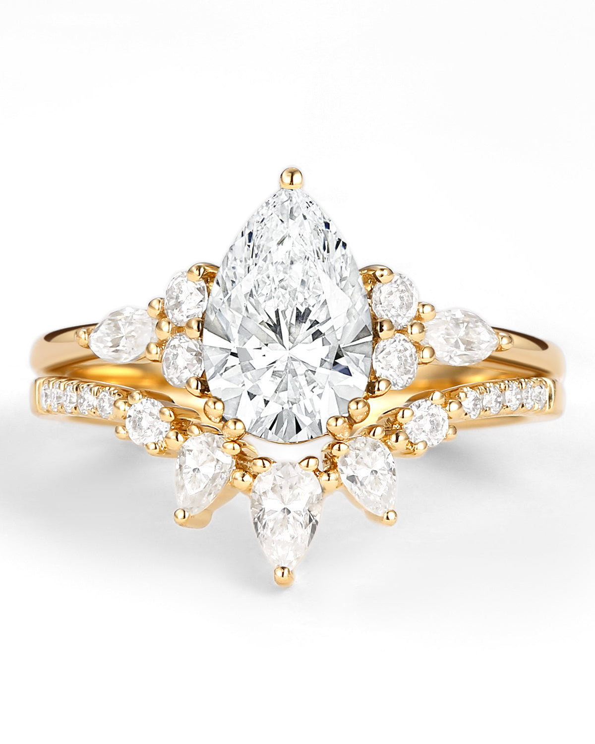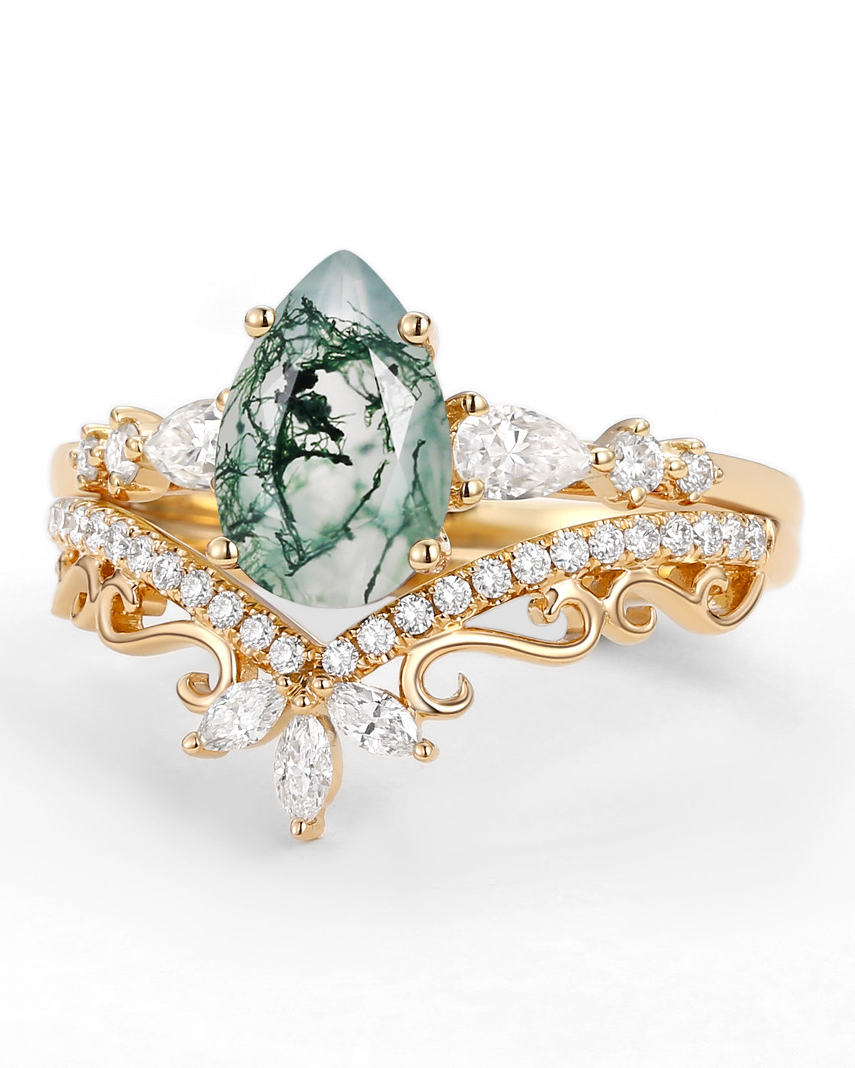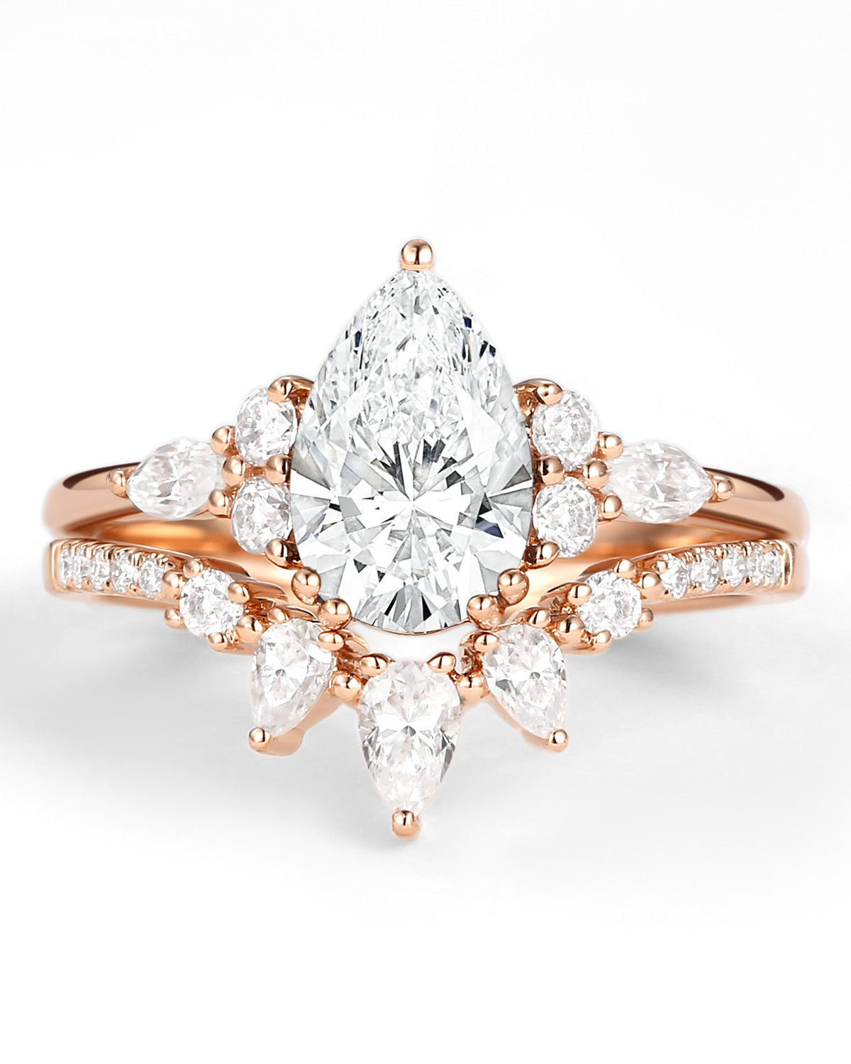 The Vintage Rings collection brings together exquisite rings in a vintage style, adding romance and elegance to your special moments. Each pear ring in this collection has been carefully designed, showcasing the charm of tradition and classic beauty while incorporating modern elements. Our moissanite vintage ring set is one of the highlights of this collection. Featuring high-quality moissanite as the main stone, these rings exude captivating brilliance and shimmer, making your engagement ring truly unique and eye-catching.
