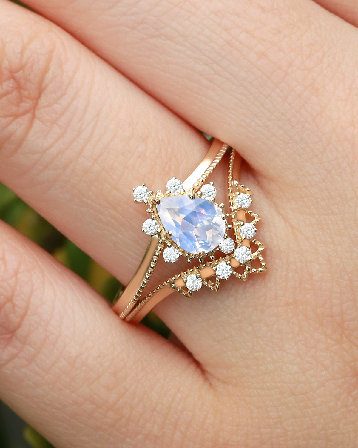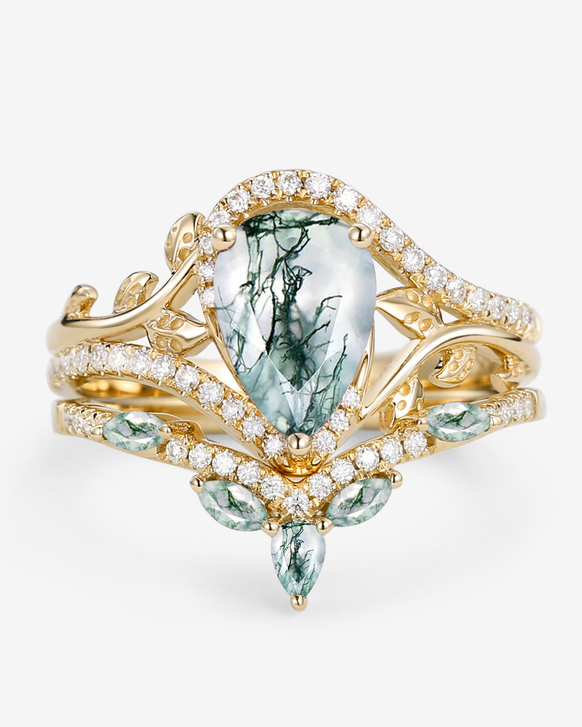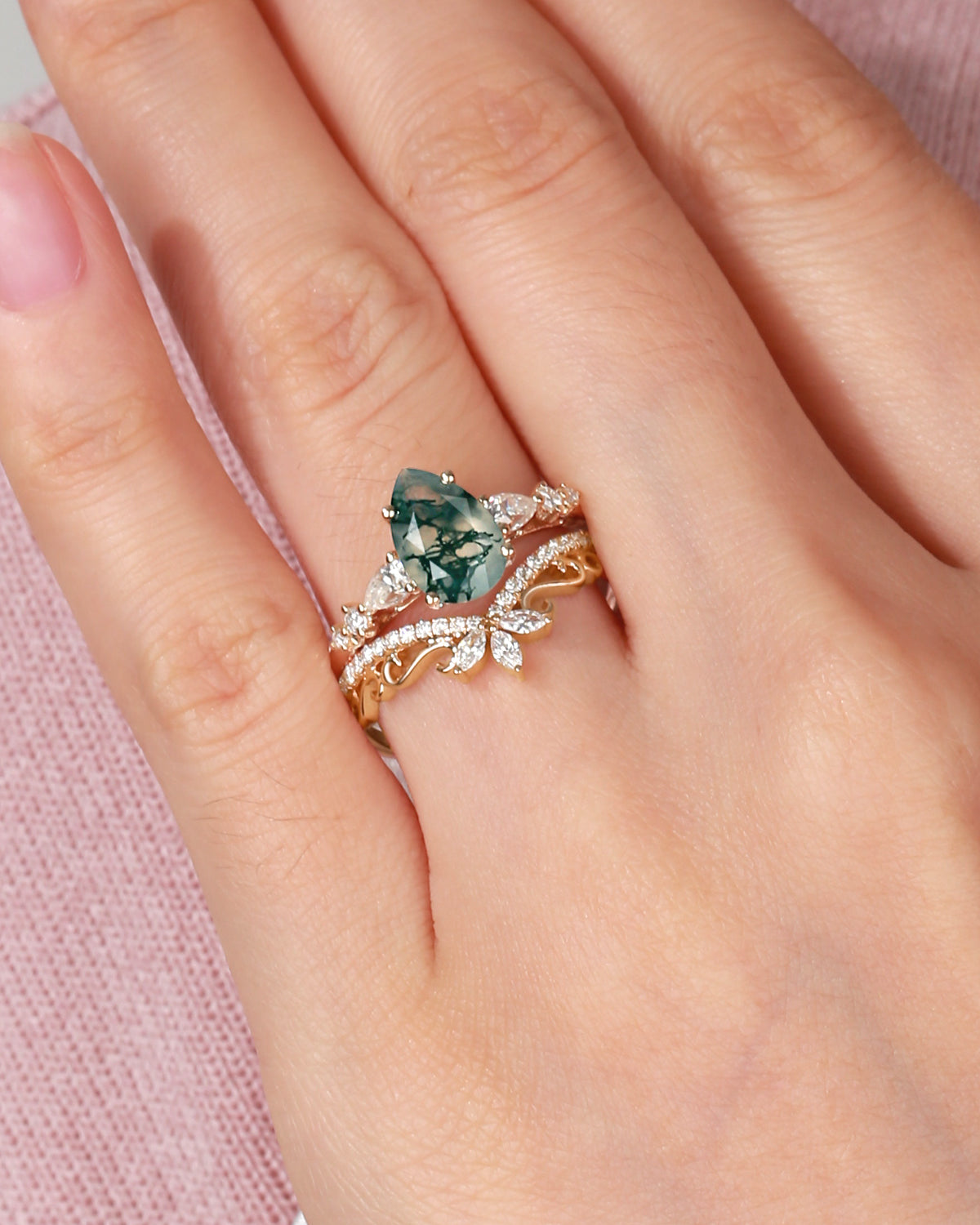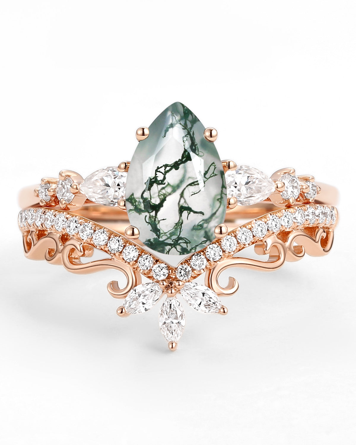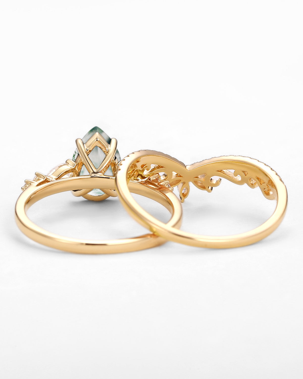 The Vintage Rings collection brings together exquisite rings in a vintage style, adding romance and elegance to your special moments. Each pear ring in this collection has been carefully designed, showcasing the charm of tradition and classic beauty while incorporating modern elements. Our moissanite vintage ring set is one of the highlights of this collection. Featuring high-quality moissanite as the main stone, these rings exude captivating brilliance and shimmer, making your engagement ring truly unique and eye-catching.