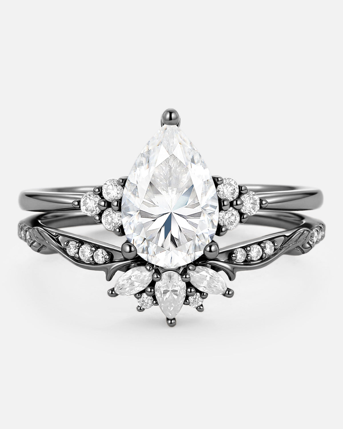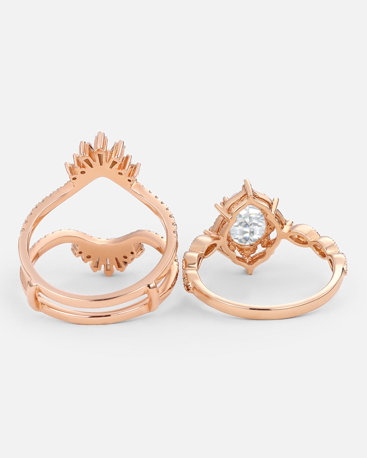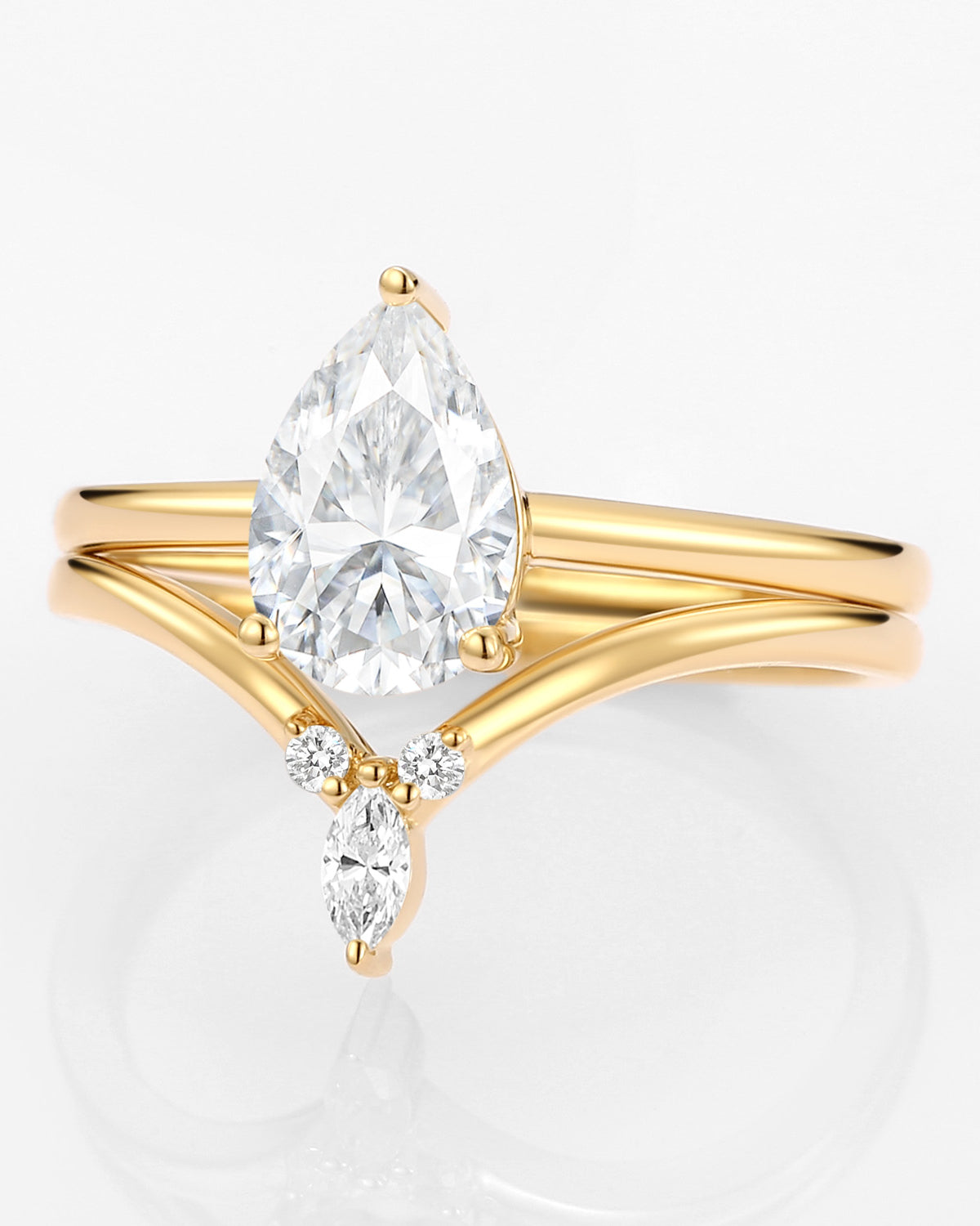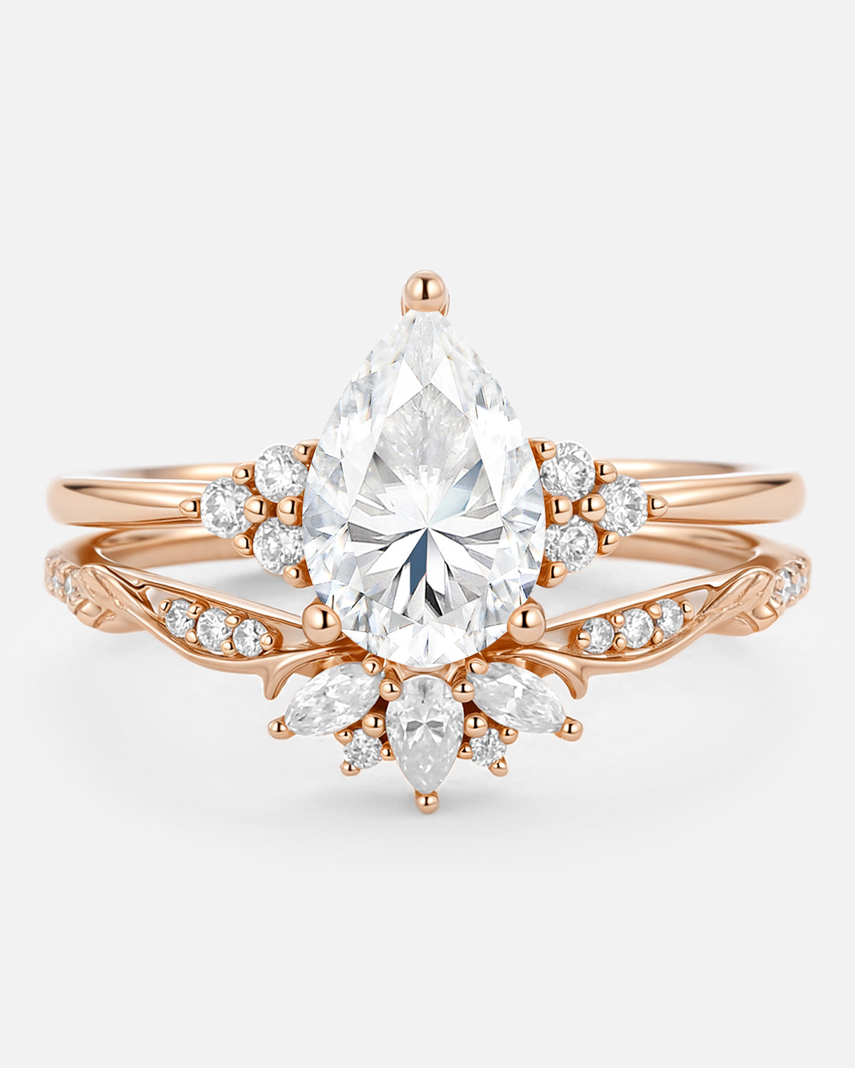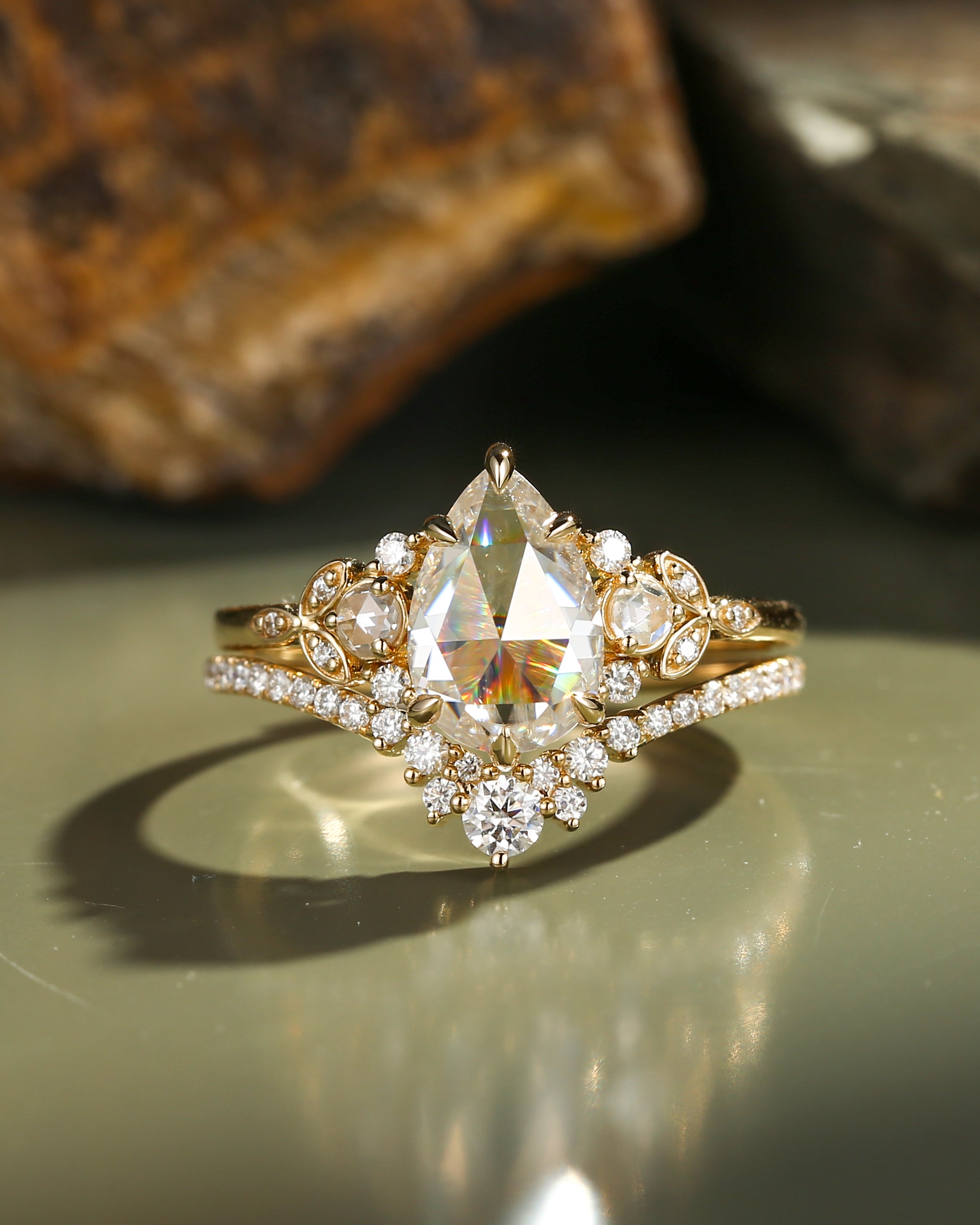 The Vintage Rings collection brings together exquisite rings in a vintage style, adding romance and elegance to your special moments. Each pear ring in this collection has been carefully designed, showcasing the charm of tradition and classic beauty while incorporating modern elements. Our moissanite vintage ring set is one of the highlights of this collection. Featuring high-quality moissanite as the main stone, these rings exude captivating brilliance and shimmer, making your engagement ring truly unique and eye-catching.