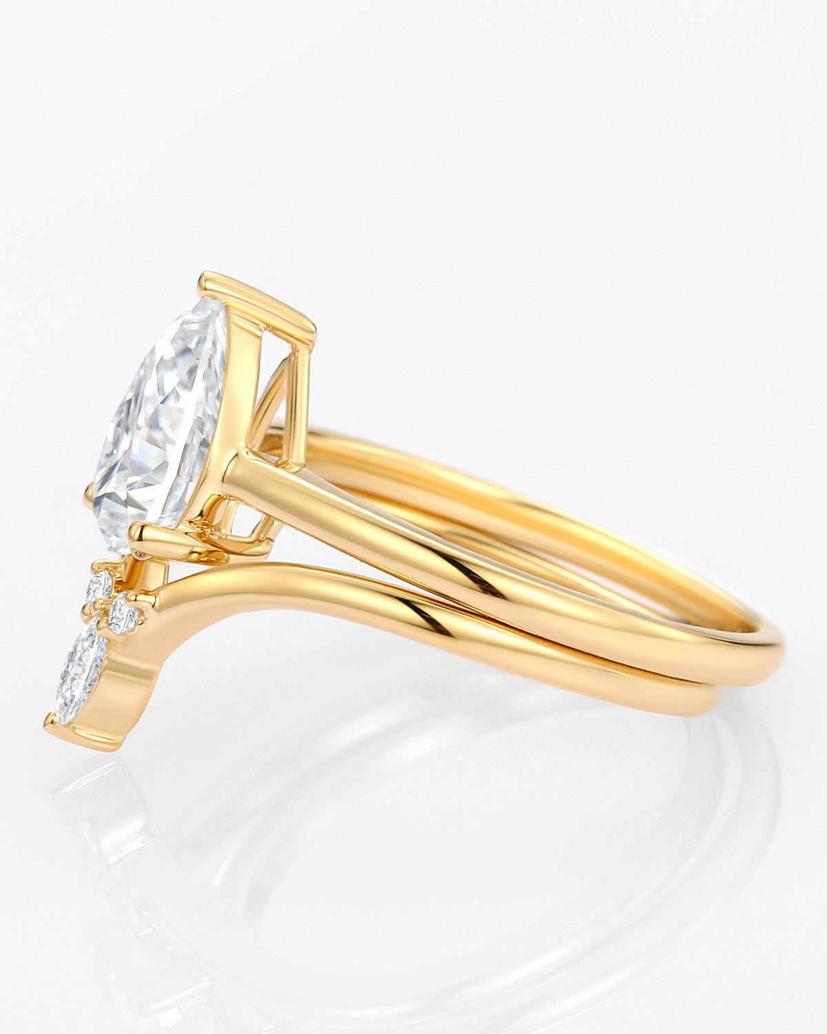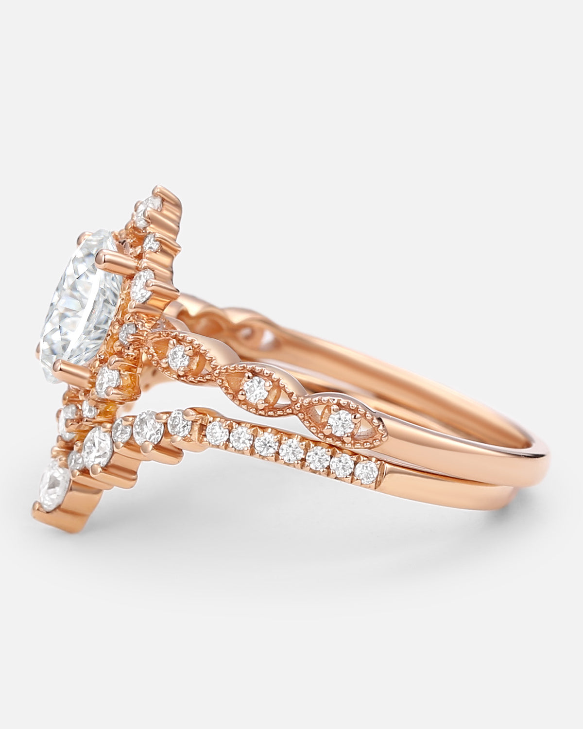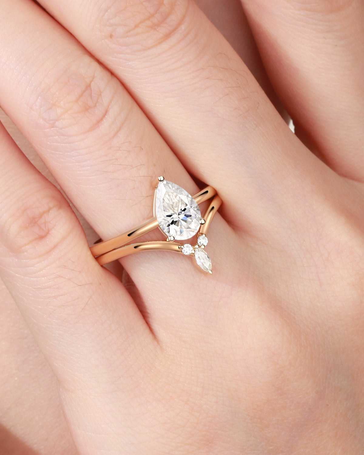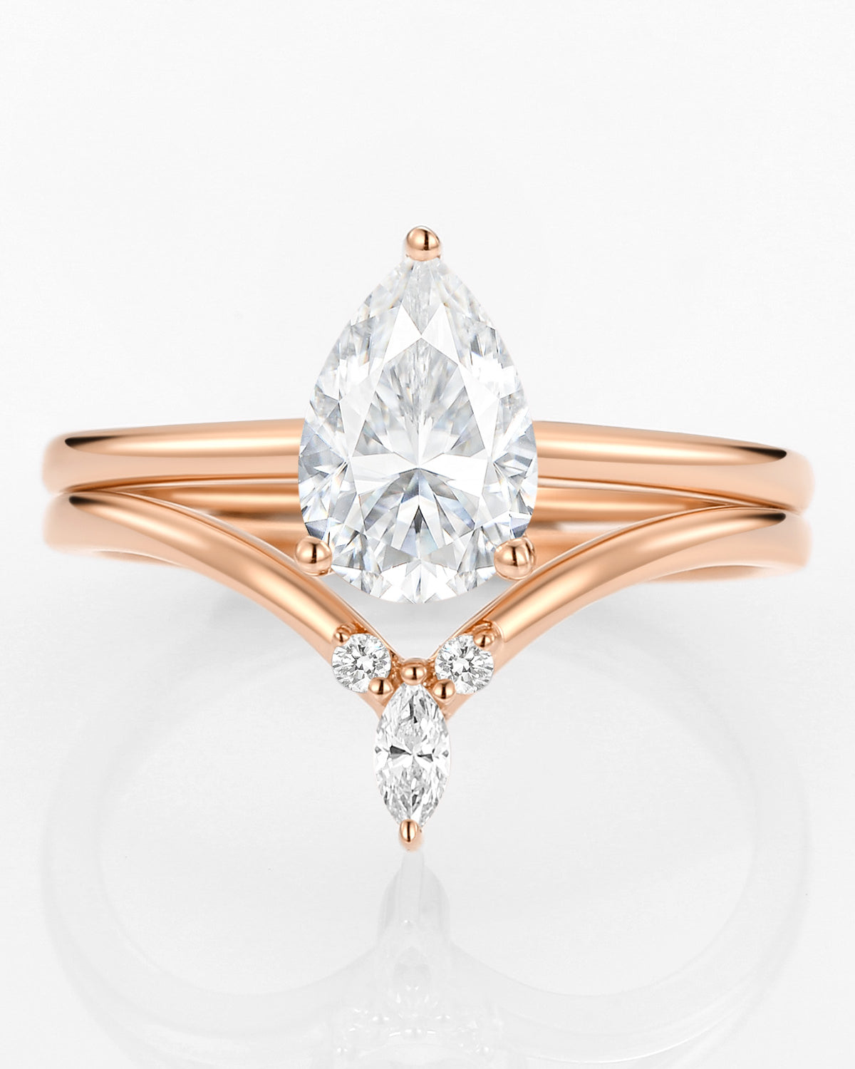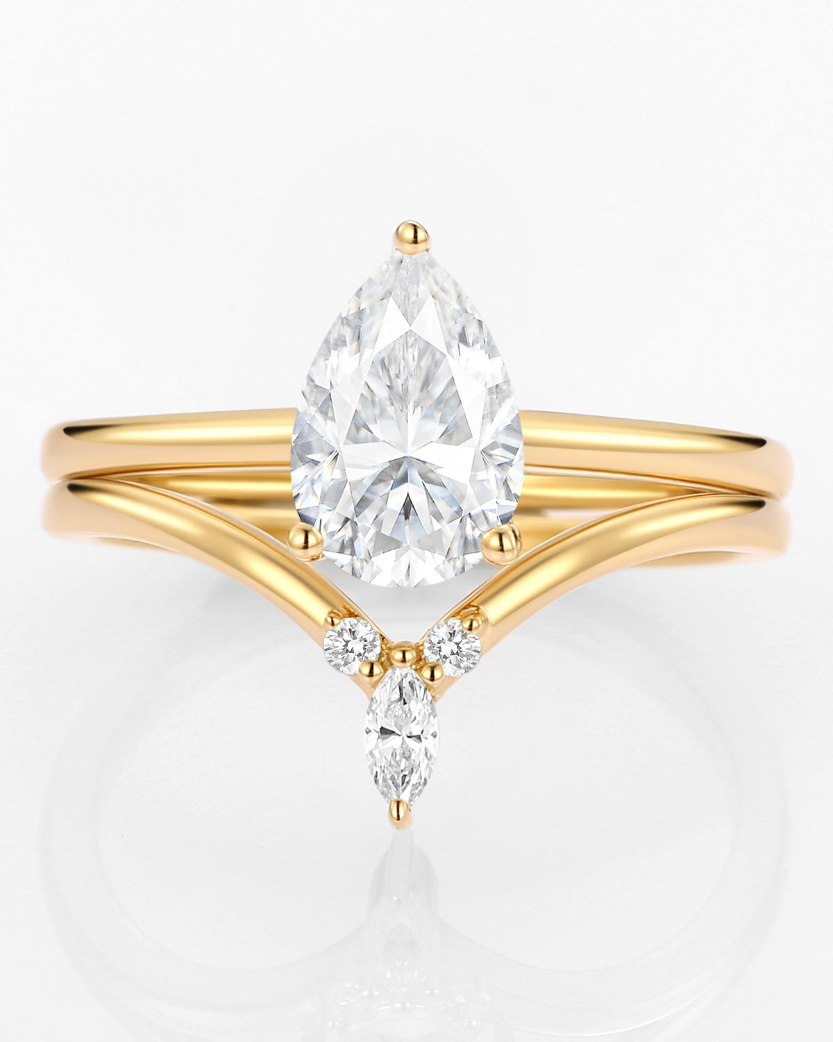 The Vintage Rings collection brings together exquisite rings in a vintage style, adding romance and elegance to your special moments. Each pear ring in this collection has been carefully designed, showcasing the charm of tradition and classic beauty while incorporating modern elements. Our moissanite vintage ring set is one of the highlights of this collection. Featuring high-quality moissanite as the main stone, these rings exude captivating brilliance and shimmer, making your engagement ring truly unique and eye-catching.