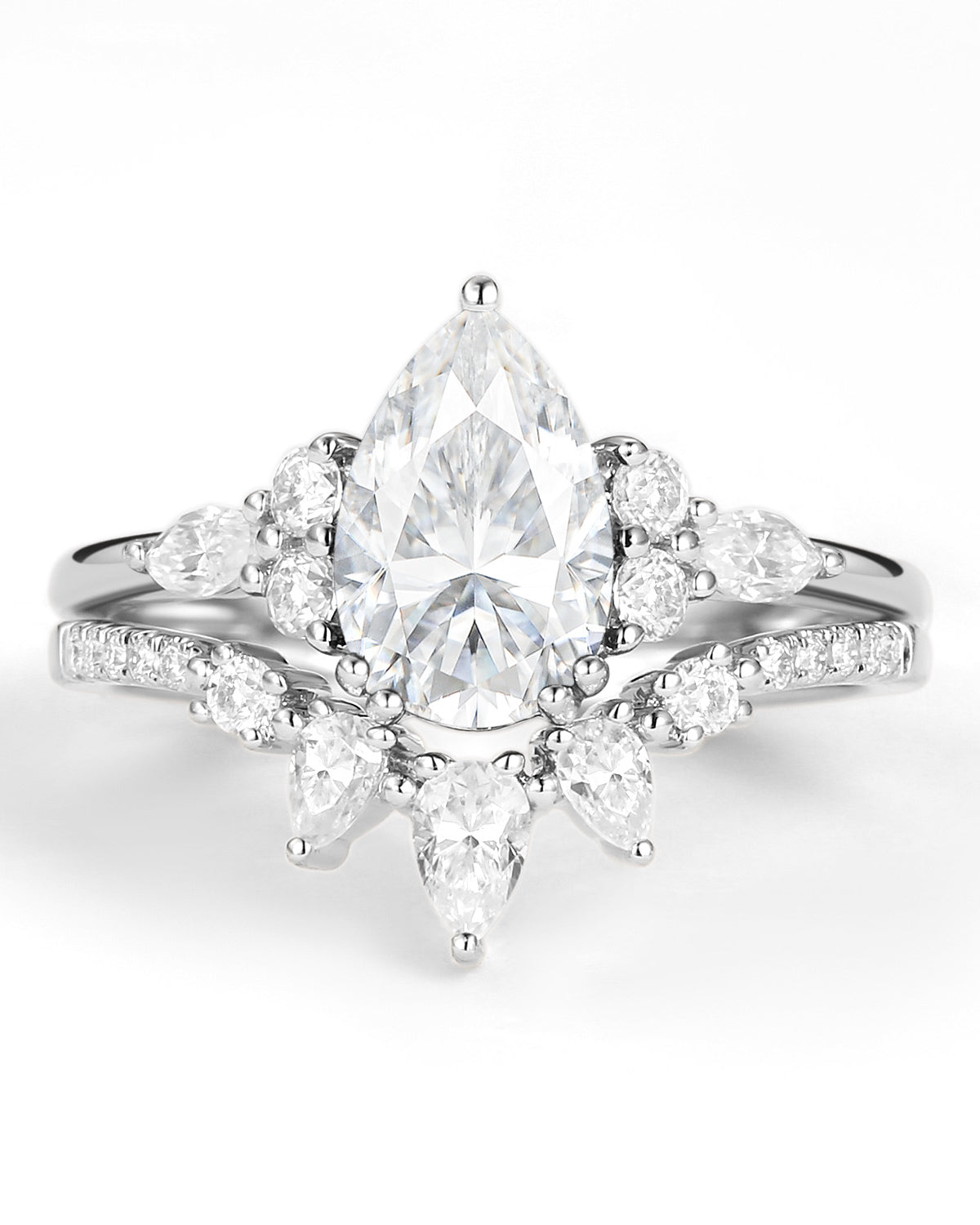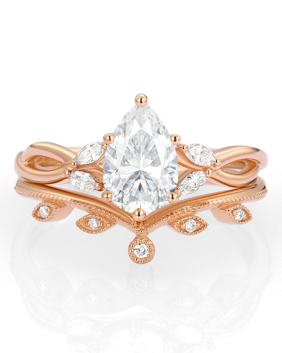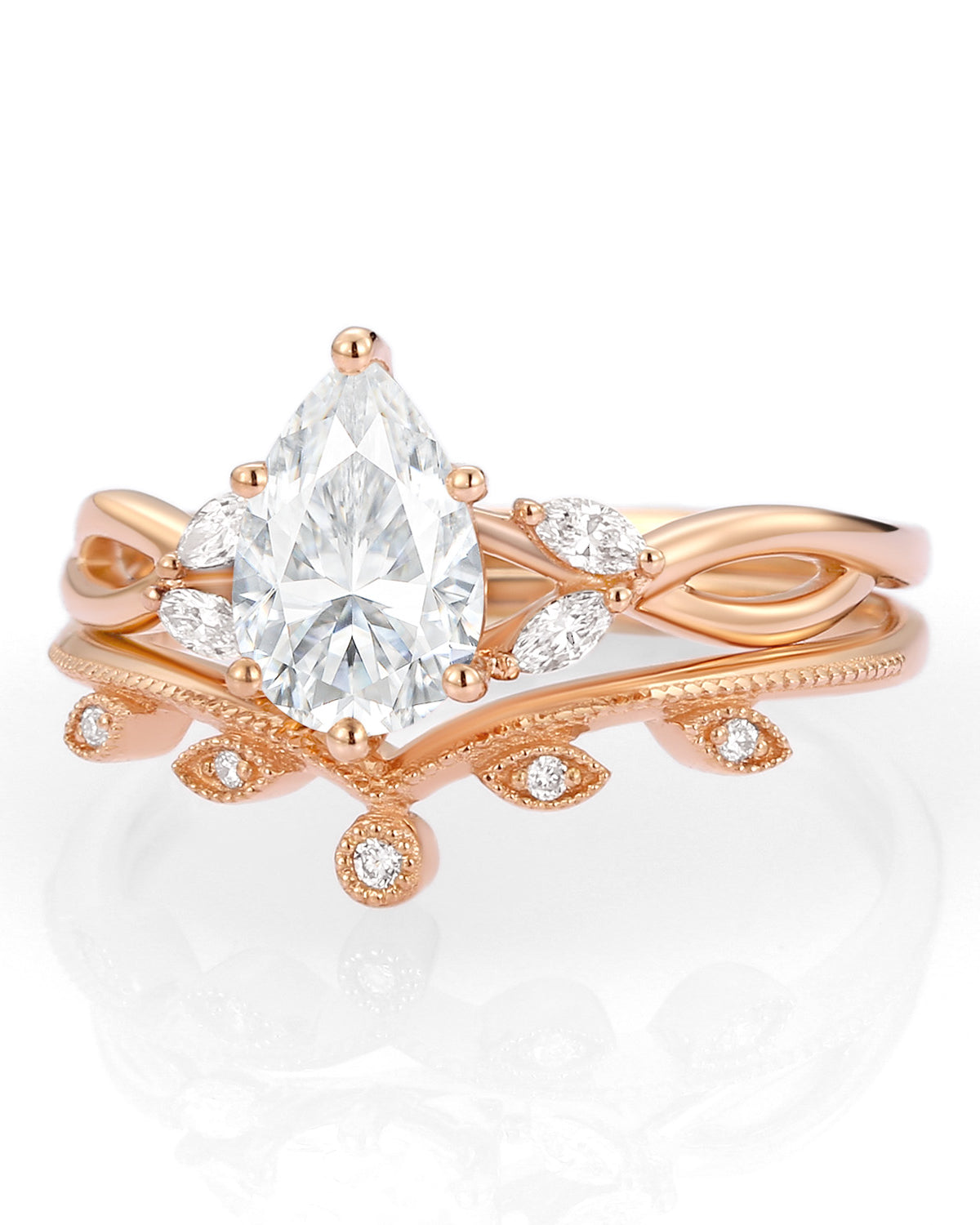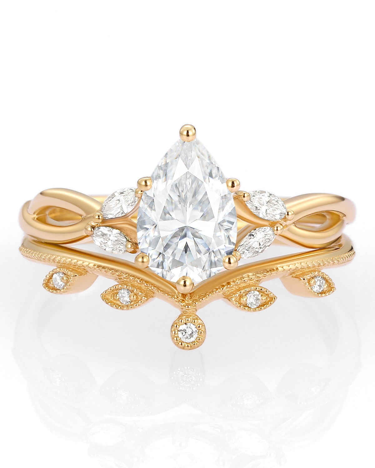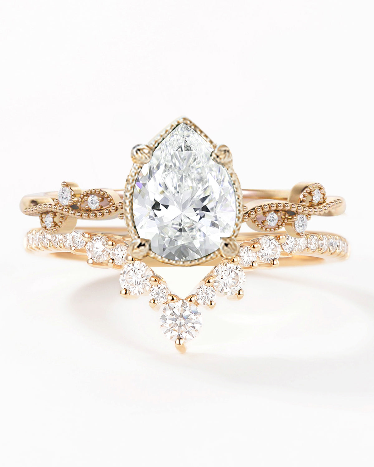 The Vintage Rings collection brings together exquisite rings in a vintage style, adding romance and elegance to your special moments. Each pear ring in this collection has been carefully designed, showcasing the charm of tradition and classic beauty while incorporating modern elements. Our moissanite vintage ring set is one of the highlights of this collection. Featuring high-quality moissanite as the main stone, these rings exude captivating brilliance and shimmer, making your engagement ring truly unique and eye-catching.