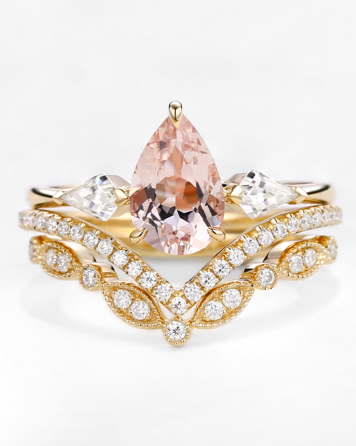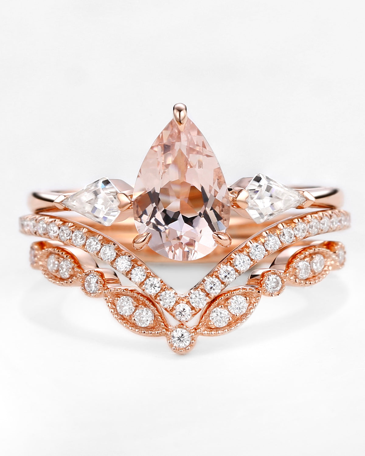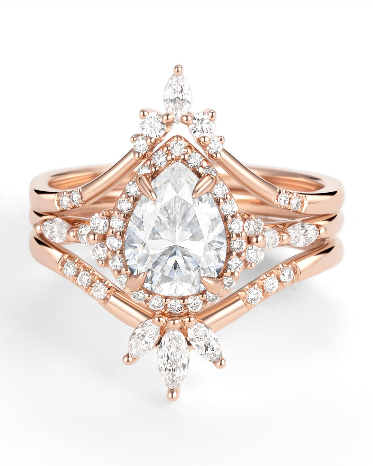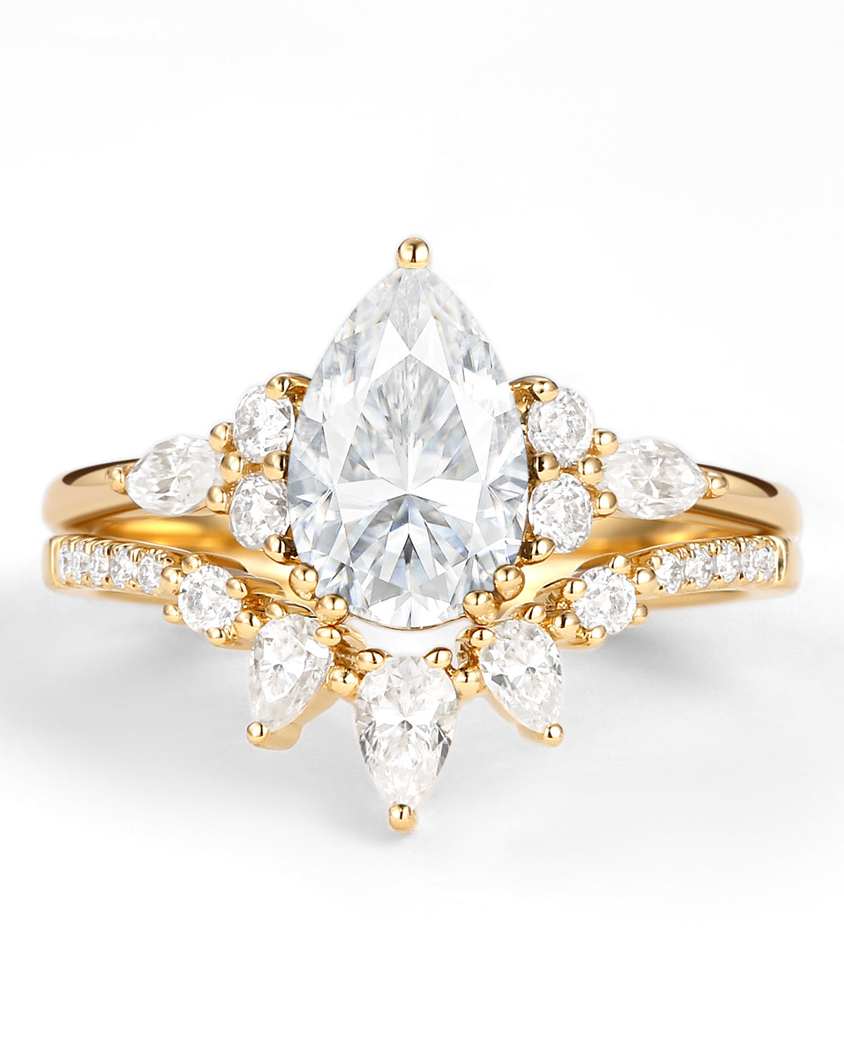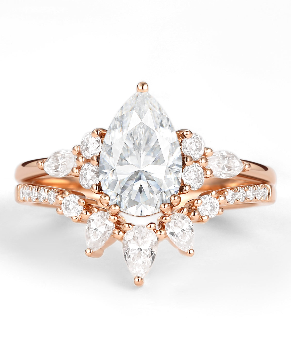 The Vintage Rings collection brings together exquisite rings in a vintage style, adding romance and elegance to your special moments. Each pear ring in this collection has been carefully designed, showcasing the charm of tradition and classic beauty while incorporating modern elements. Our moissanite vintage ring set is one of the highlights of this collection. Featuring high-quality moissanite as the main stone, these rings exude captivating brilliance and shimmer, making your engagement ring truly unique and eye-catching.