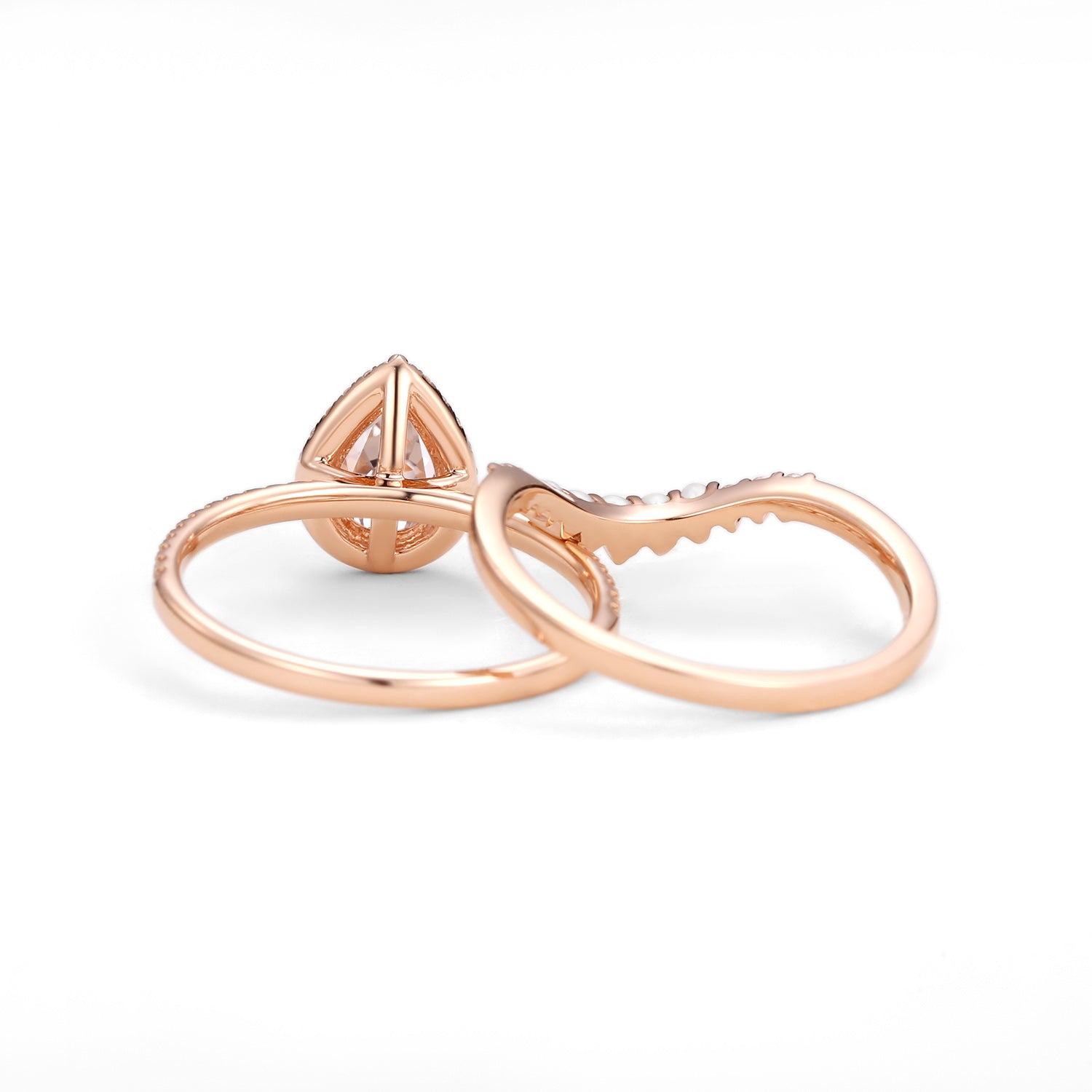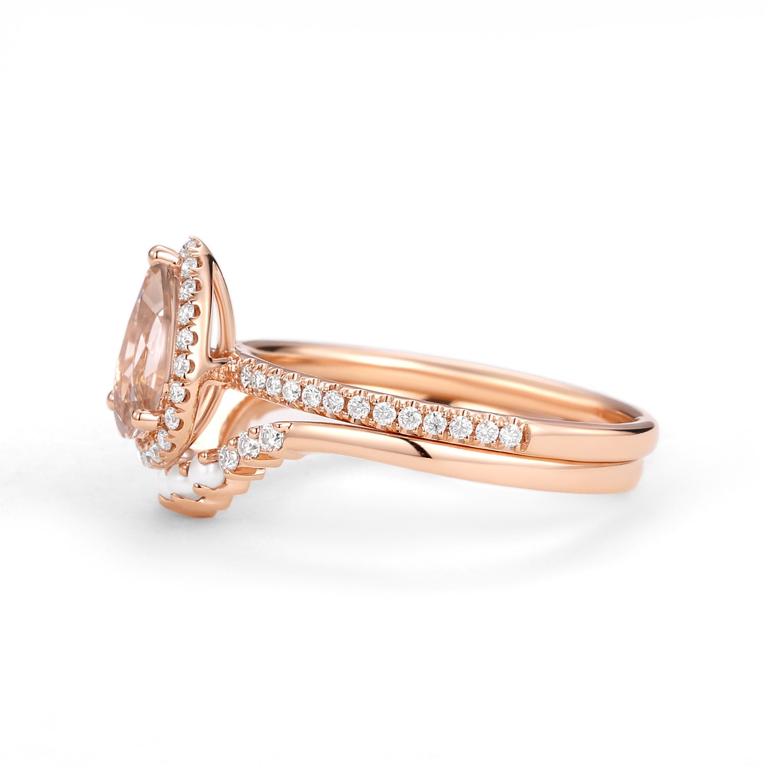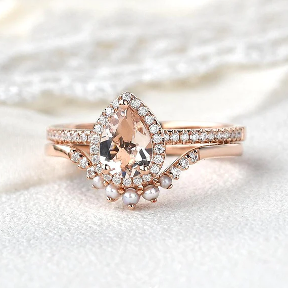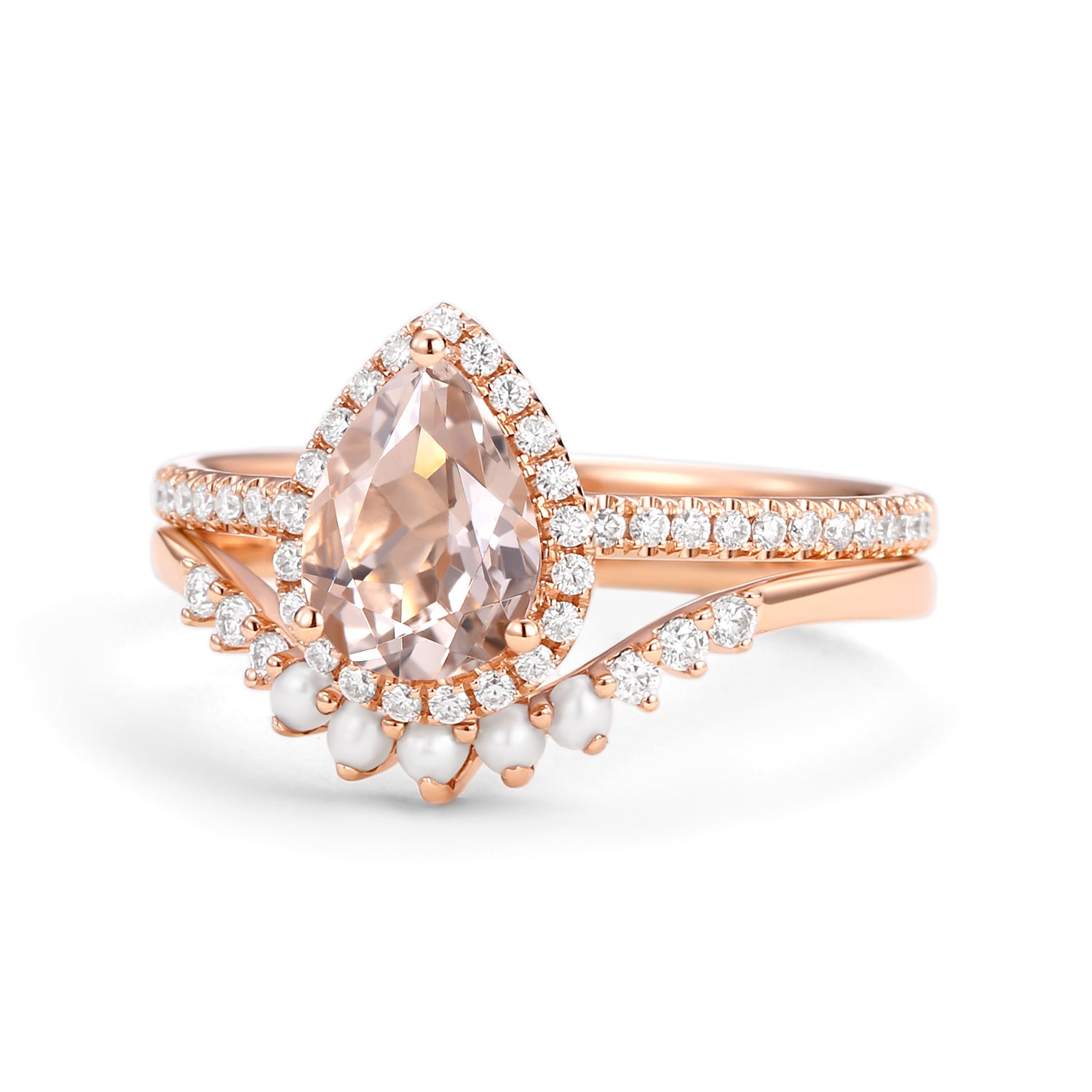 1.5ct Pear Morganite Pearl-fect Classic Halo Ring Set 2pcs