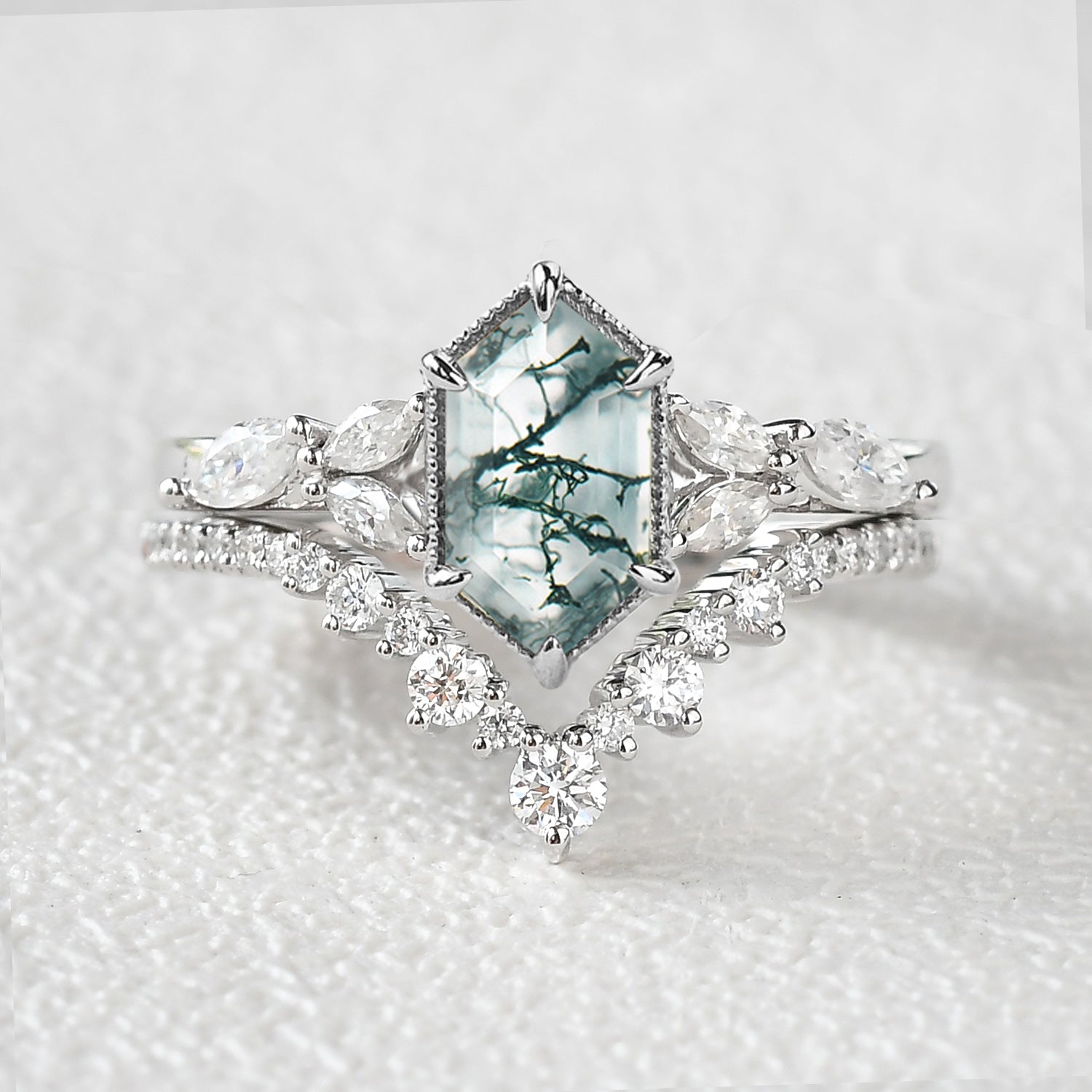 Long Hexagon Moss Agate Cluster Engagement Ring Set 2pcs