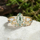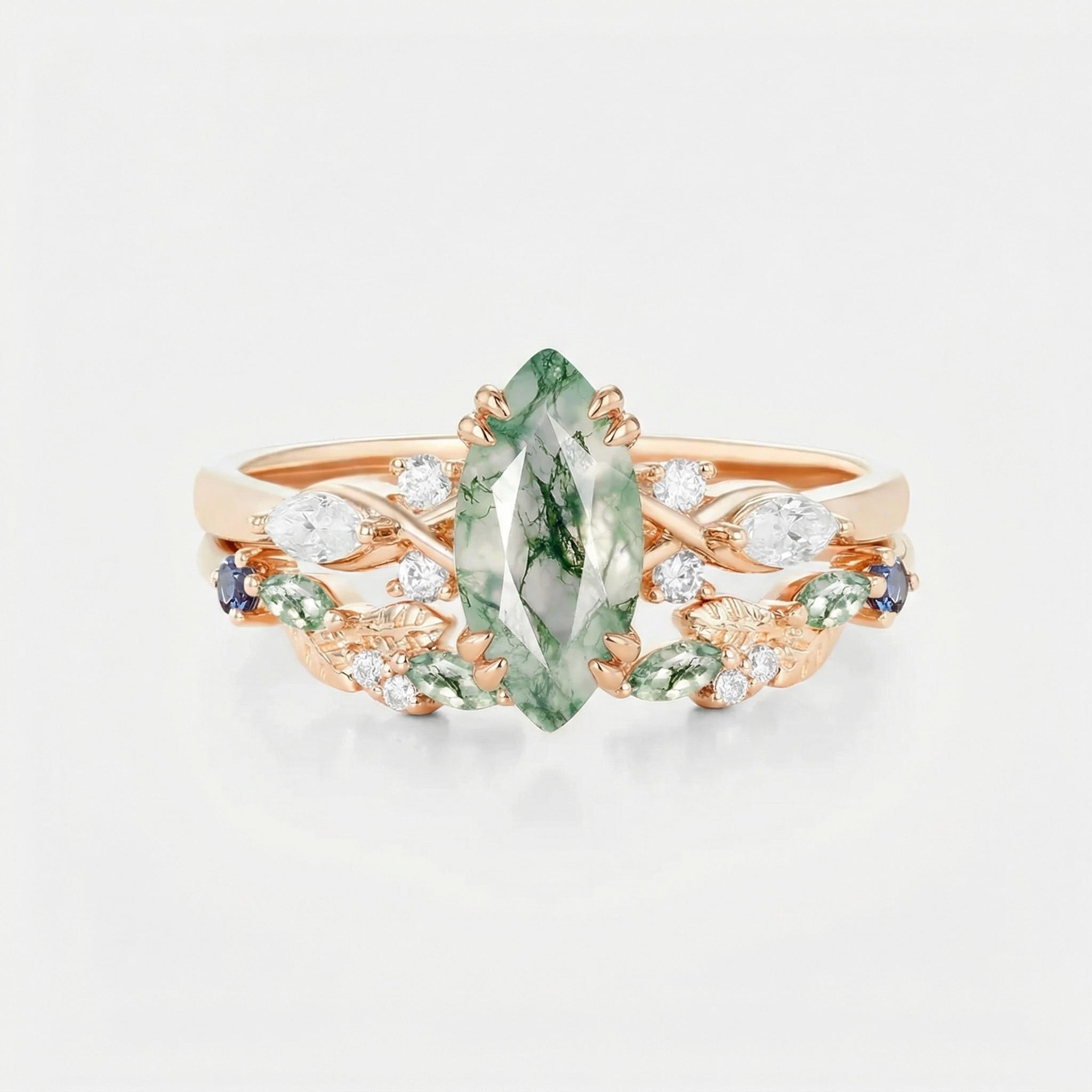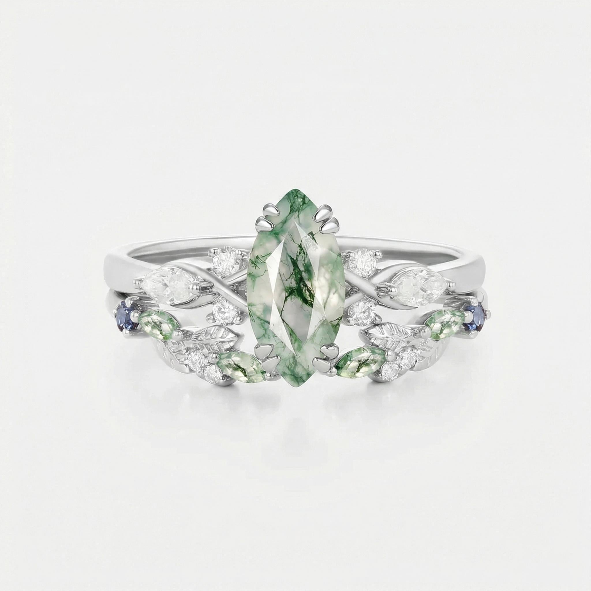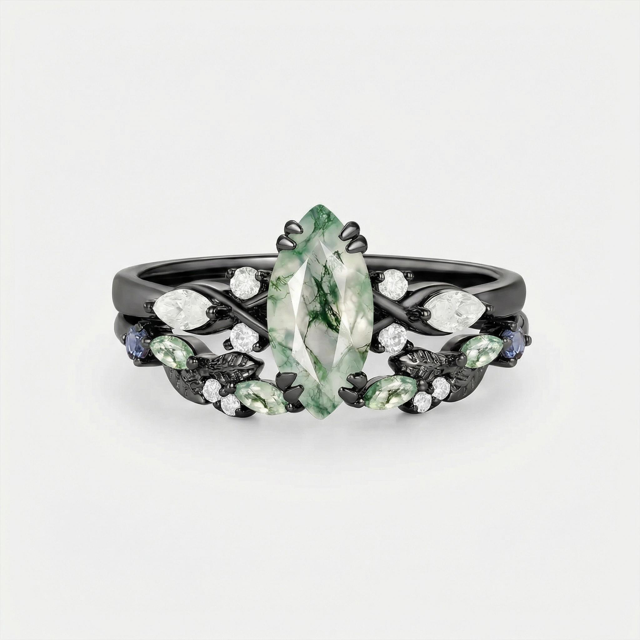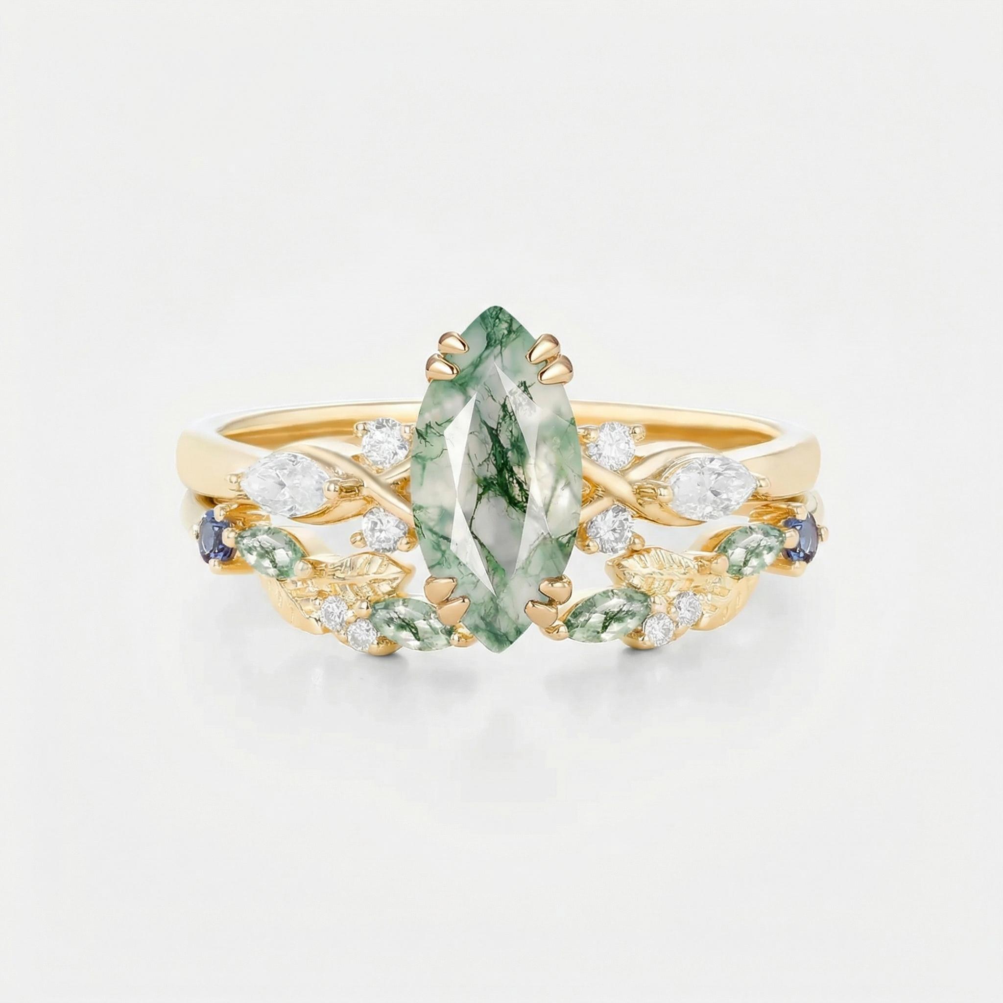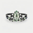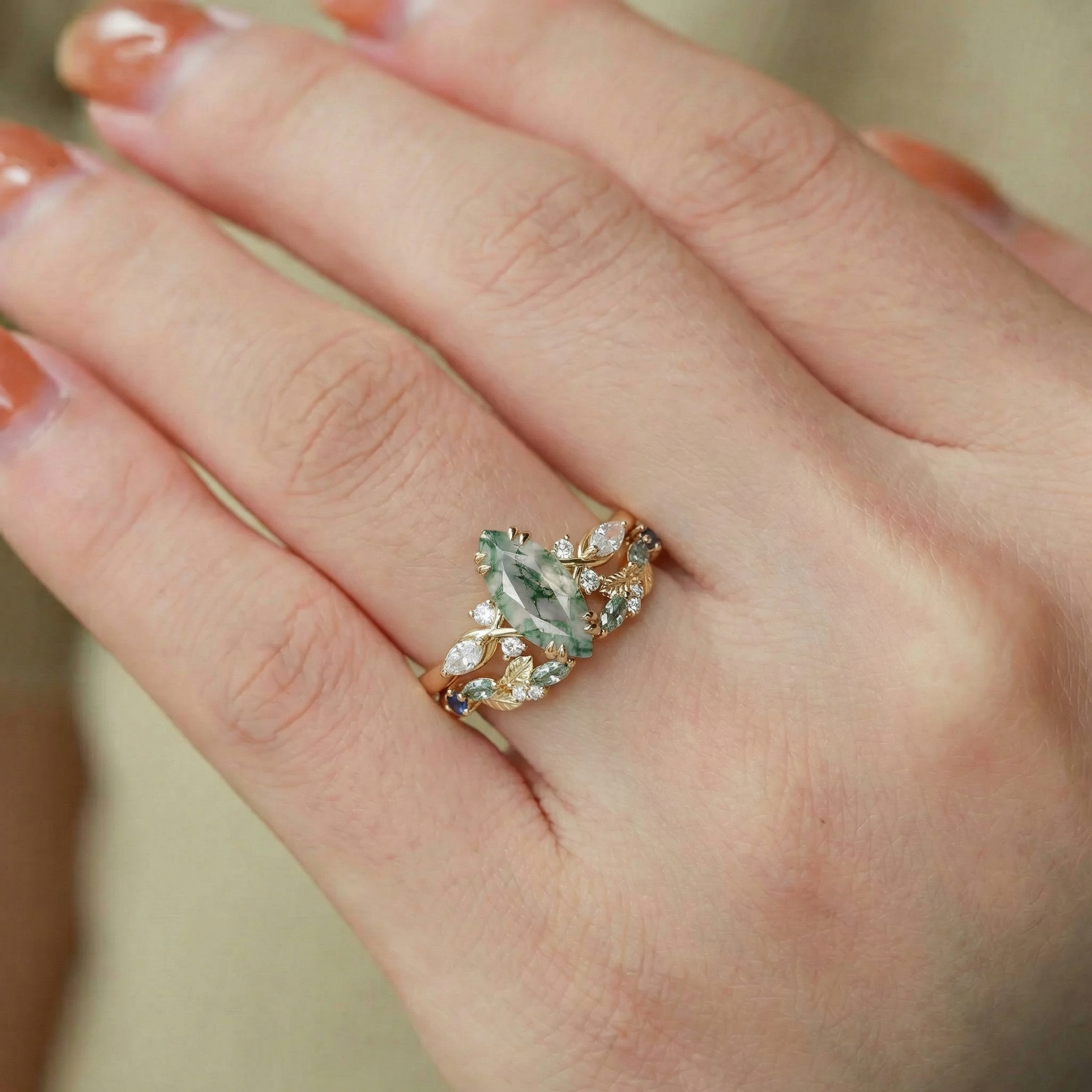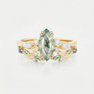 Marquise Cut Moss Agate Vine Engagement Ring Set 2pcs - Hale