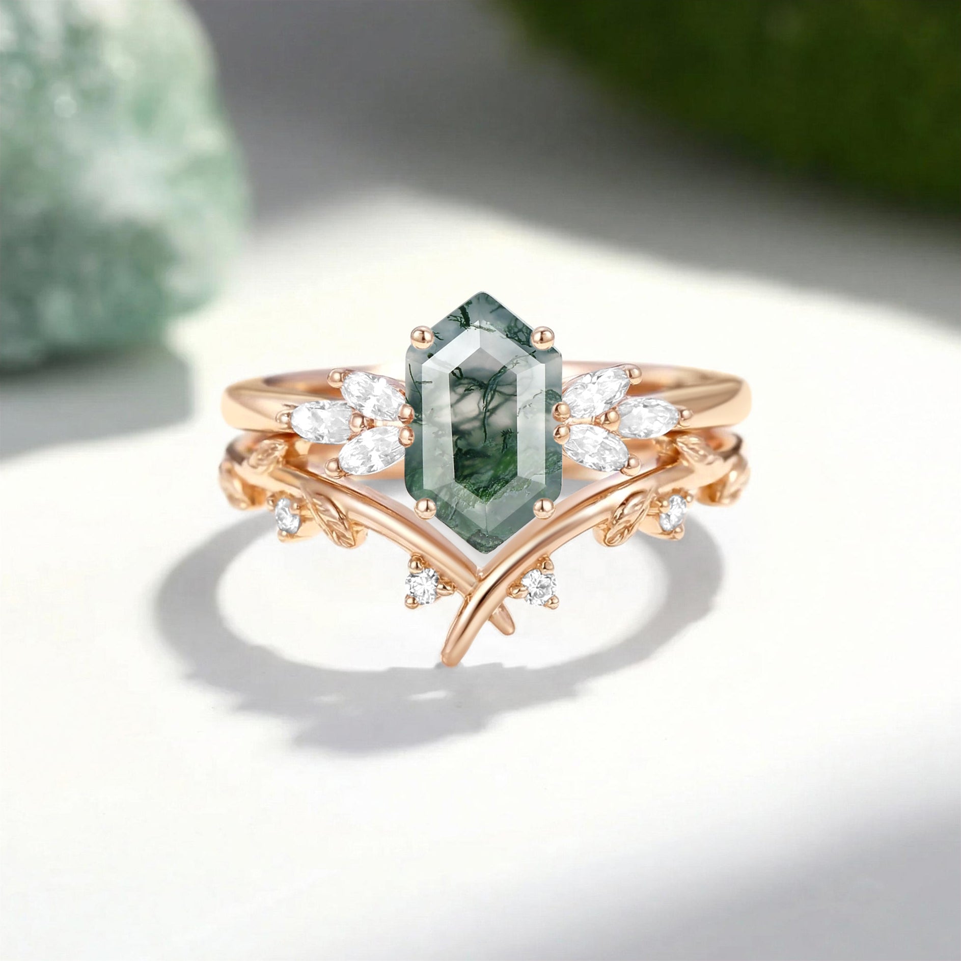 Moss Agate Elongated Hexagon Vine Engagement Ring Set - Tamsin