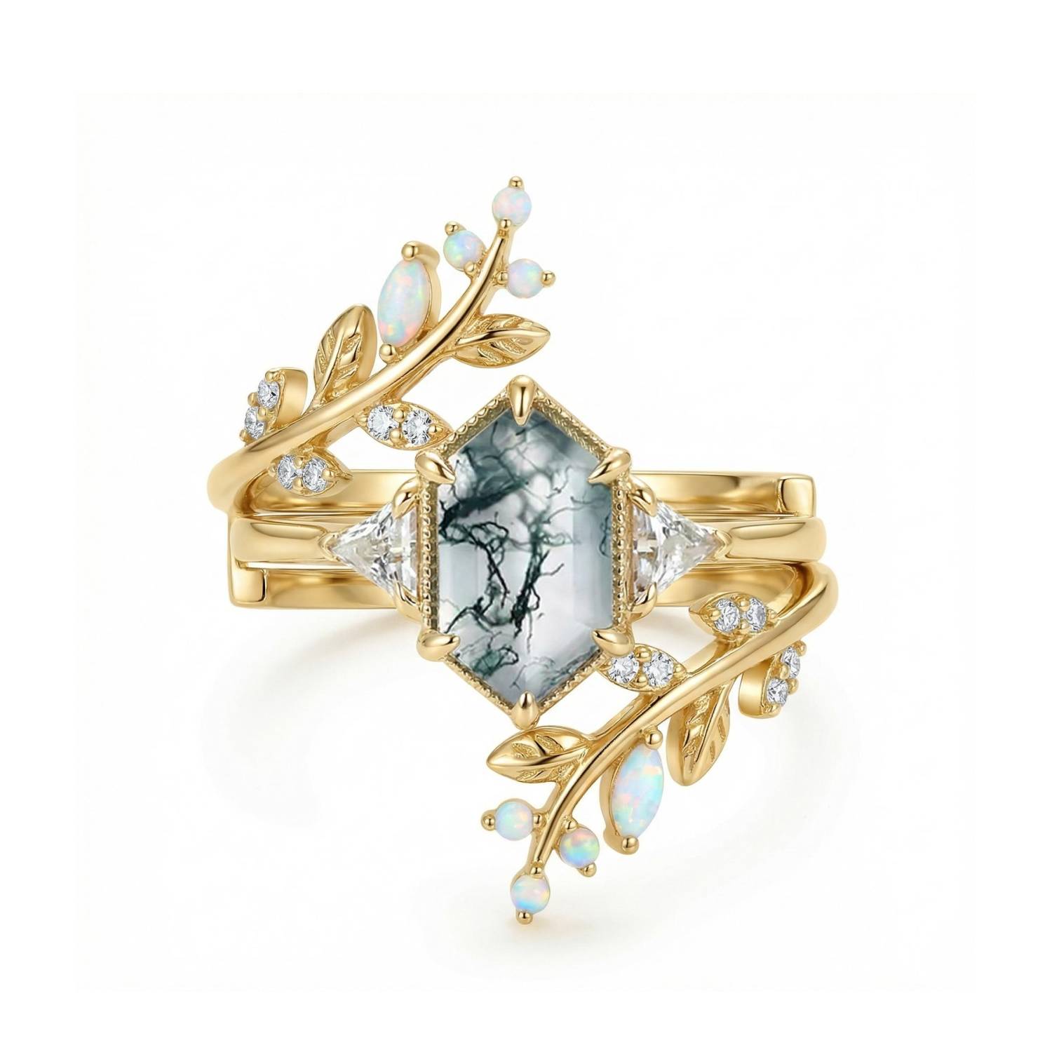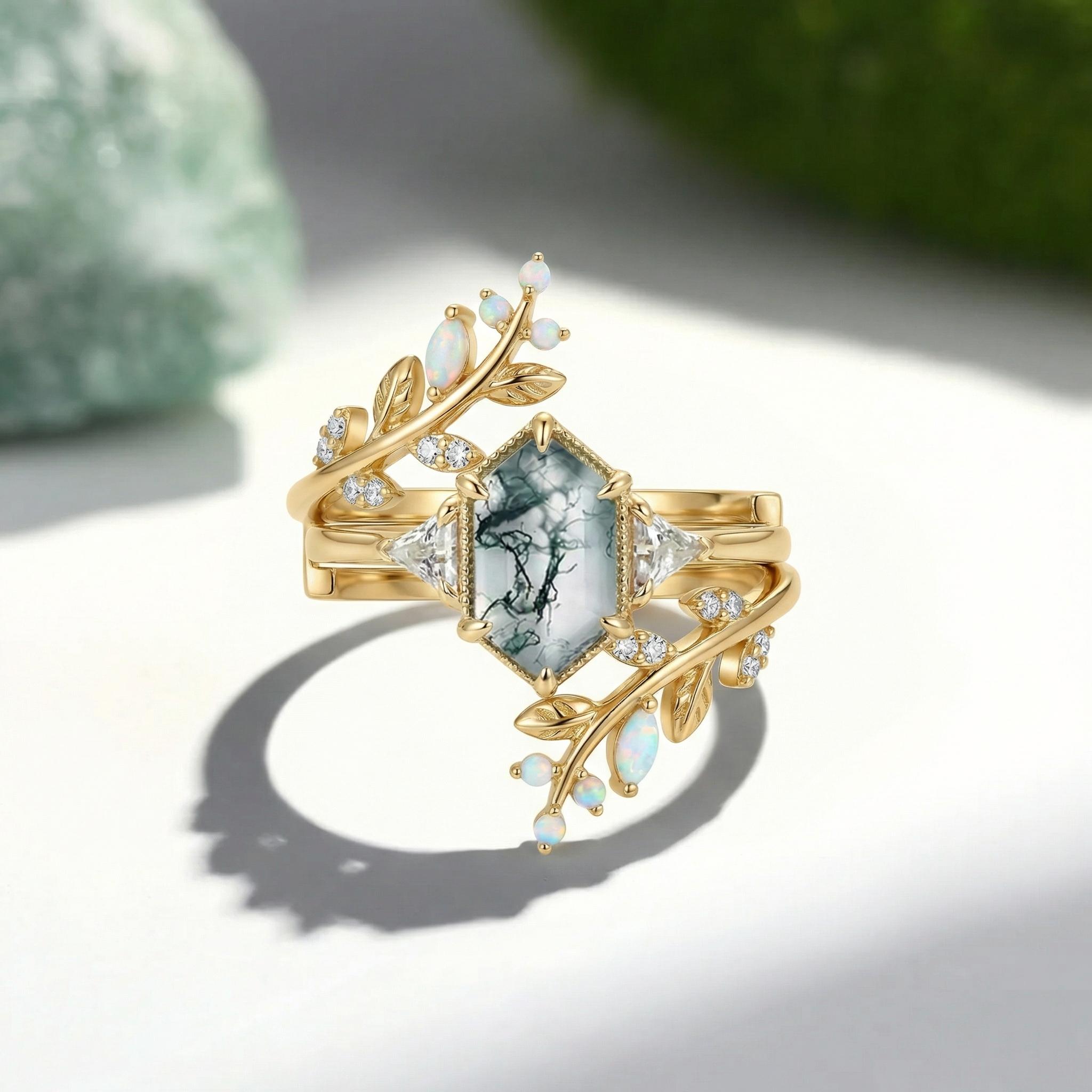 Moss Agate Long Elongated Hexagon Engagement Ring Set - Flint