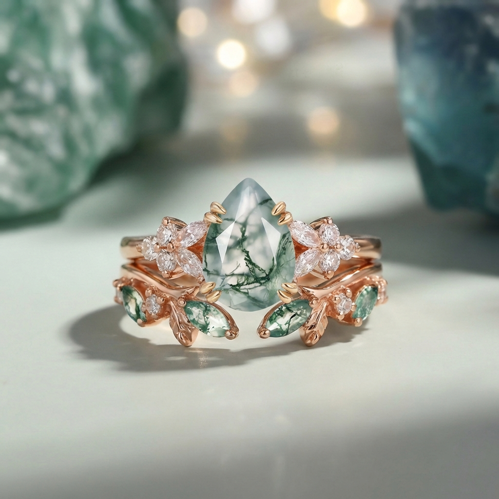 Chloris captures the path of growth upon your hand. The pear-shaped moss agate at the heart of the engagement ring is gently embraced by layered moissanites, like a first fruit cradled by vines and leaves. The open V-shaped band traces the outline of unfolding leaf veins, its lines extending naturally from the metal as though still growing. Through dimensional structure and organic curves, the design finds poetry in motion and stillness. It walks with you through every upward everyday moment, witnessing each true, subtle chapter of growth. If you wear jewelry as a record of becoming, Chloris was made to witness yours.