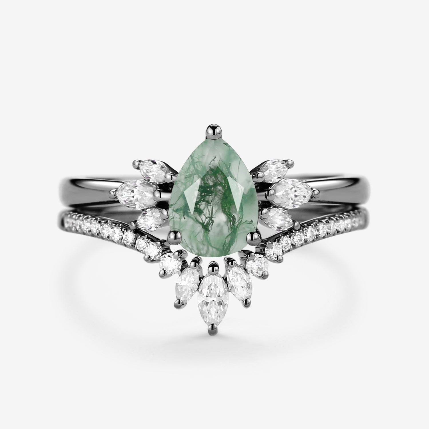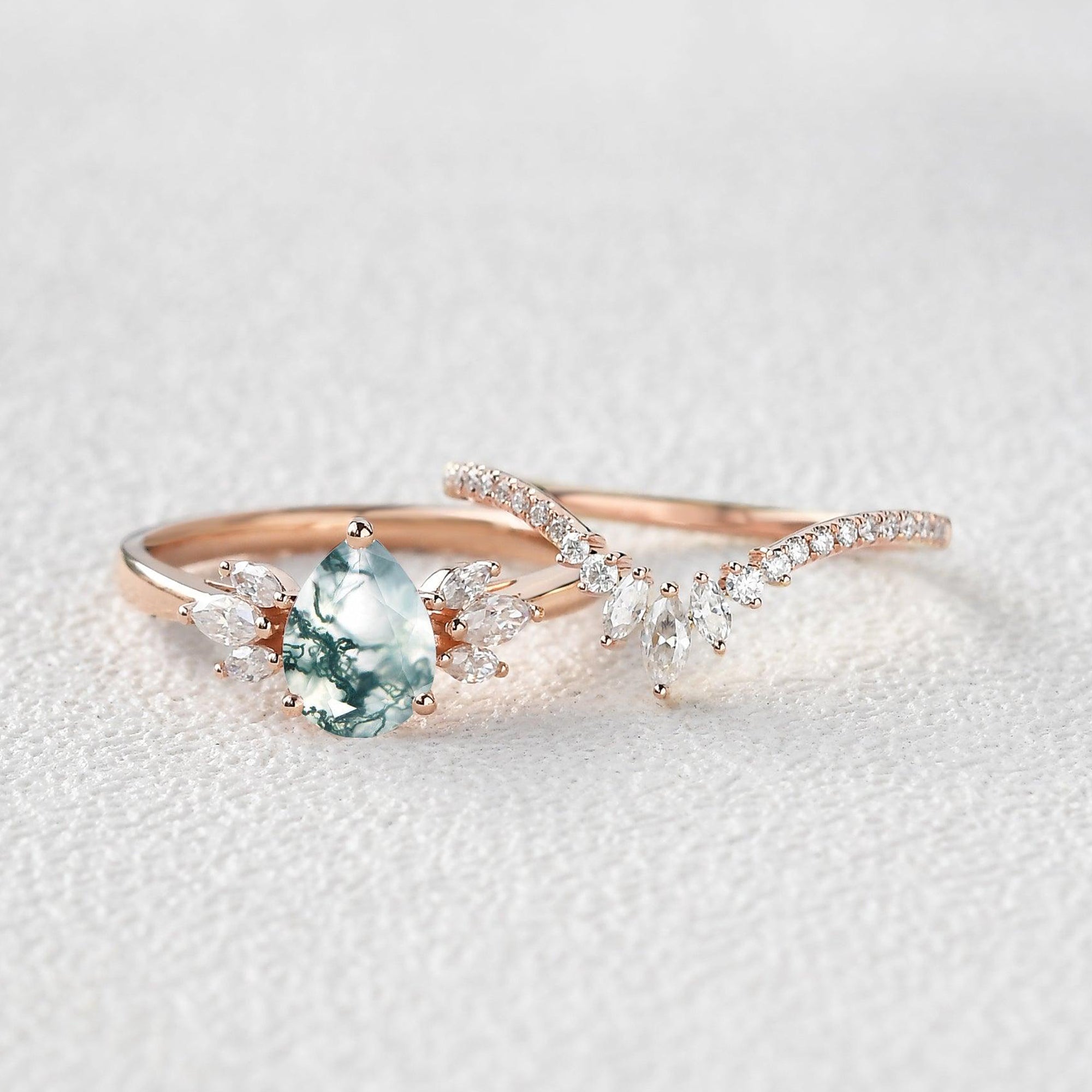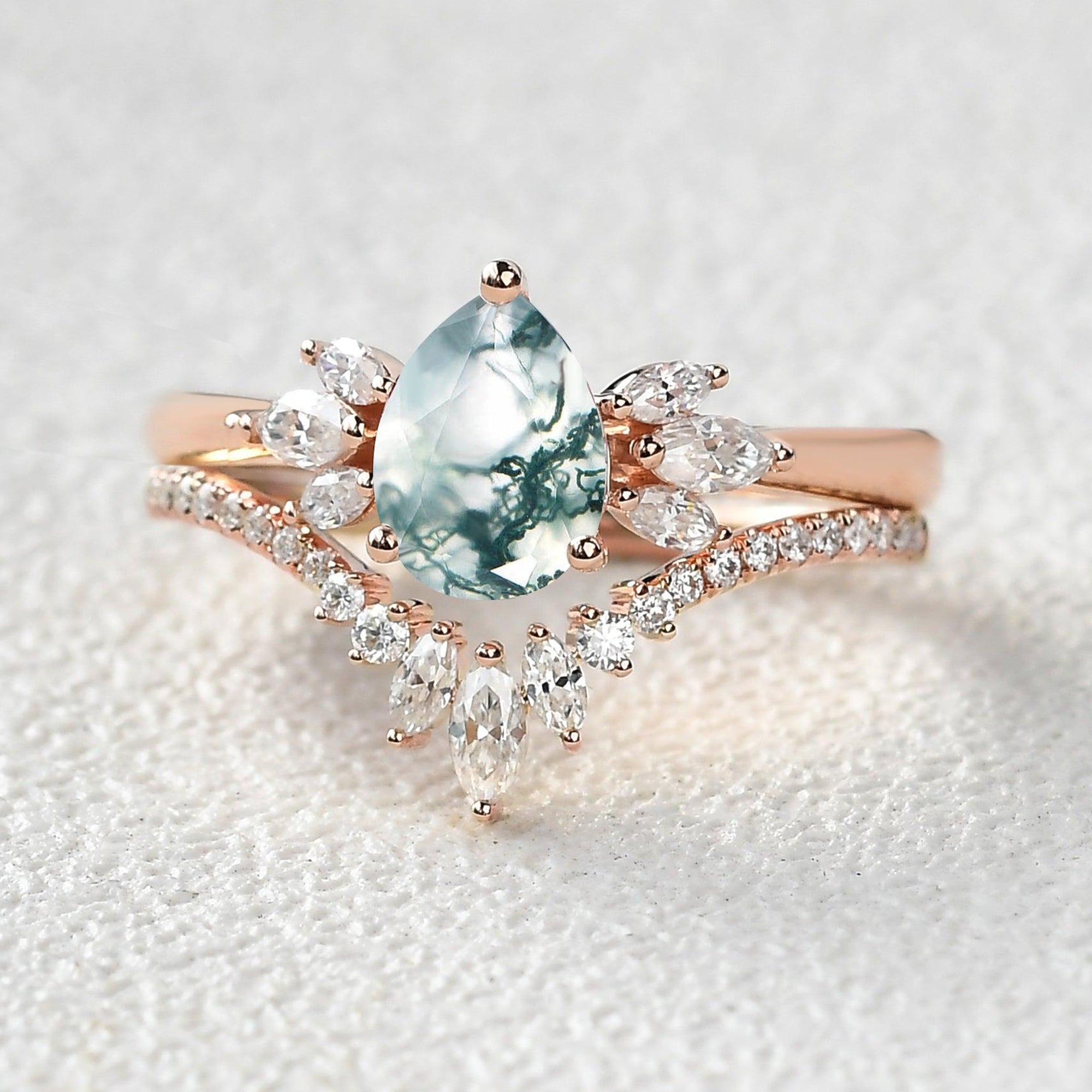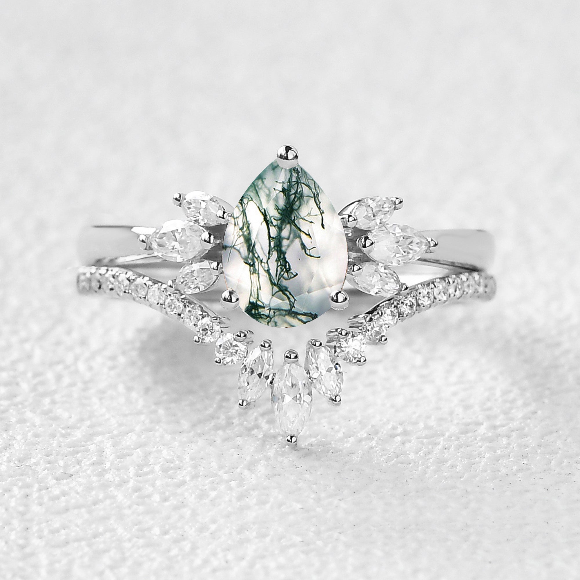 Felicegals 1.5ct Pear Shaped Moss Agate Butterfly Cluster Ring Set 2pcs Marquise Butterfly Leafy Band Ring Unique Handmade Wedding Ring