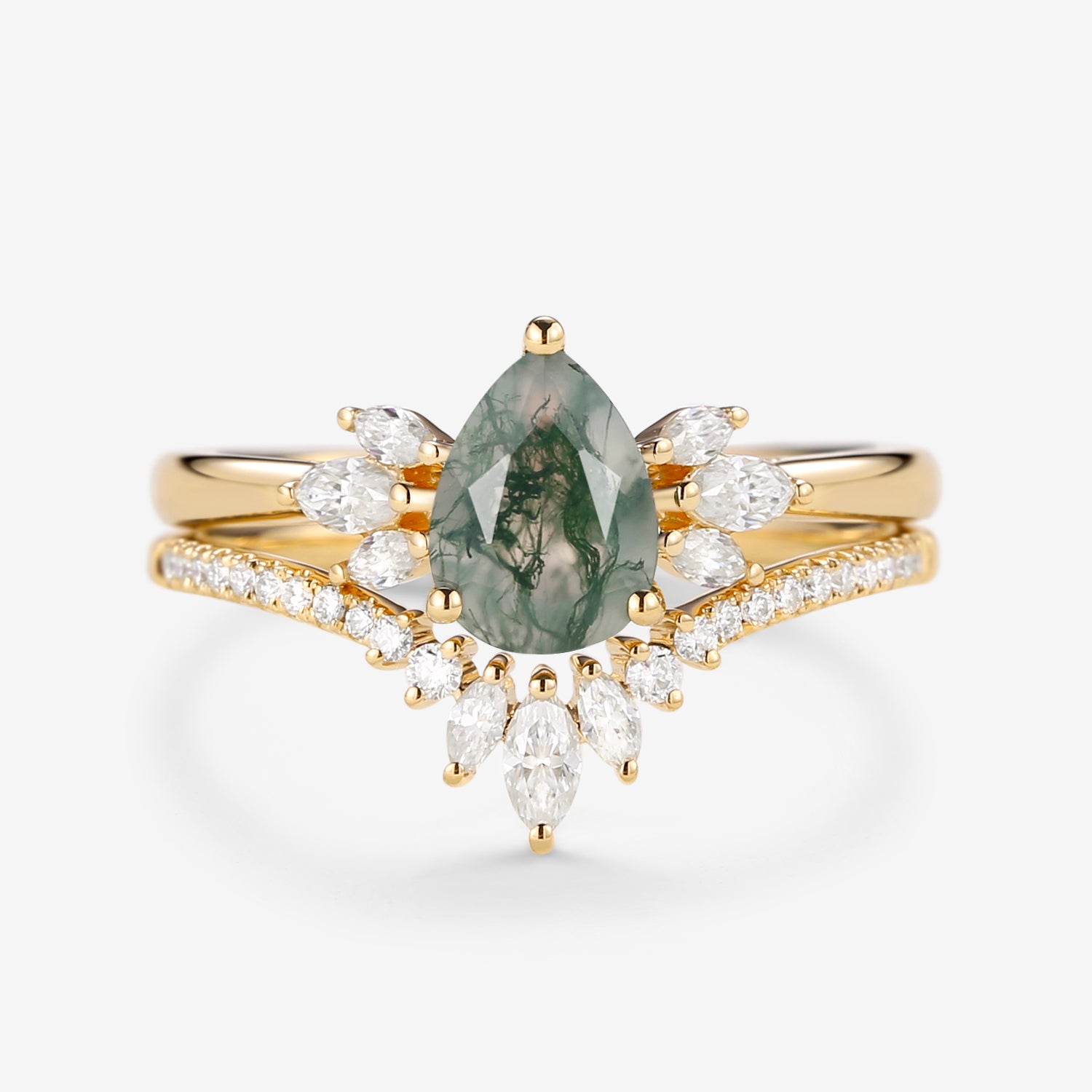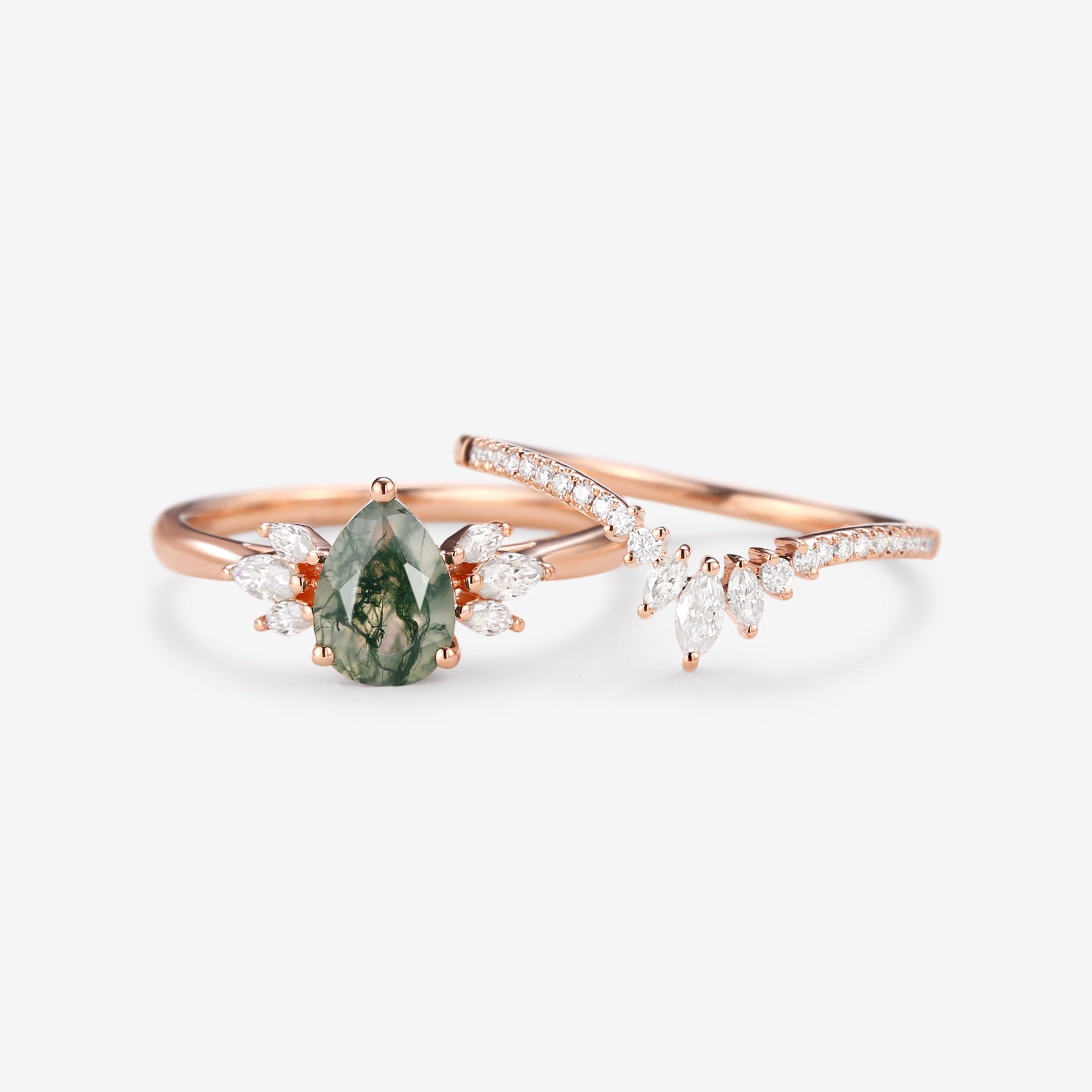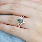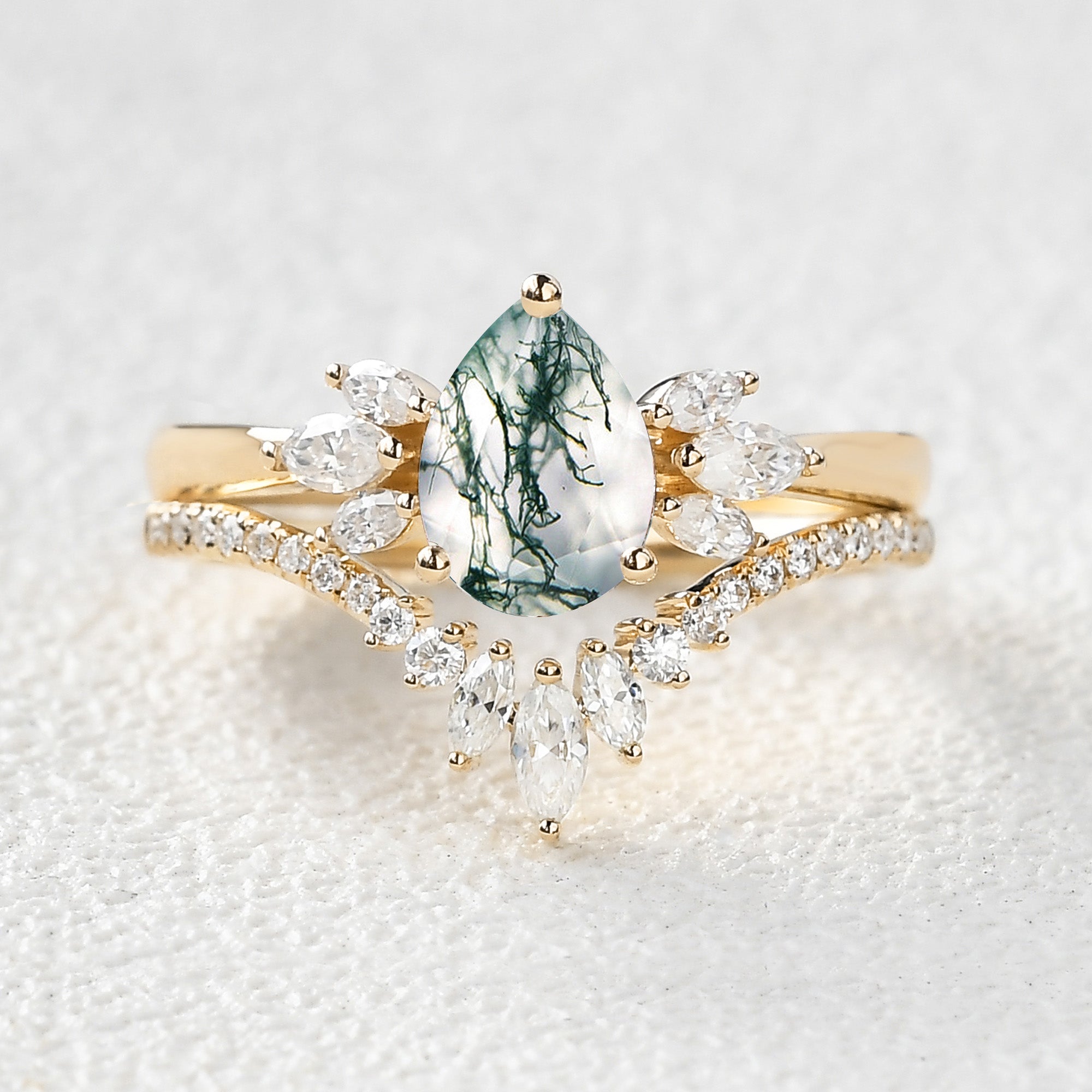 Felicegals 1.5ct Pear Shaped Moss Agate Butterfly Cluster Ring Set 2pcs Marquise Butterfly Leafy Band Ring Unique Handmade Wedding Ring