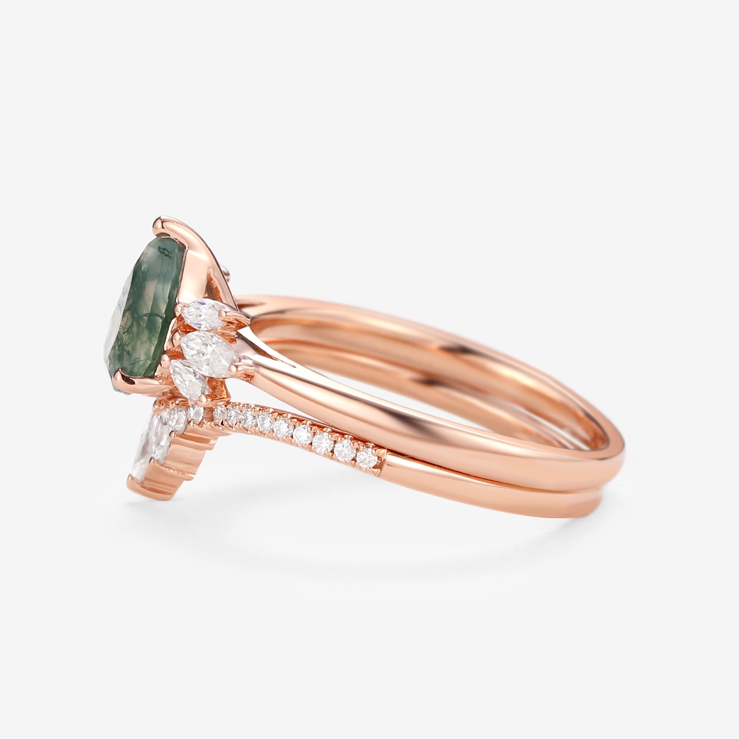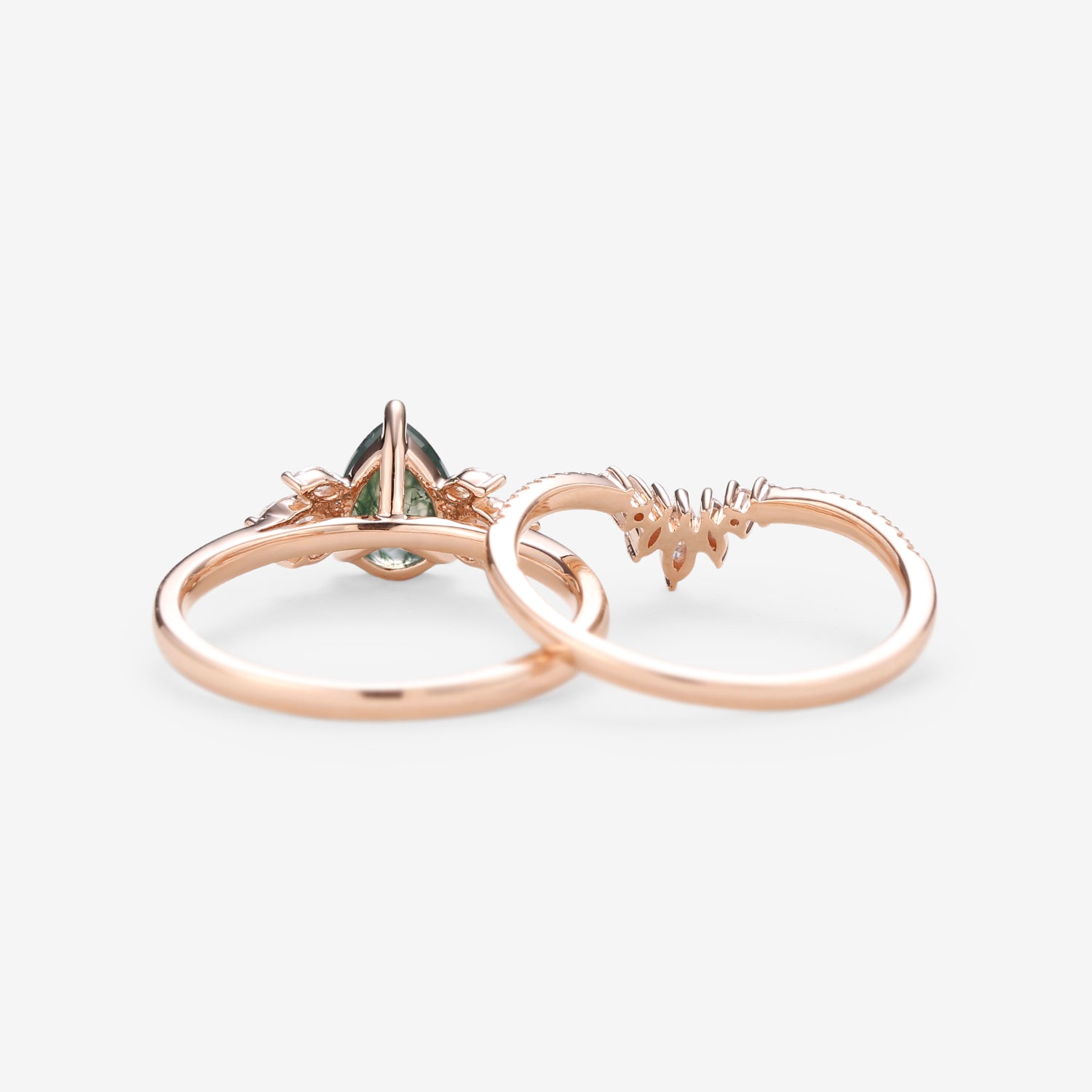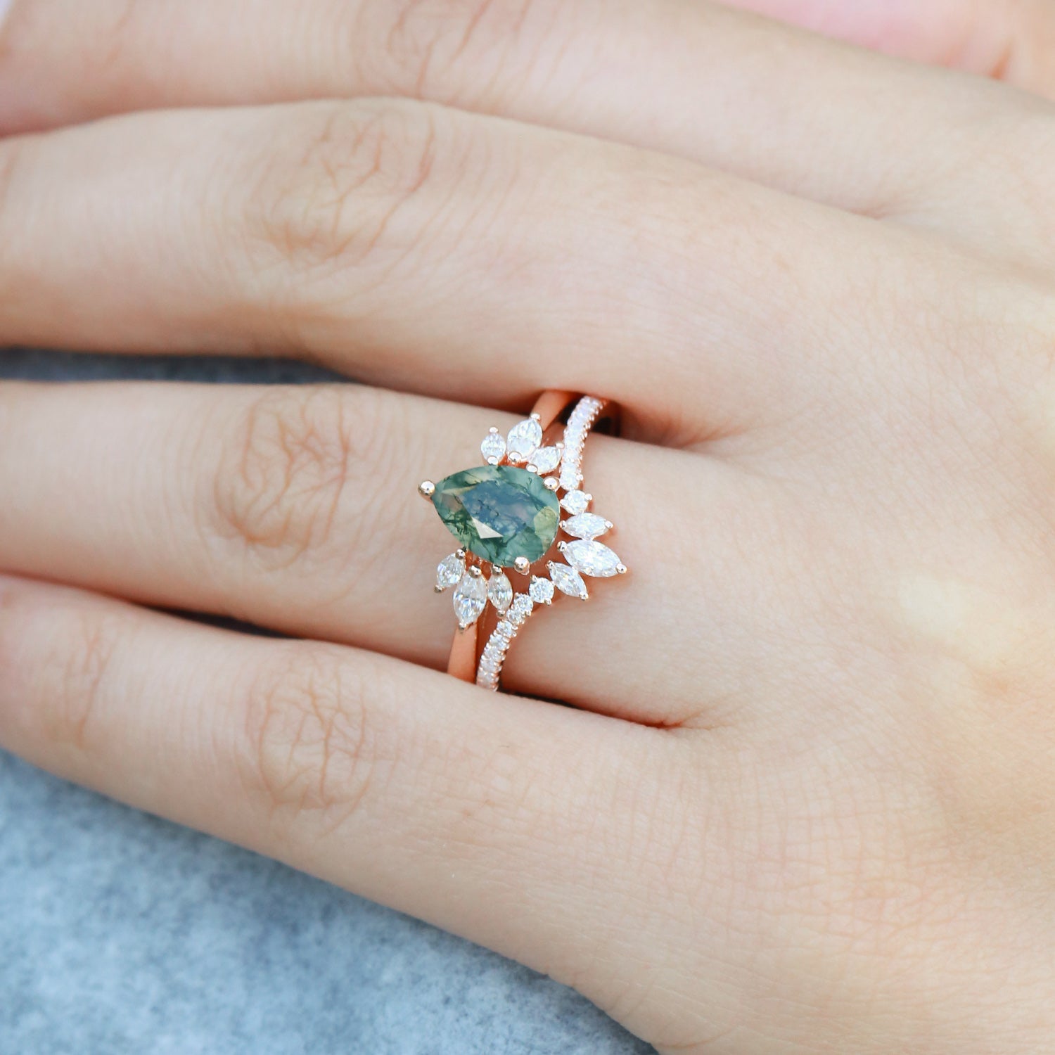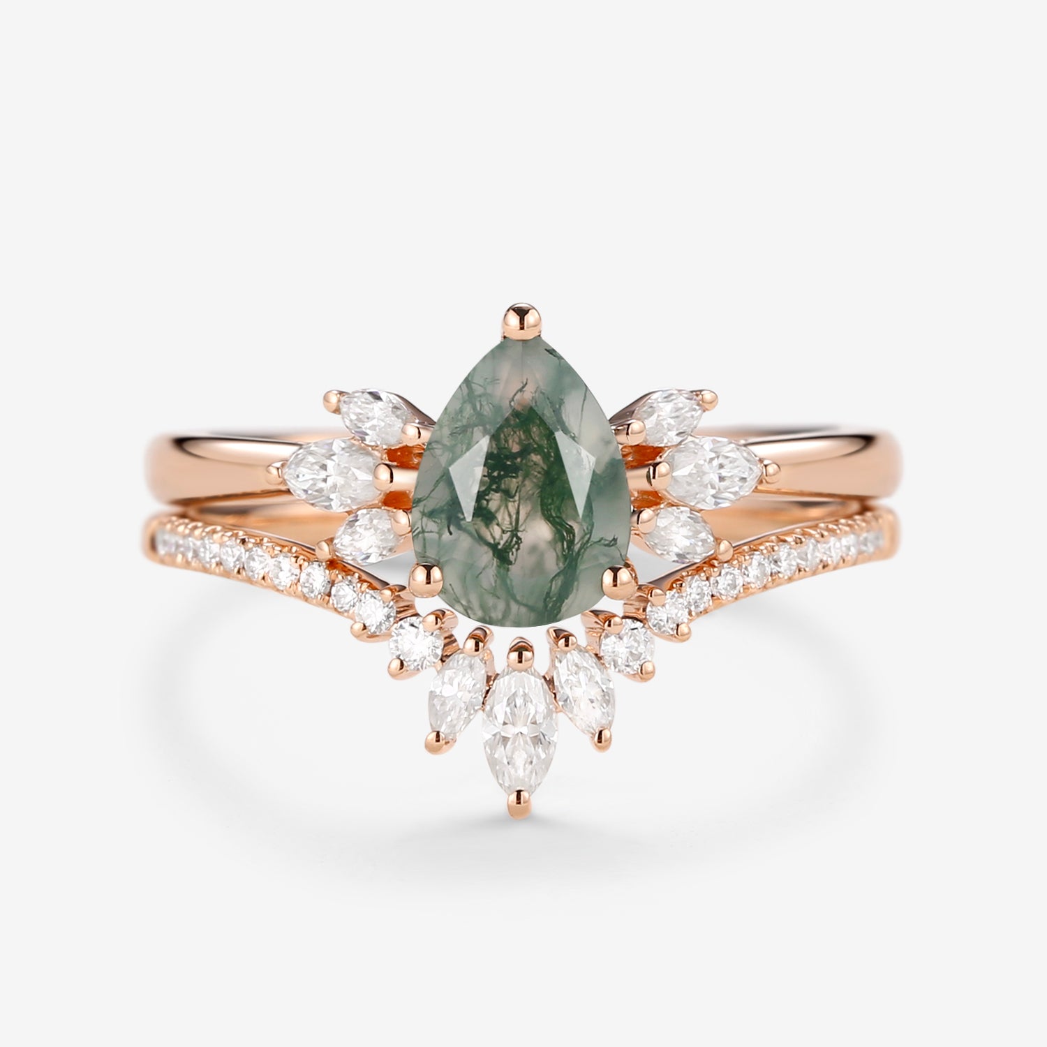 Felicegals 1.5ct Pear Shaped Moss Agate Butterfly Cluster Ring Set 2pcs Marquise Butterfly Leafy Band Ring Unique Handmade Wedding Ring