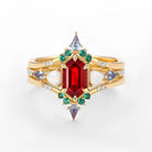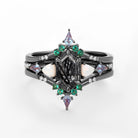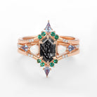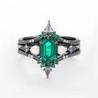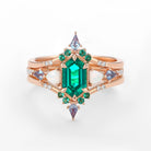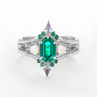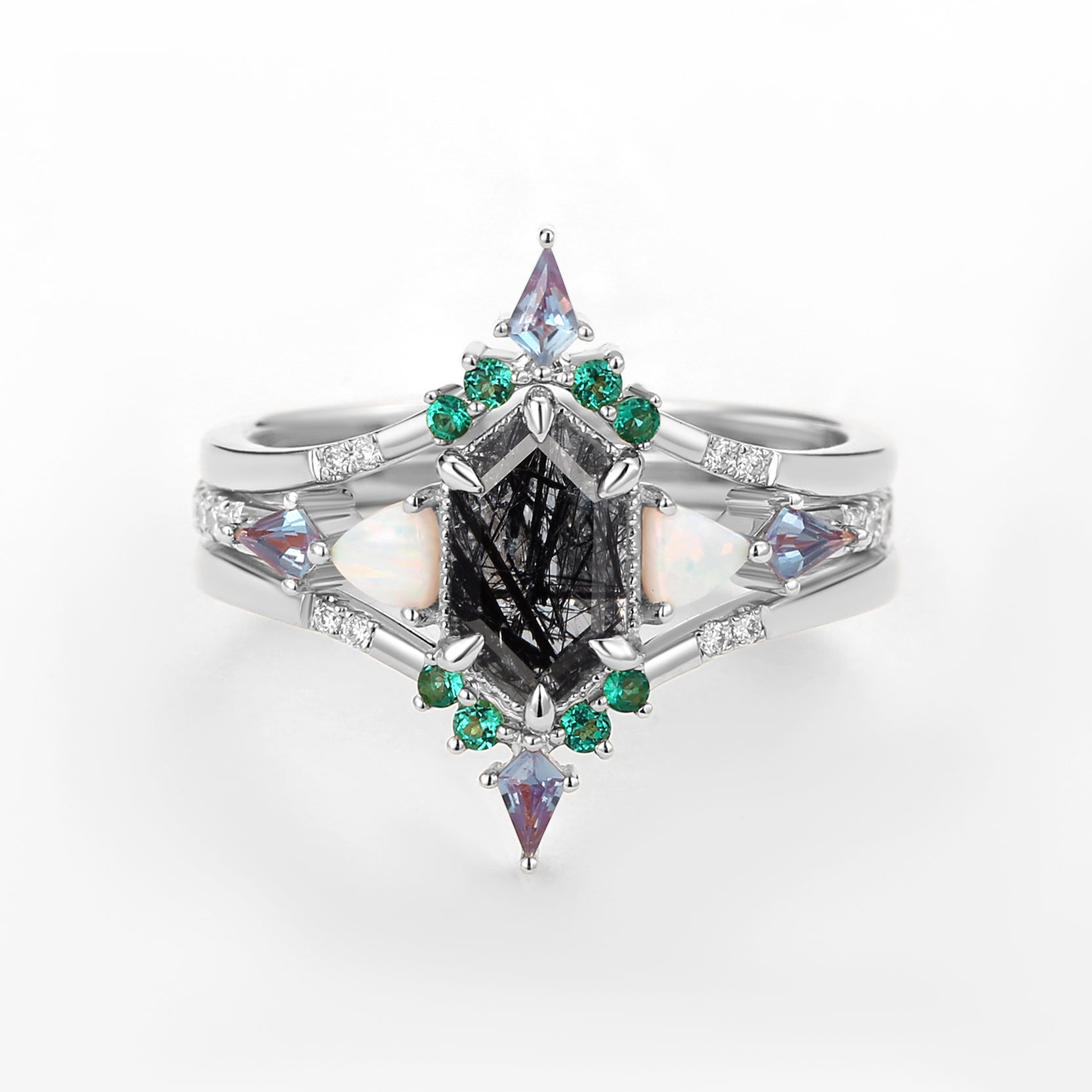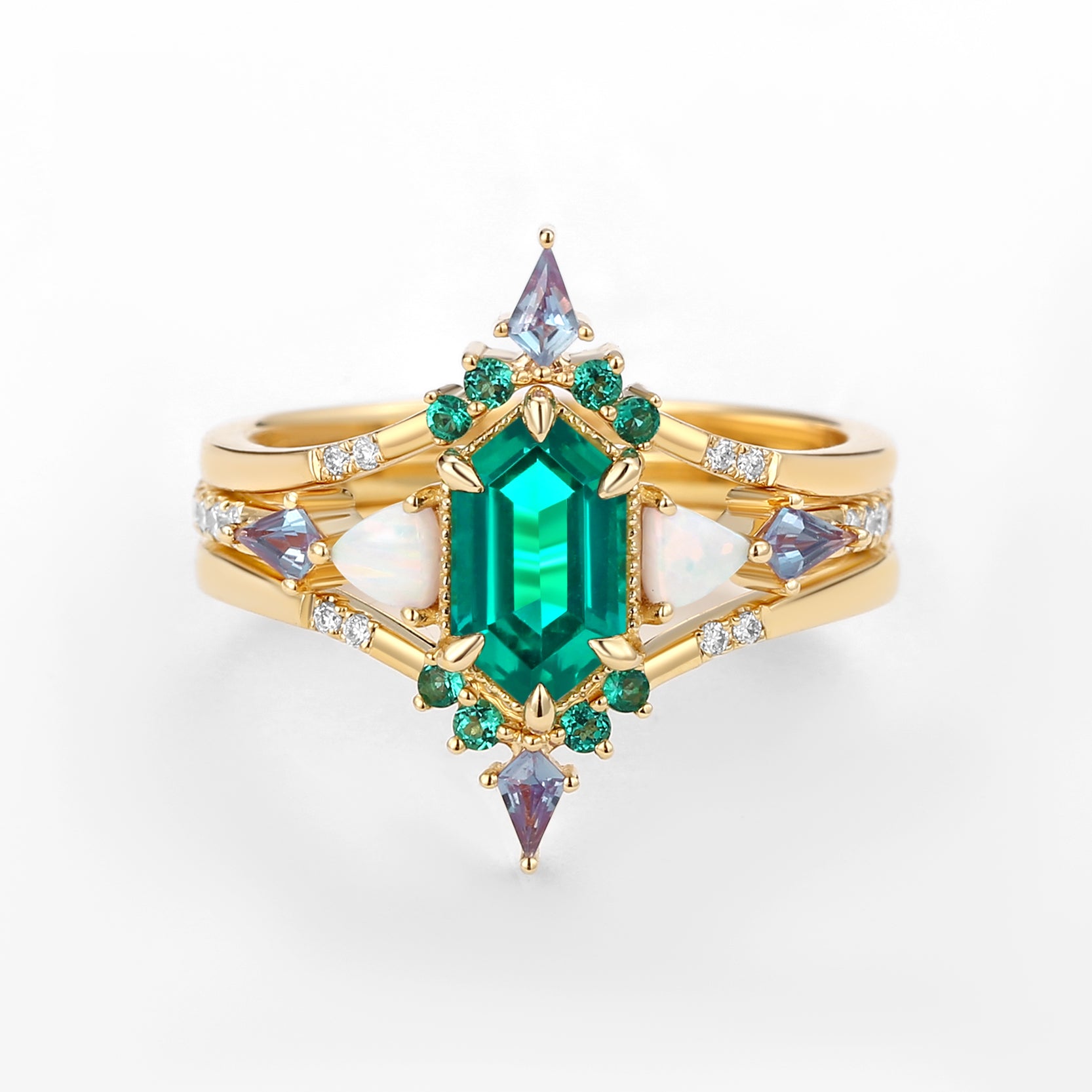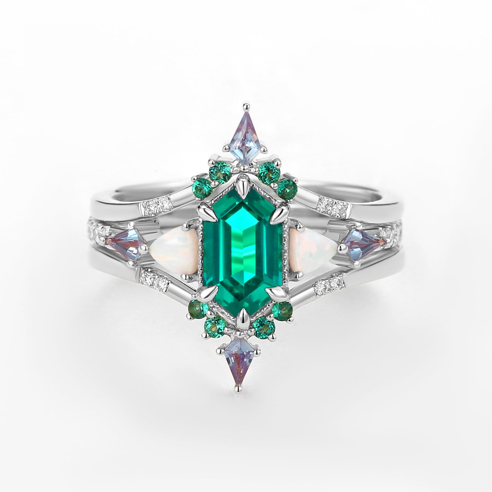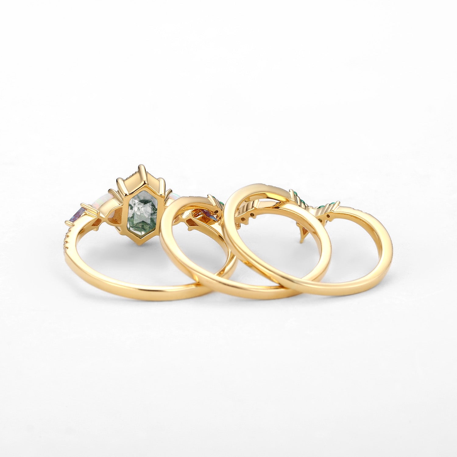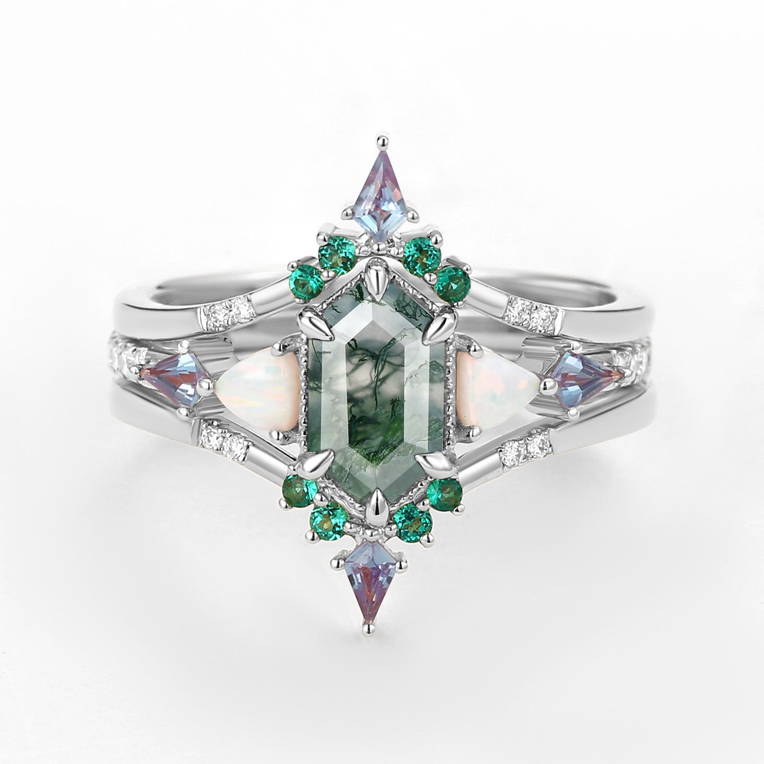 Long Hexagon Moss Agate & Opal & Alexandrite & Emerald Engagement Ring Set 3pcs - Max
