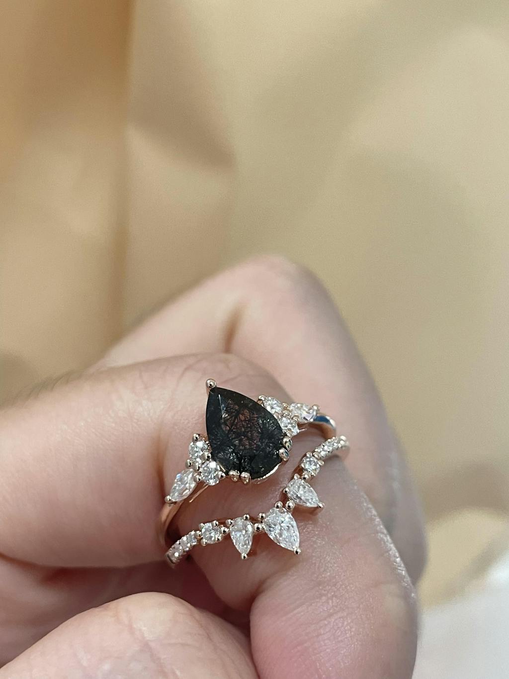 Felicegals 1.5ct Pear Shaped Black Rutilated Quartz Gold Ring Set 2pcs Marquise Moissanite Ring Custom Curved Band Halo Ring