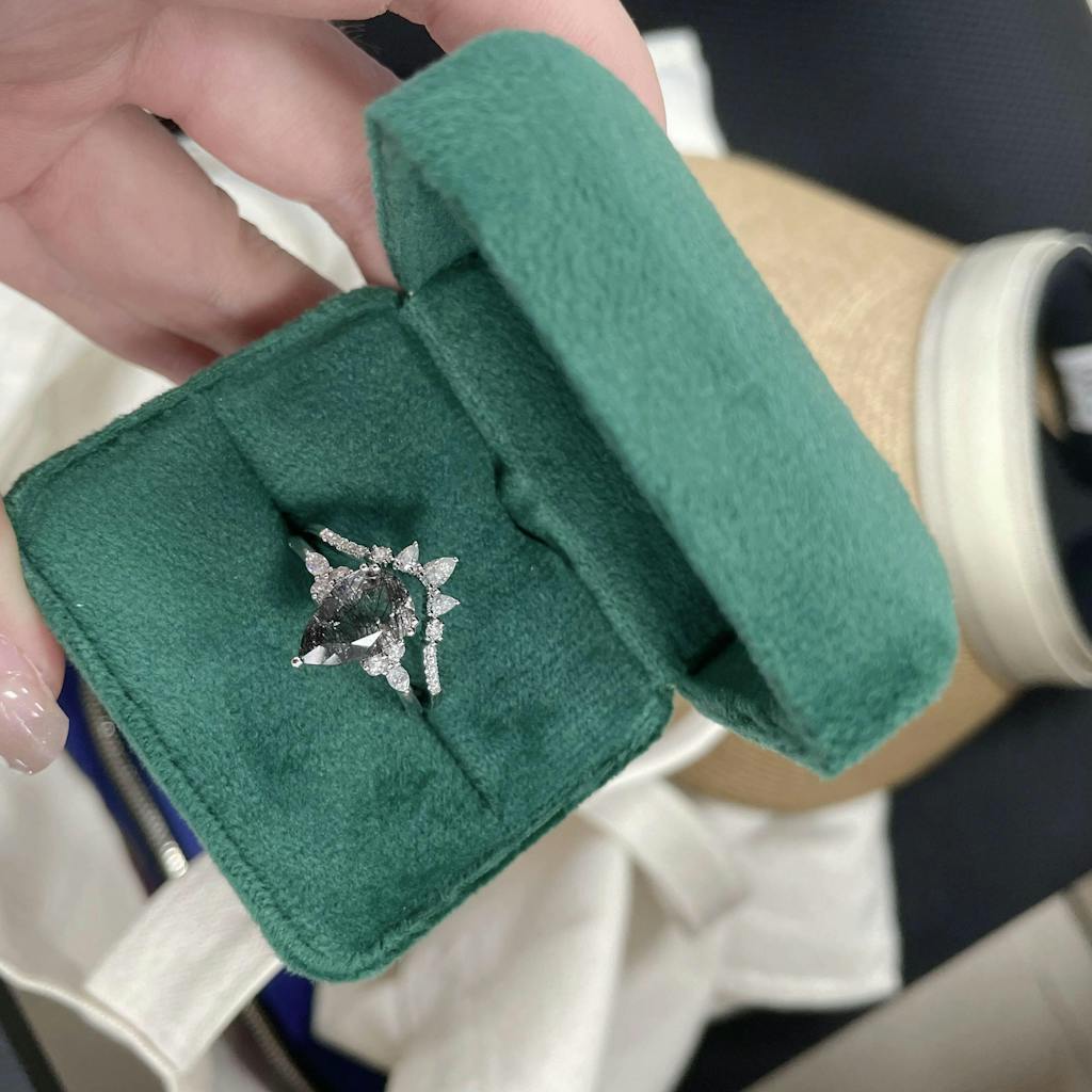 My fiancé proposed with this stunning ring on a romantic WV getaway in the mountains and it is absolutely GORGEOUS. Photos do not do it justice. The clarity of the moss agate stone is perfect and I love the accent of the stone that he customized and added to the wedding band! I love this ring so much! Thank you for creating such unique pieces for girls like me that prefer the non- traditional route!