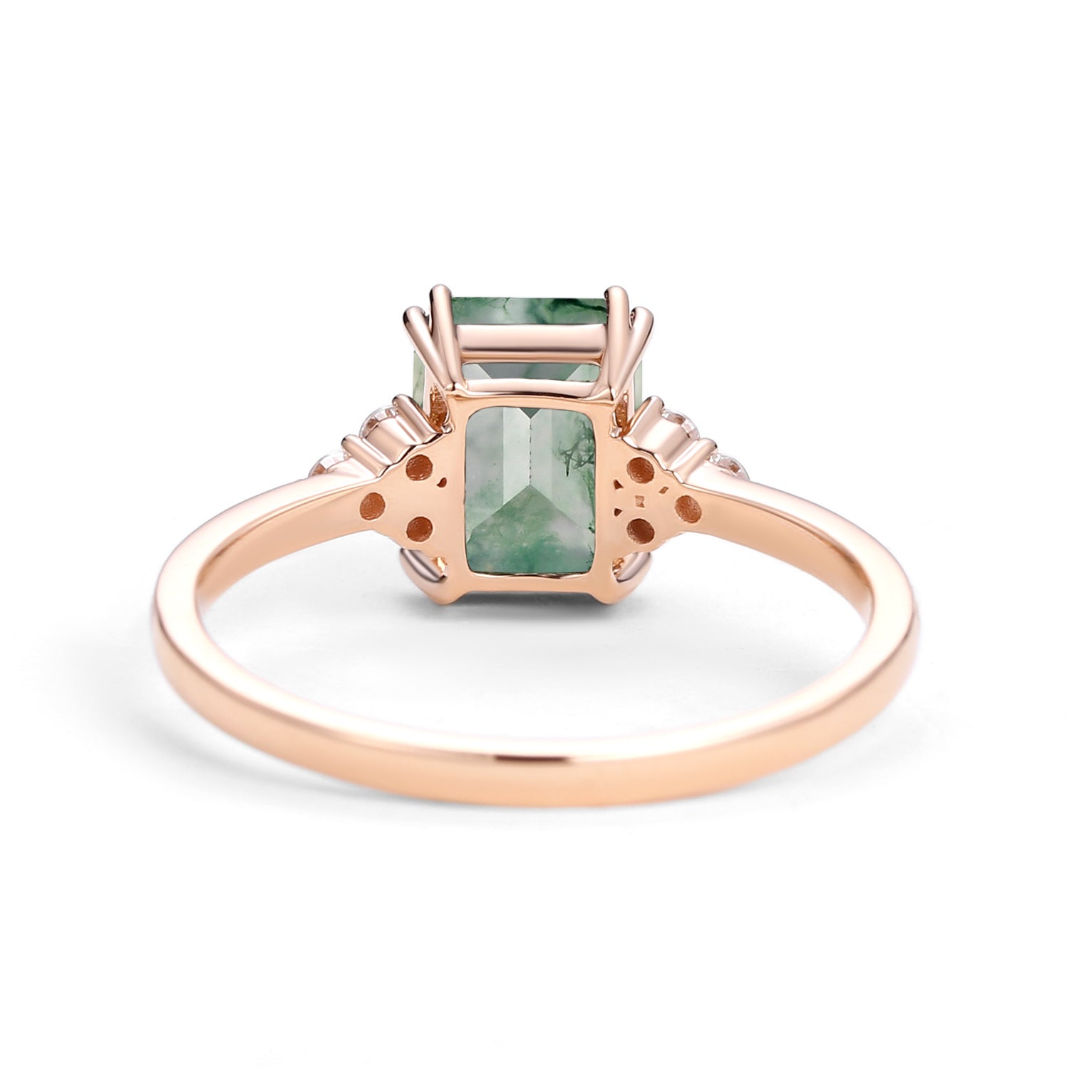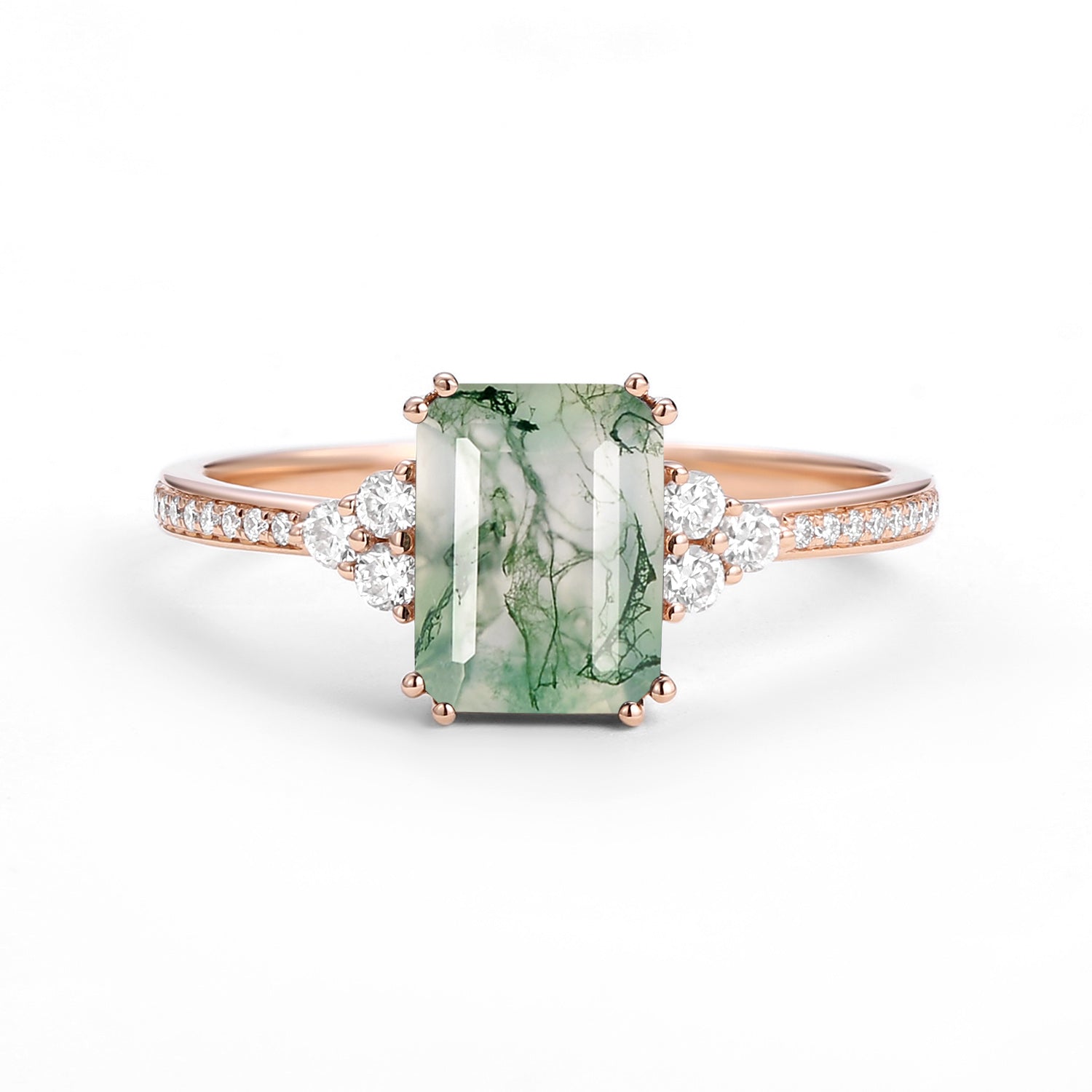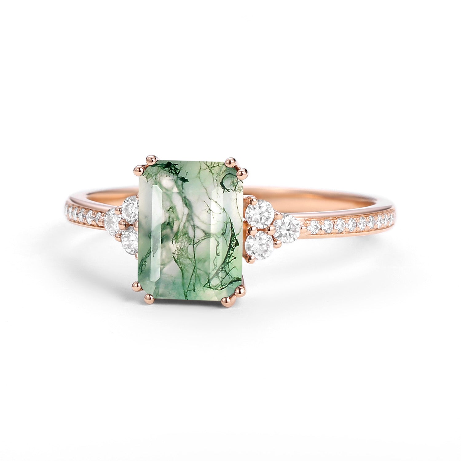 Classic Emerald Cut Moss Agate & Moissanite Cluster Engagement Ring