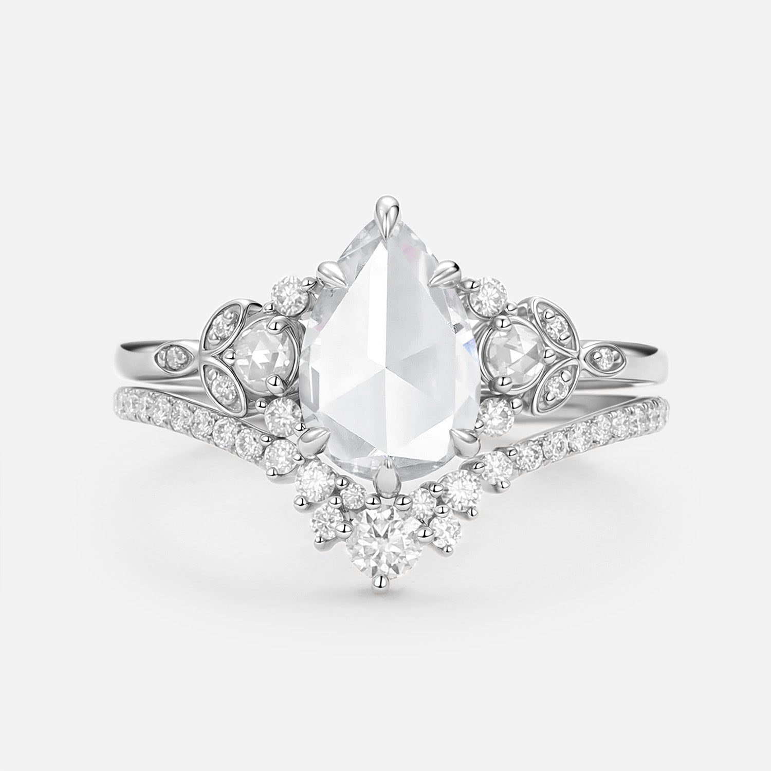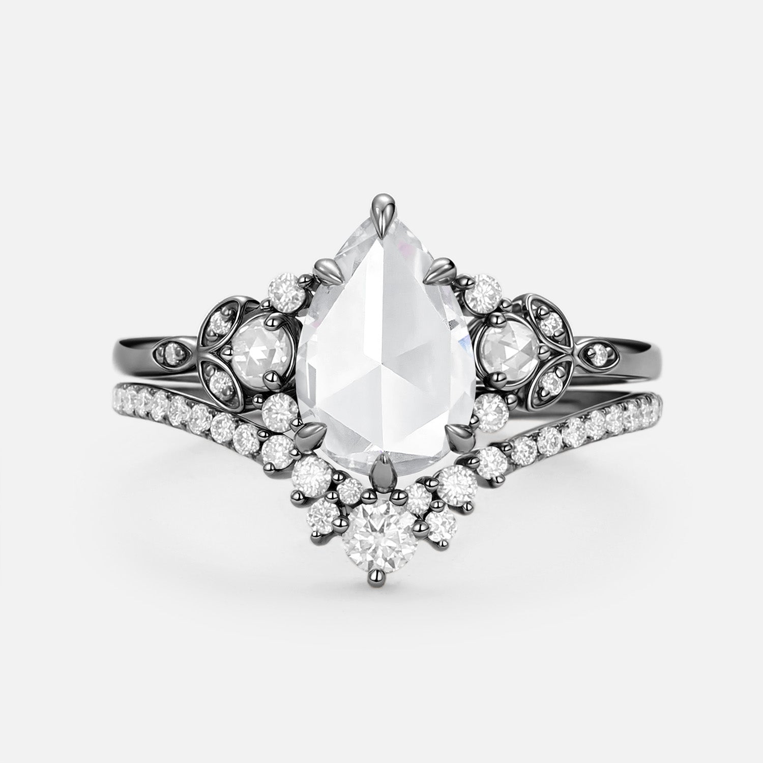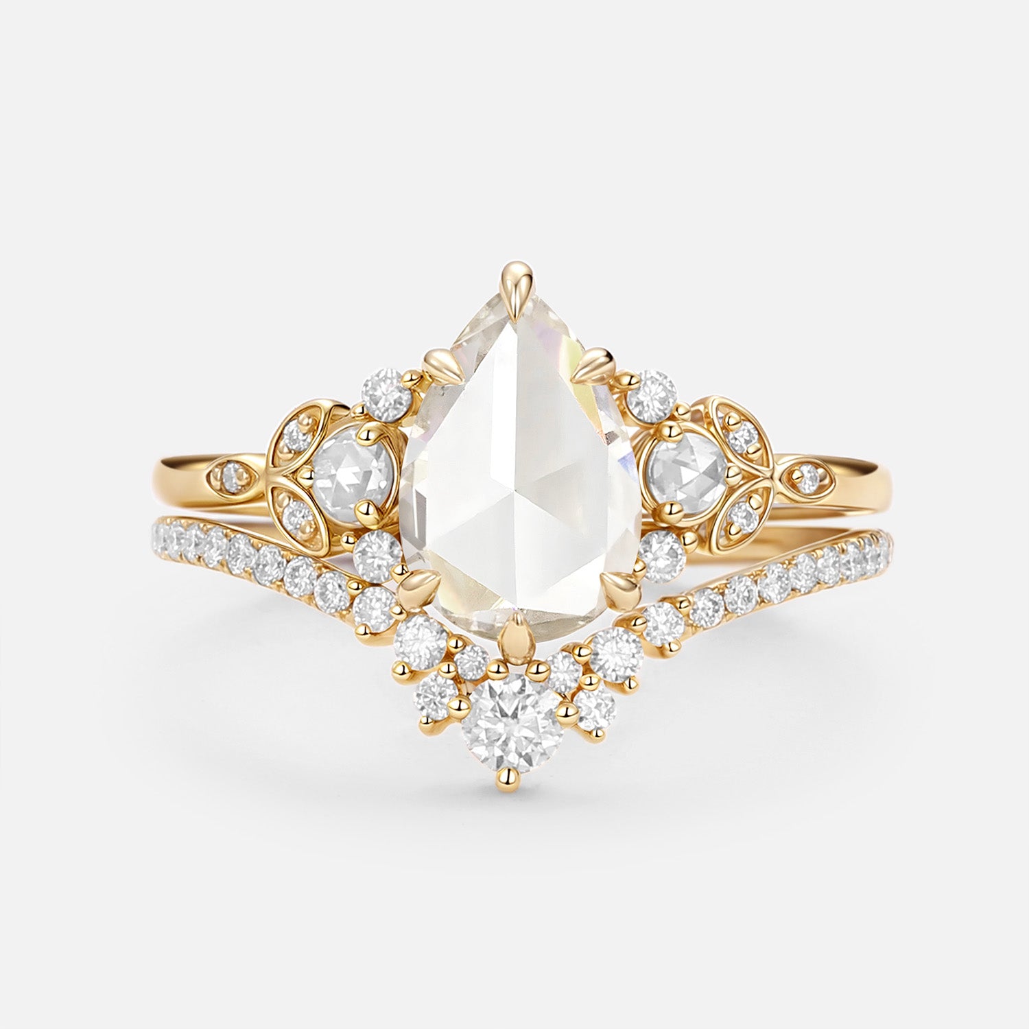 Rose Cut Pear Vintage Moissanite Gold Ring Set 2pcs - Rhea