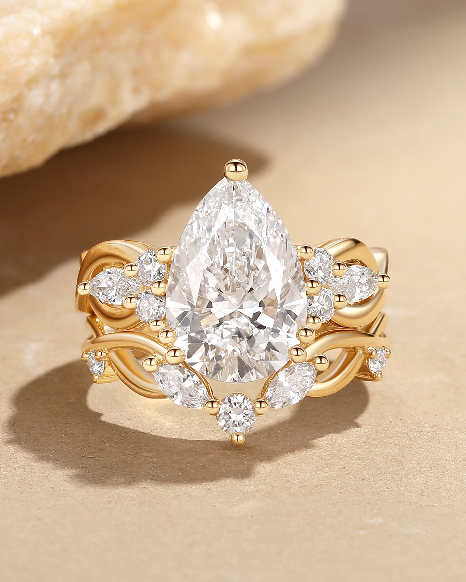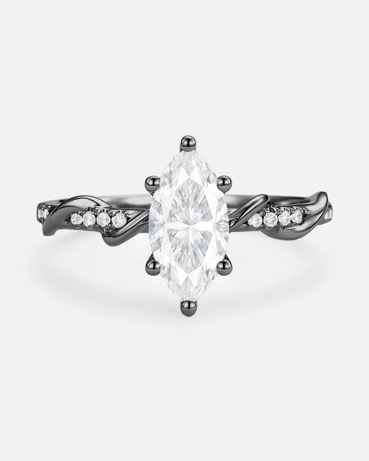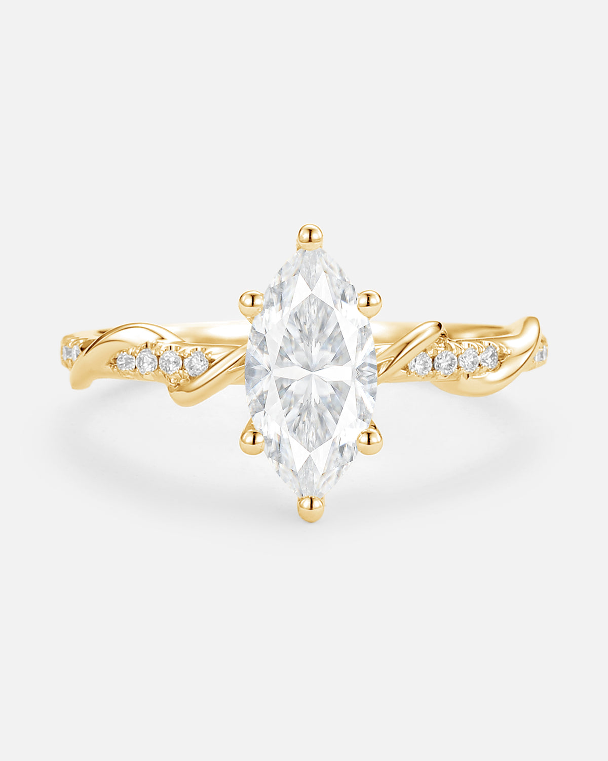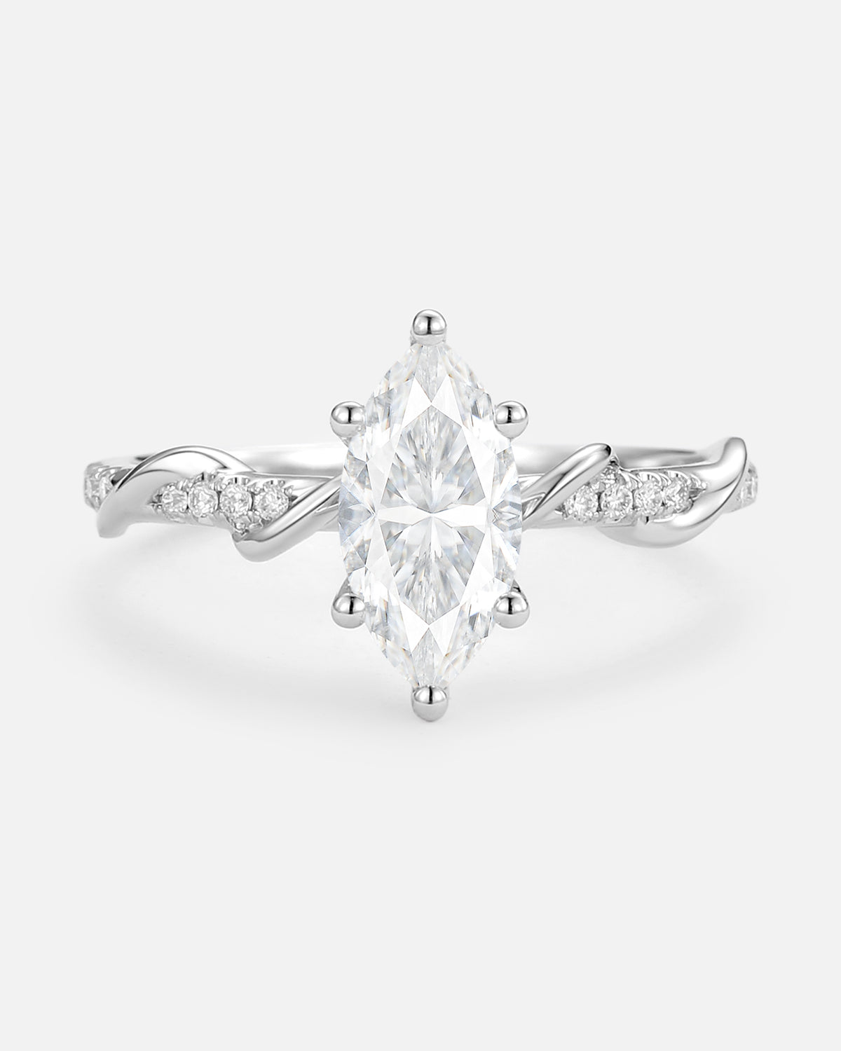 Classic Engagement features versatile moissanite engagement rings, where the center gemstone can be surrounded by either a few simple gems or a complicated cluster of multiple layers of differently shaped gems. The cluster setting gives the moissanite cluster ring a modern and trendy look with different arrangements of marquise moissanite and moissanite round cut gems. The cluster moissanite gold ring balances simplicity and grandeur, making it the perfect moissanite rings for women. The gradually increasing size of the side stones on the cluster curved wedding band shank creates a beautiful gradient effect, symbolizing the sweet moments of a couple's journey from acquaintance to love, recorded on their fingers.