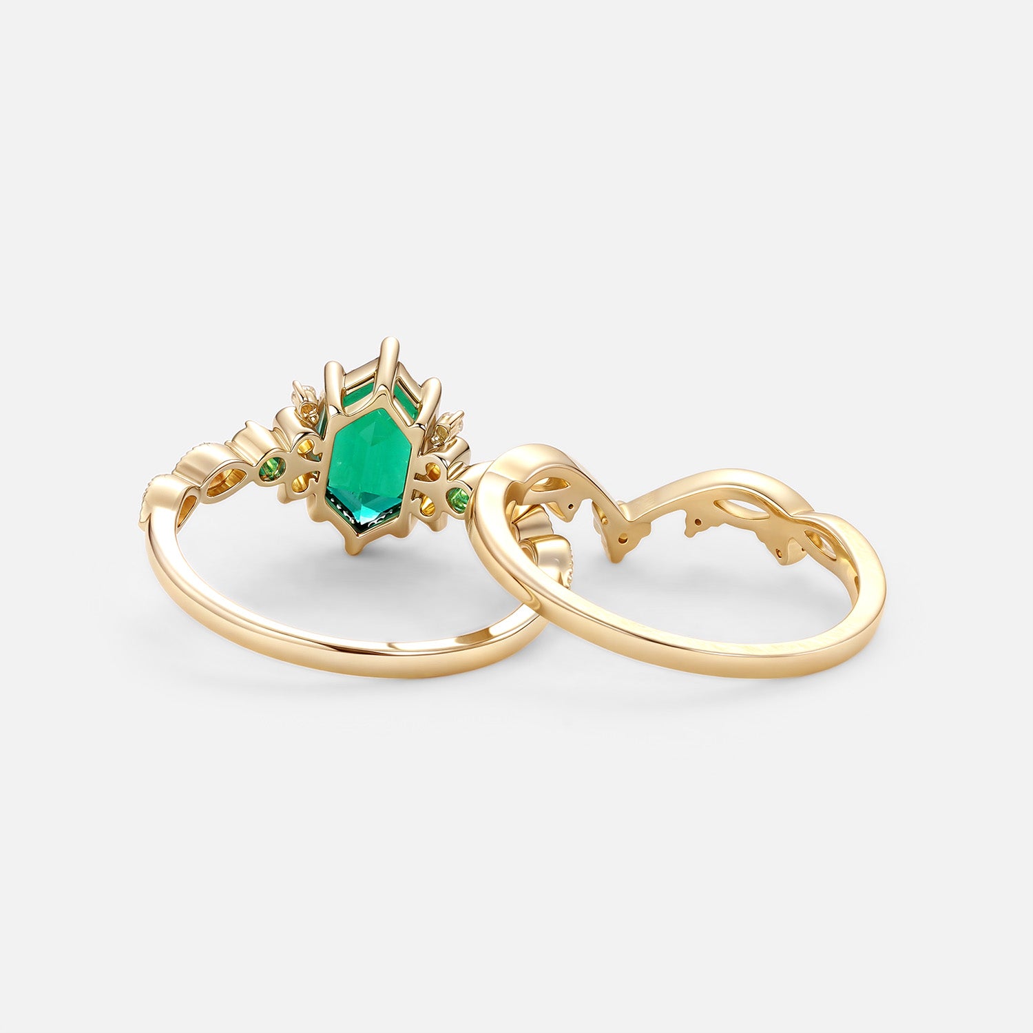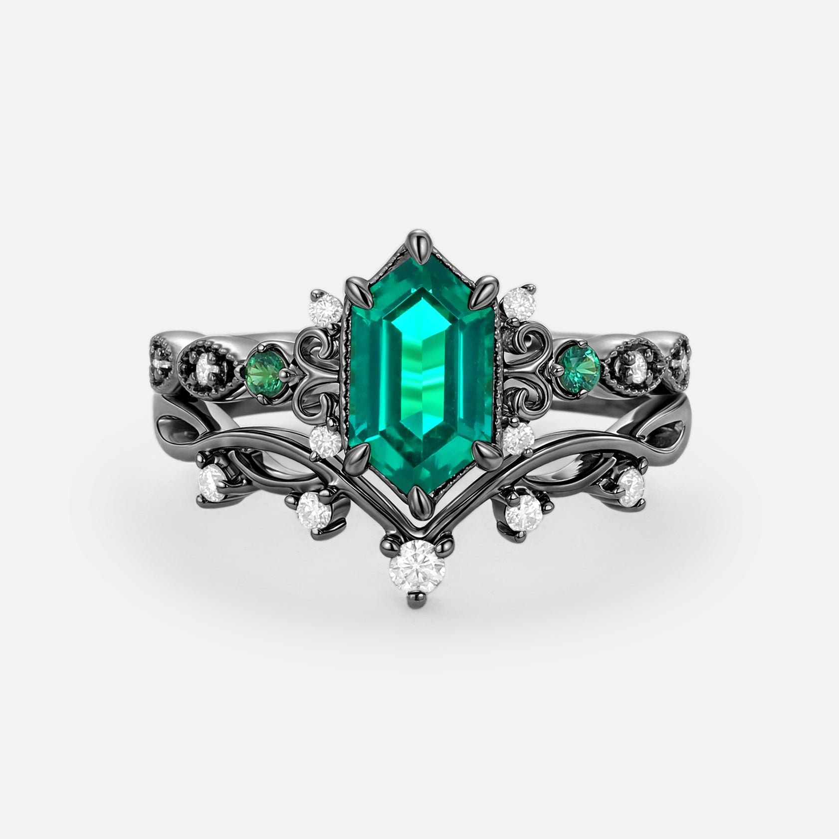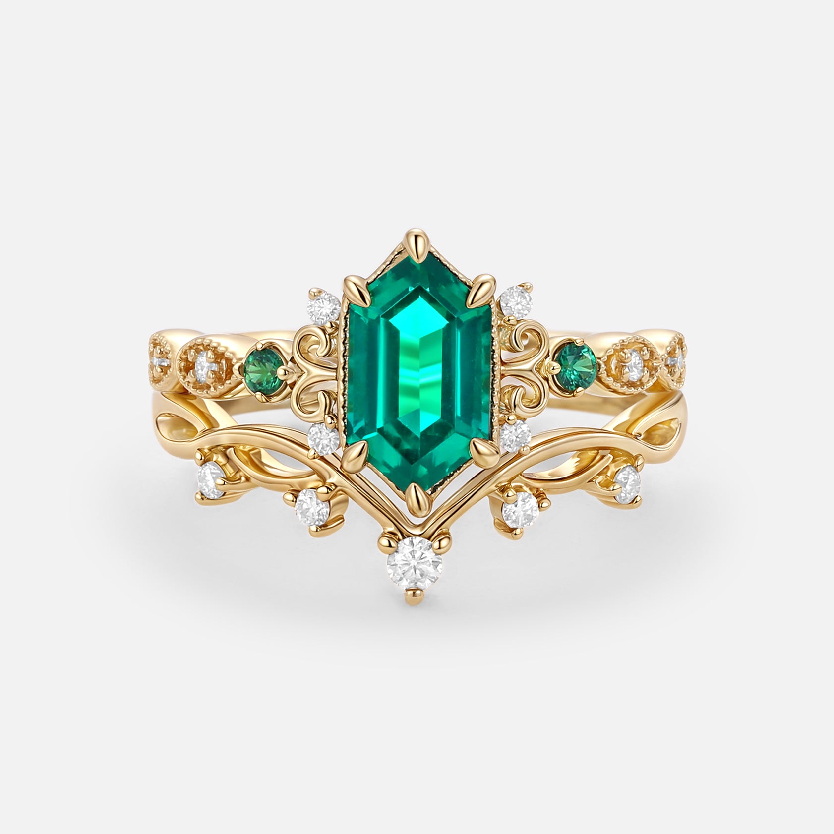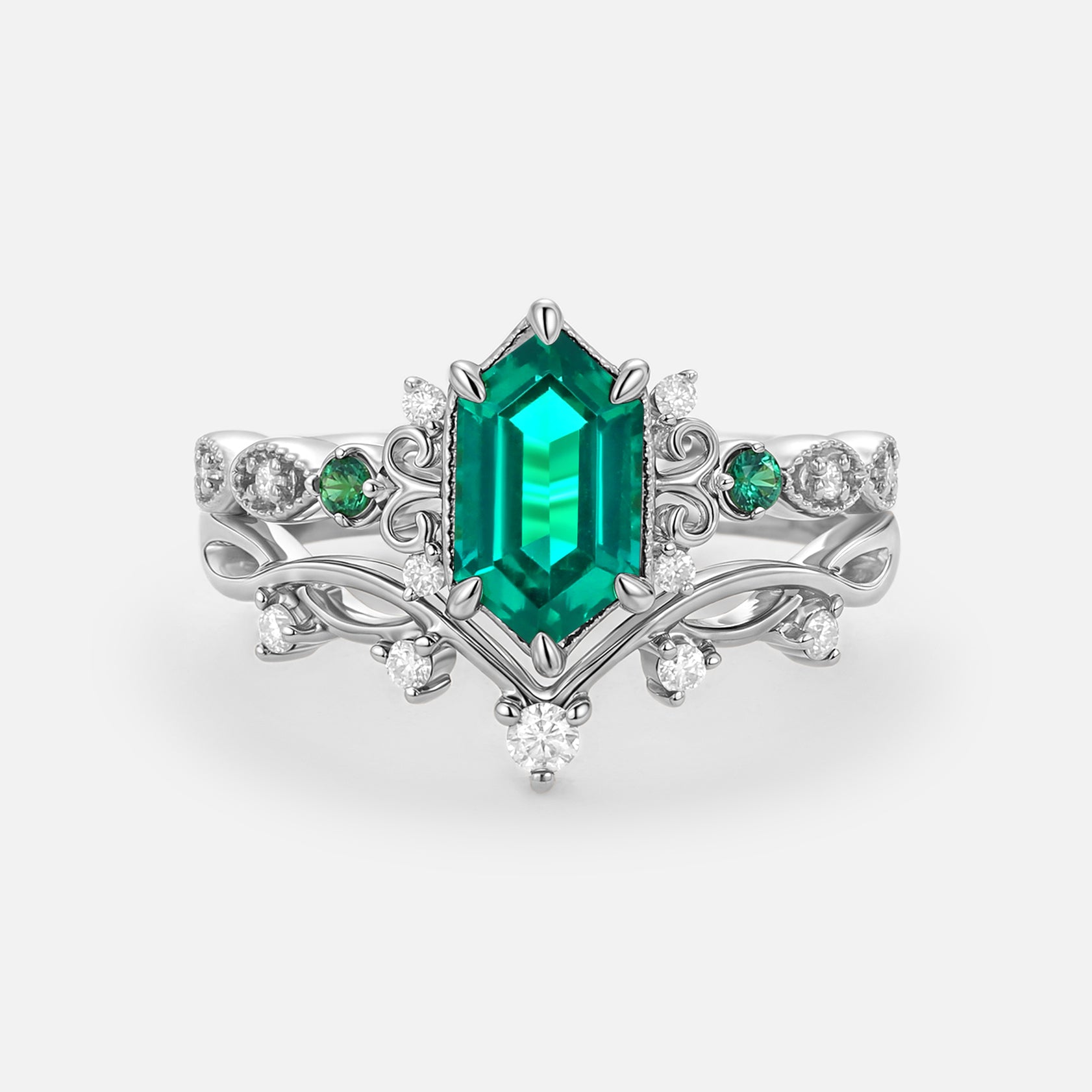 Long Hexagon Lab Emerald Engagement Ring Set 2pcs - Beryl