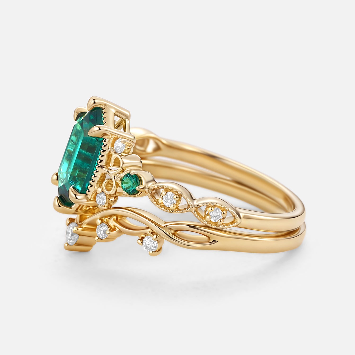 Featuring an elongated hexagon lab emerald center stone framed by retro beaded edges, the main ring harmonizes perfectly with its infinity-symbol wedding band. Like the evergreen lushness of emeralds that endures through seasons, true love embraces every chapter with unwavering devotion. This ring honors love not as a static gem, but as an eternal bond—rooted in sincerity, yet growing more profound with time.