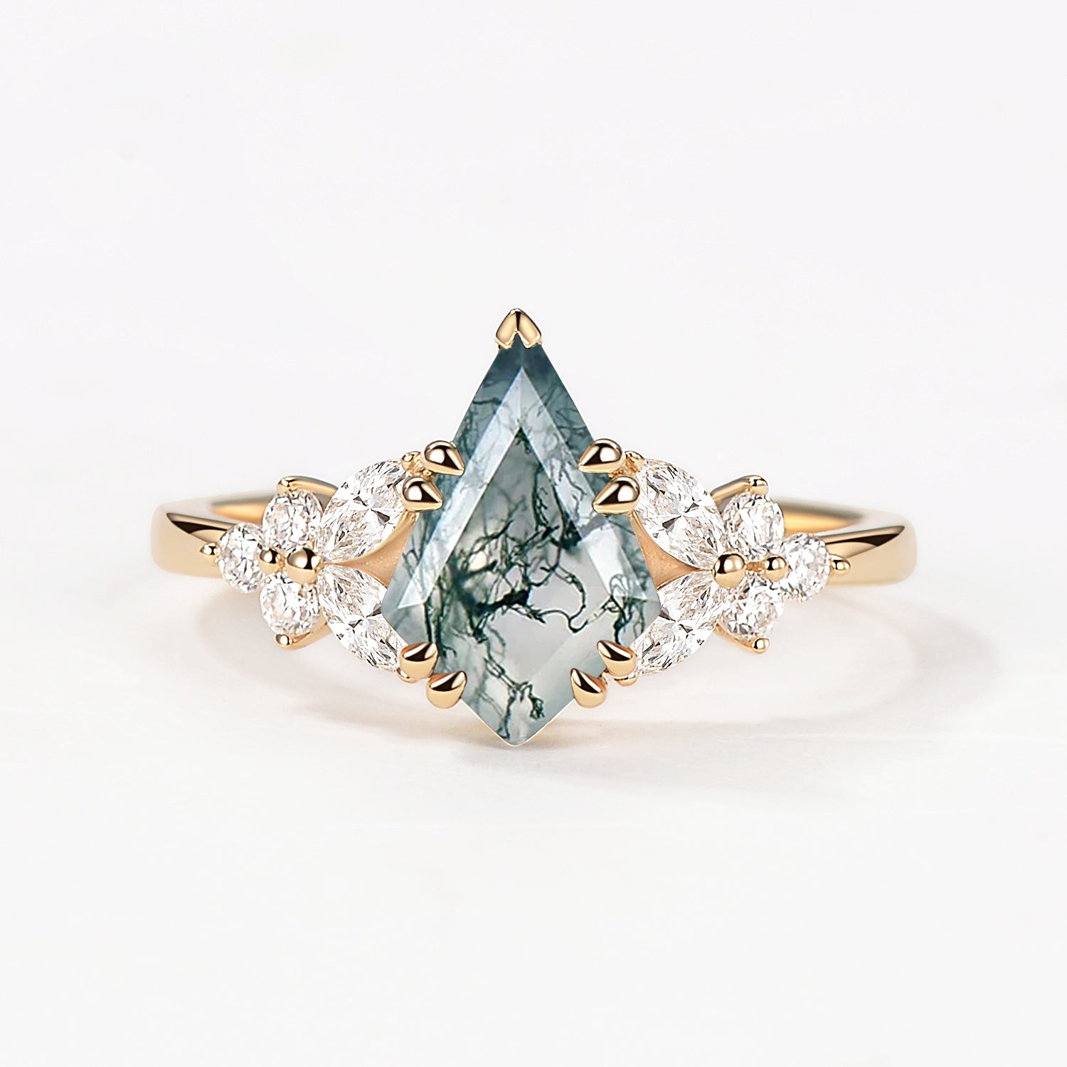 Kite shaped Moss agate engagement ring Vintage yellow gold moissanite engagement set Branch Marquise cut wedding ring Anniversary gift