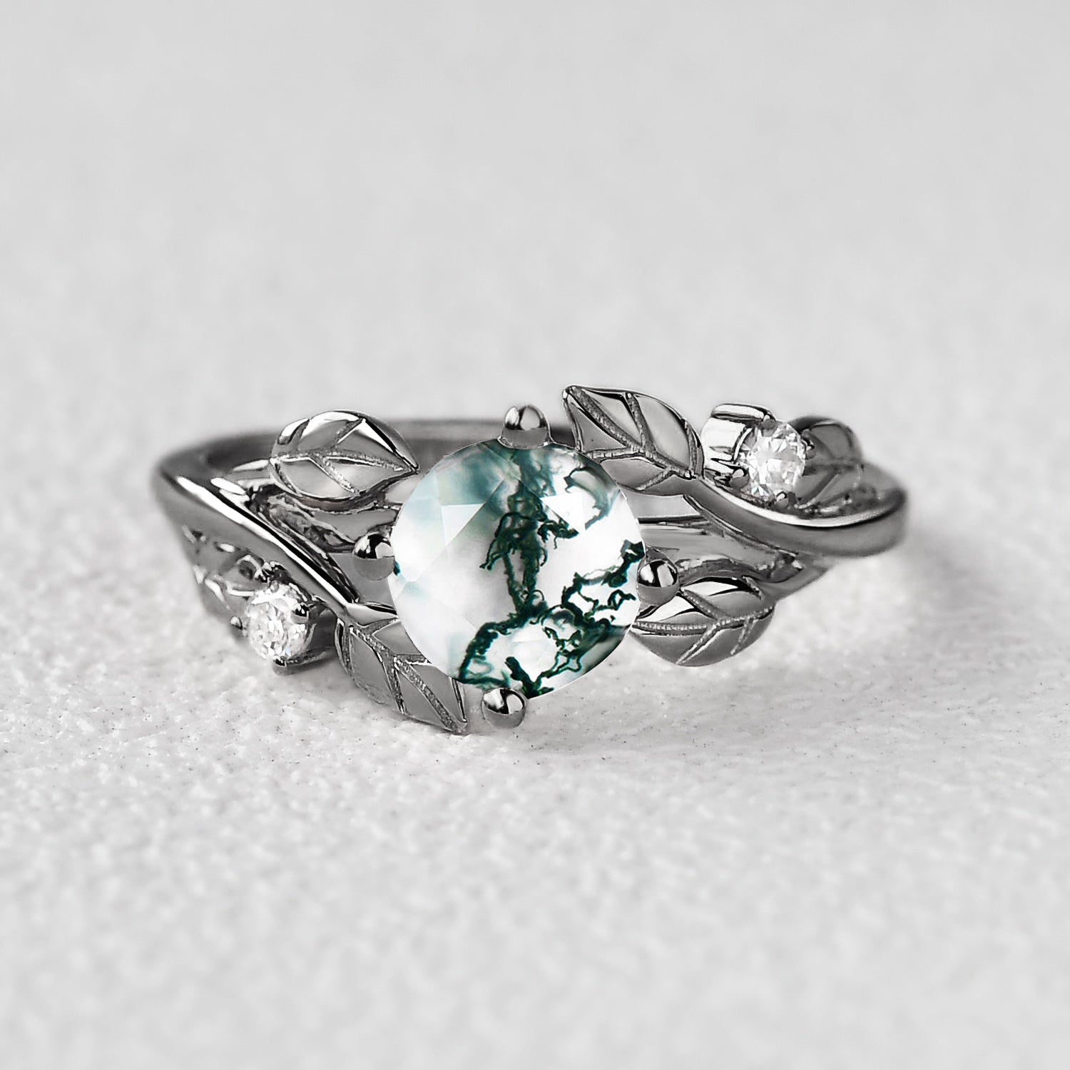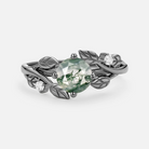 Black Gold Round Shaped Leaf Moss Agate Engagement Ring - Gardenia