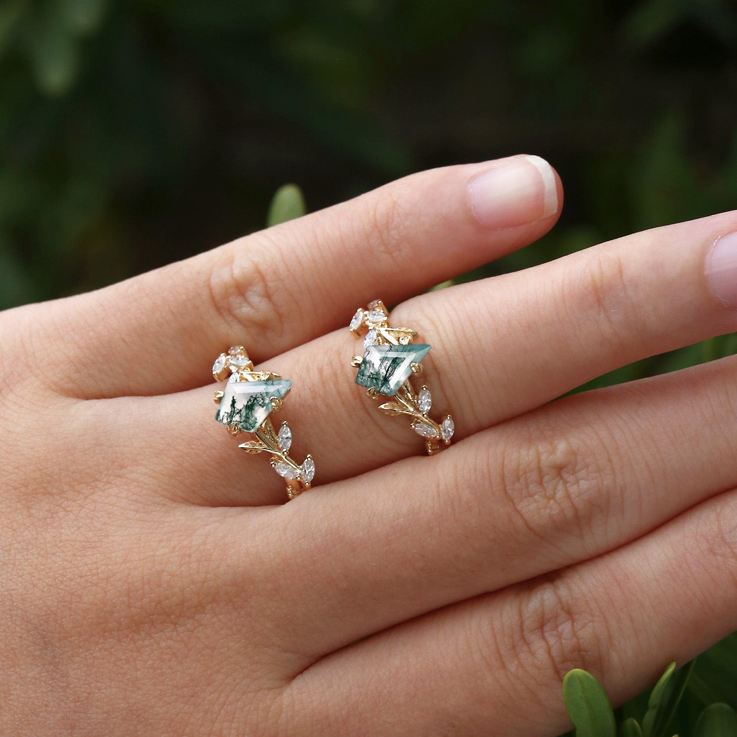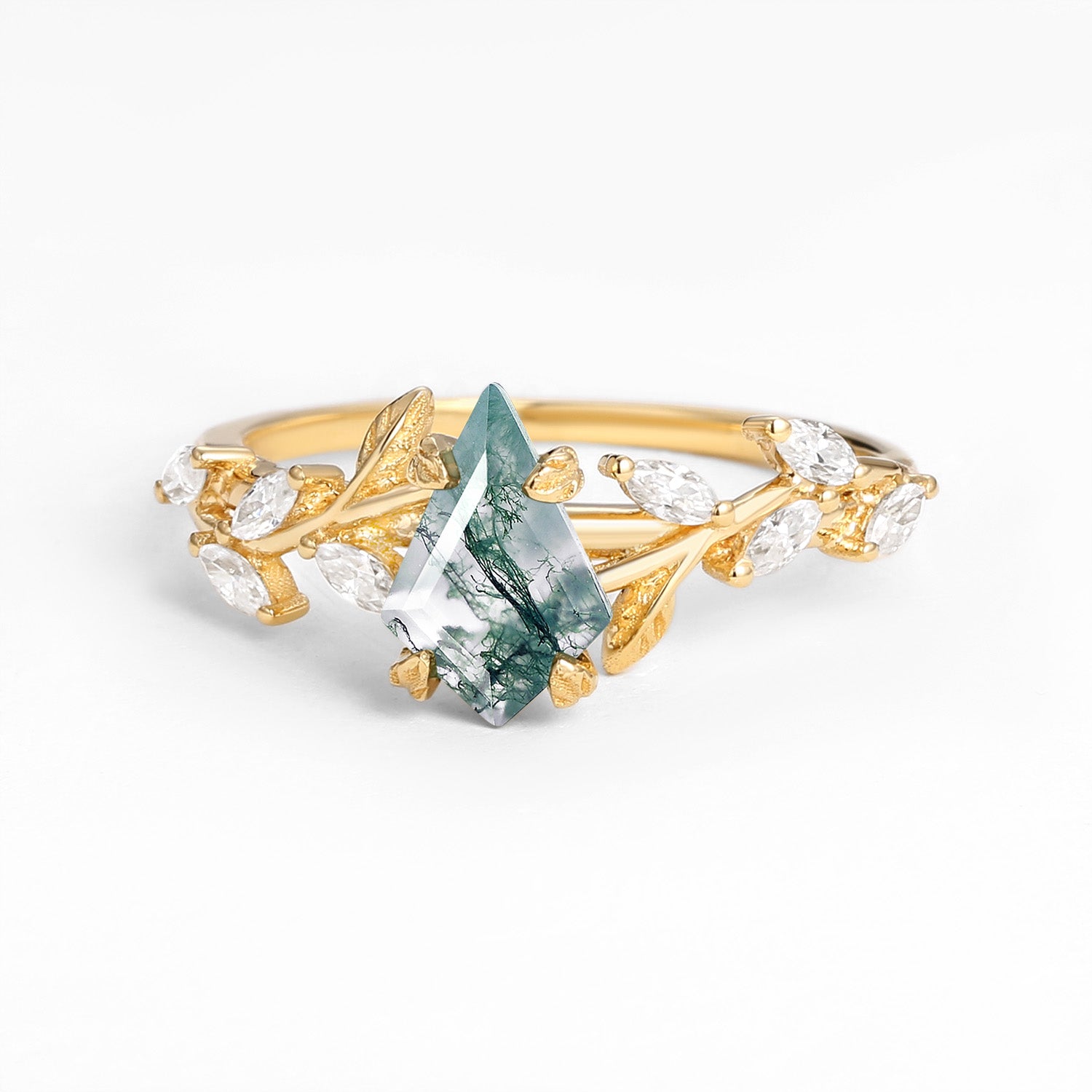 Kite Cut Clear Moss Agate Leafy Gold Engagement Ring - Dart