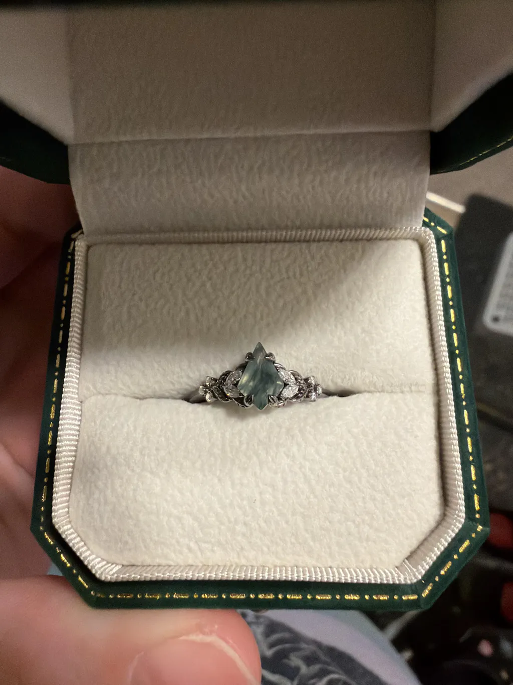 Kite Cut Moss Agate Vine Leafy Gold Engagement Ring