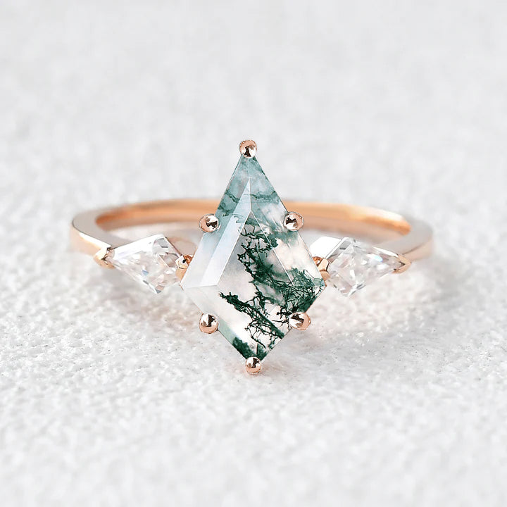 Moss Agate Kit Cut Three-stone Bezel Engagement Ring
