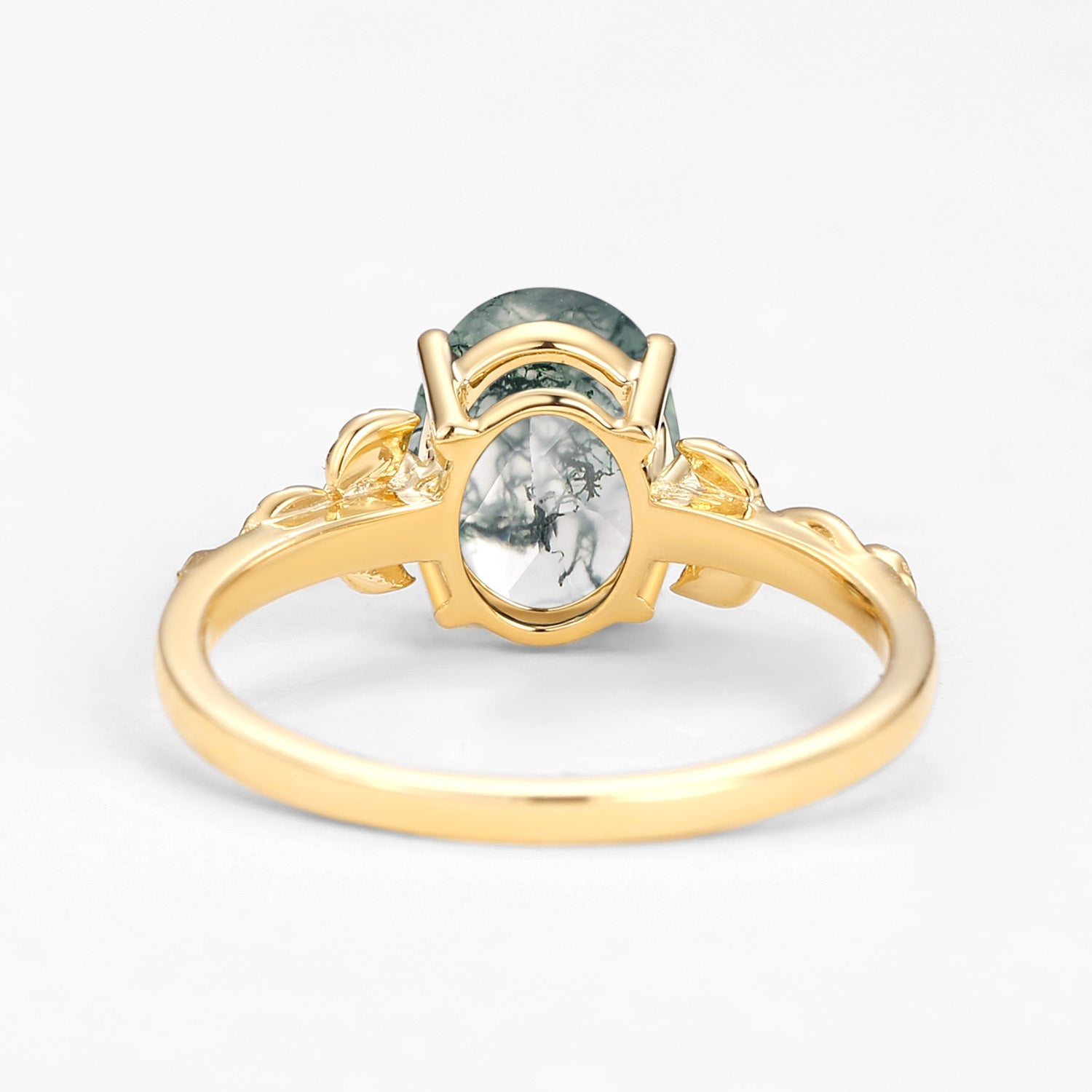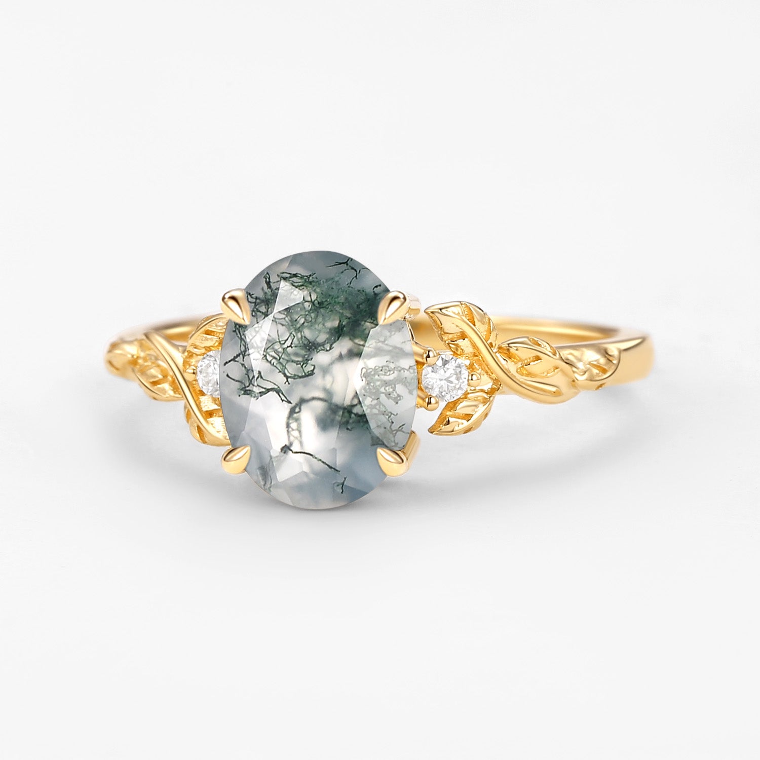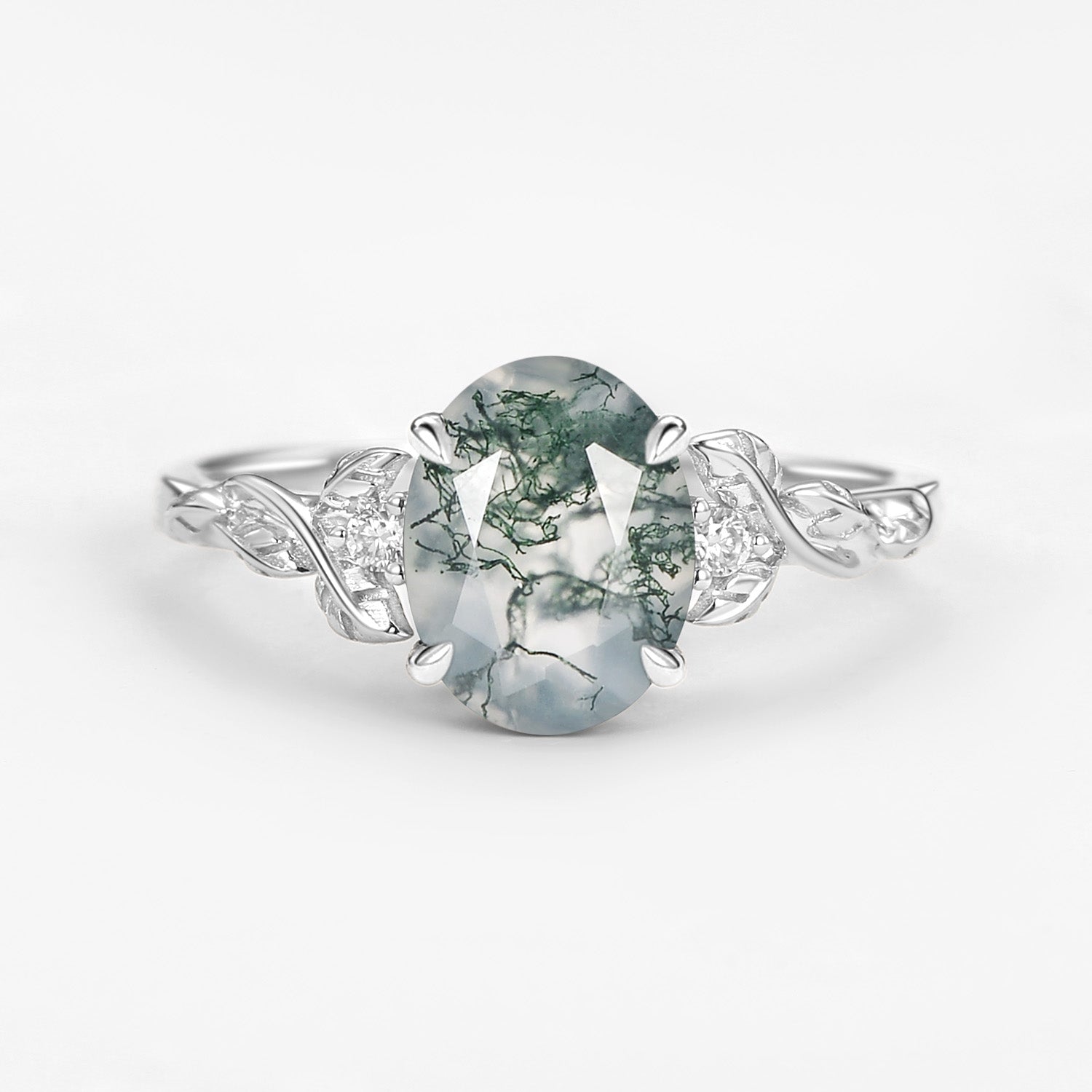 Oval Shaped Moss Agate Leafy Wedding Engagement Ring - Clover