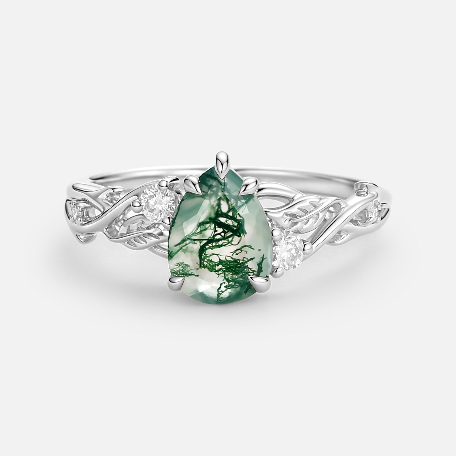 Pear Shaped Moss Agate Leafy Engagement Ring - Poire