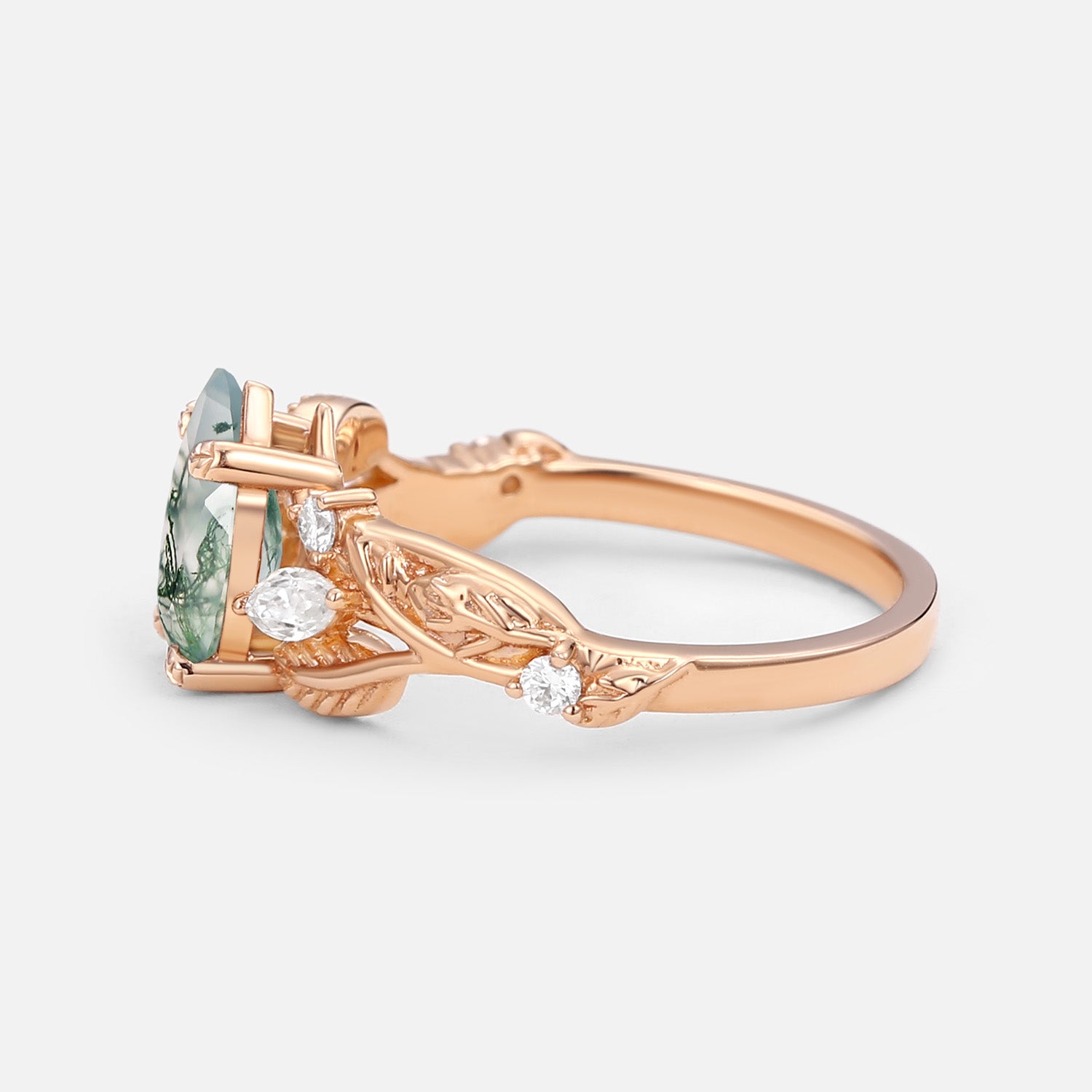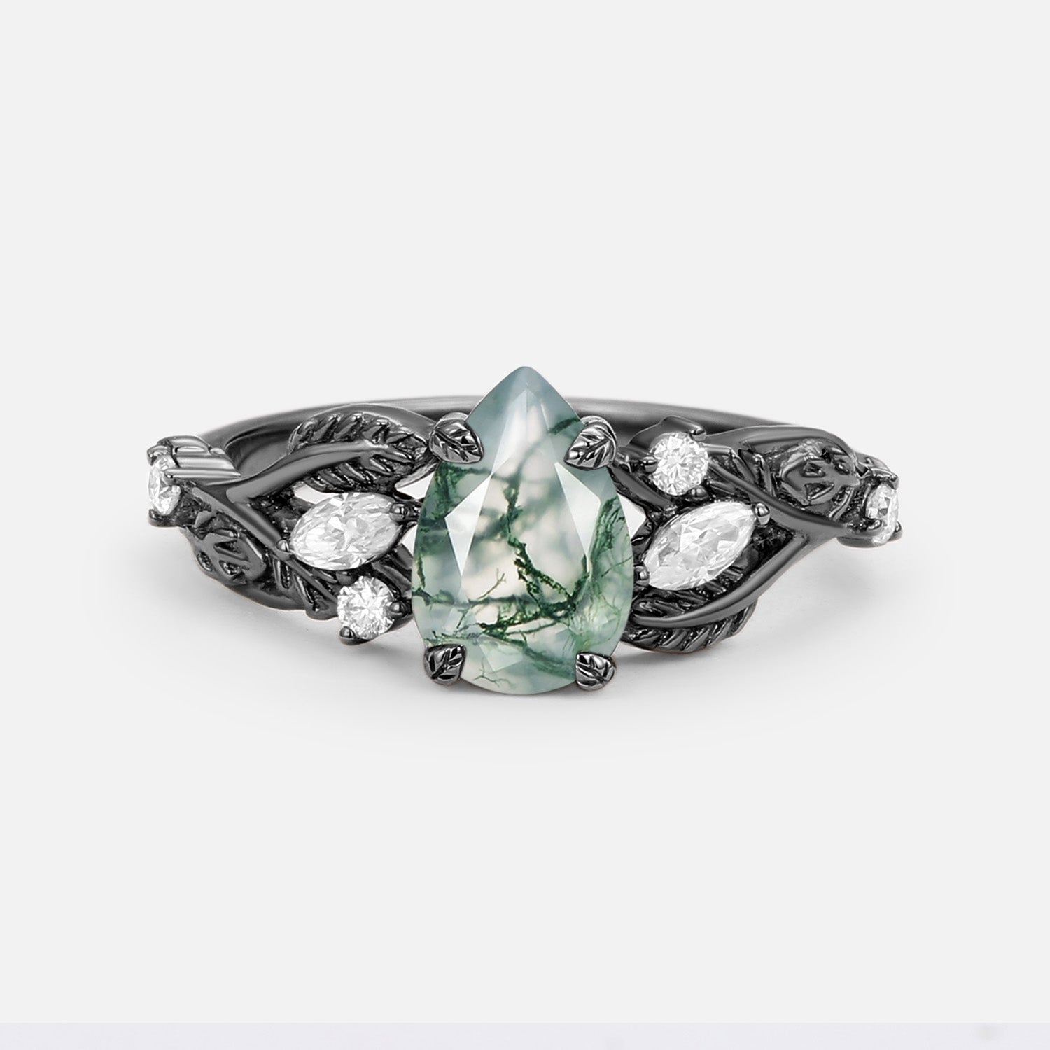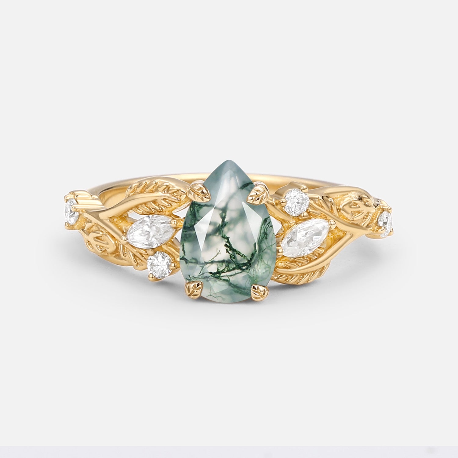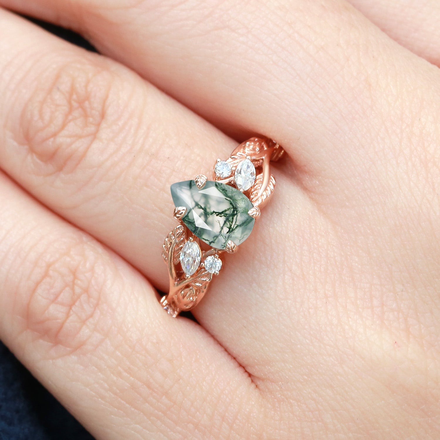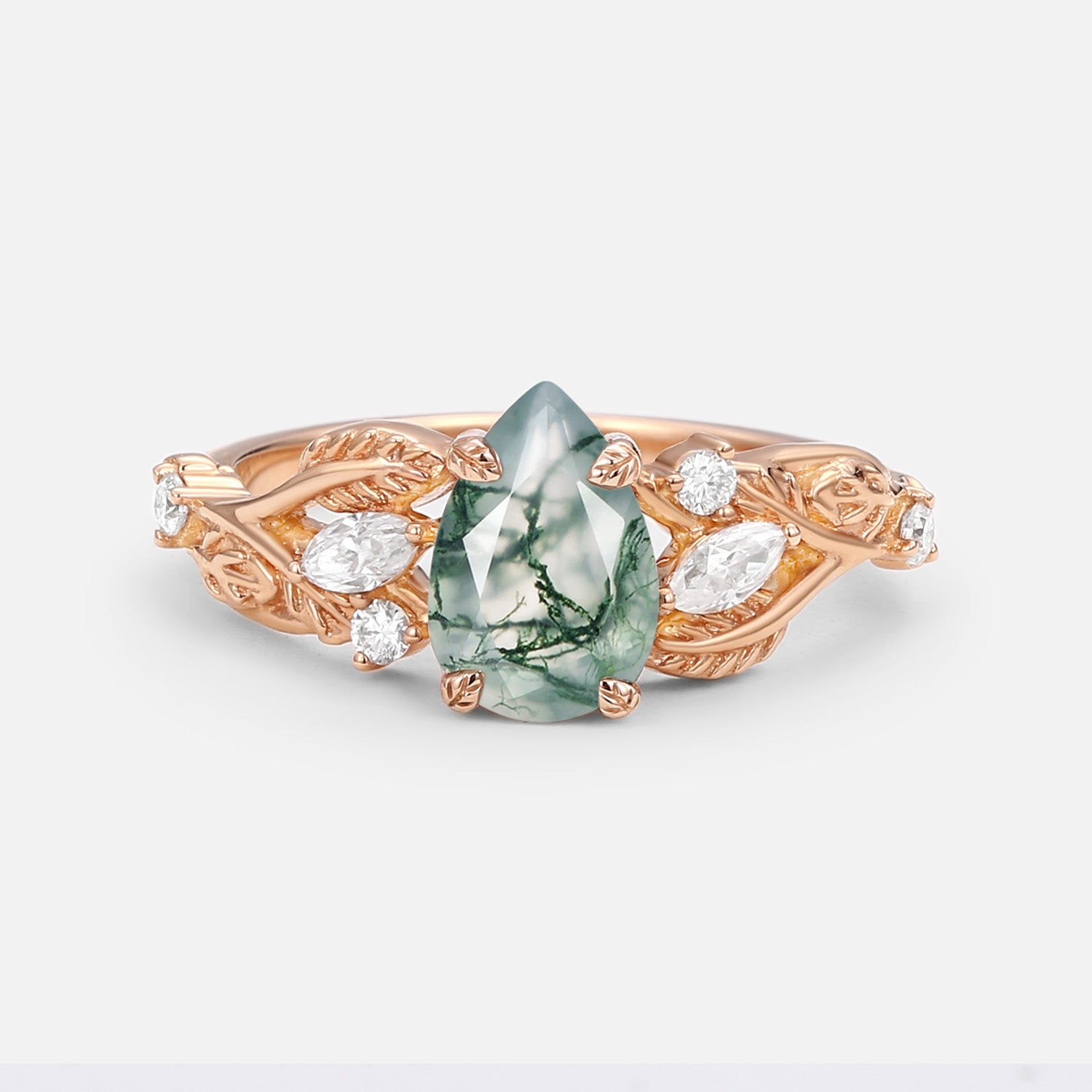 Pear Shaped Moss Agate Leafy Wedding Engagement Ring