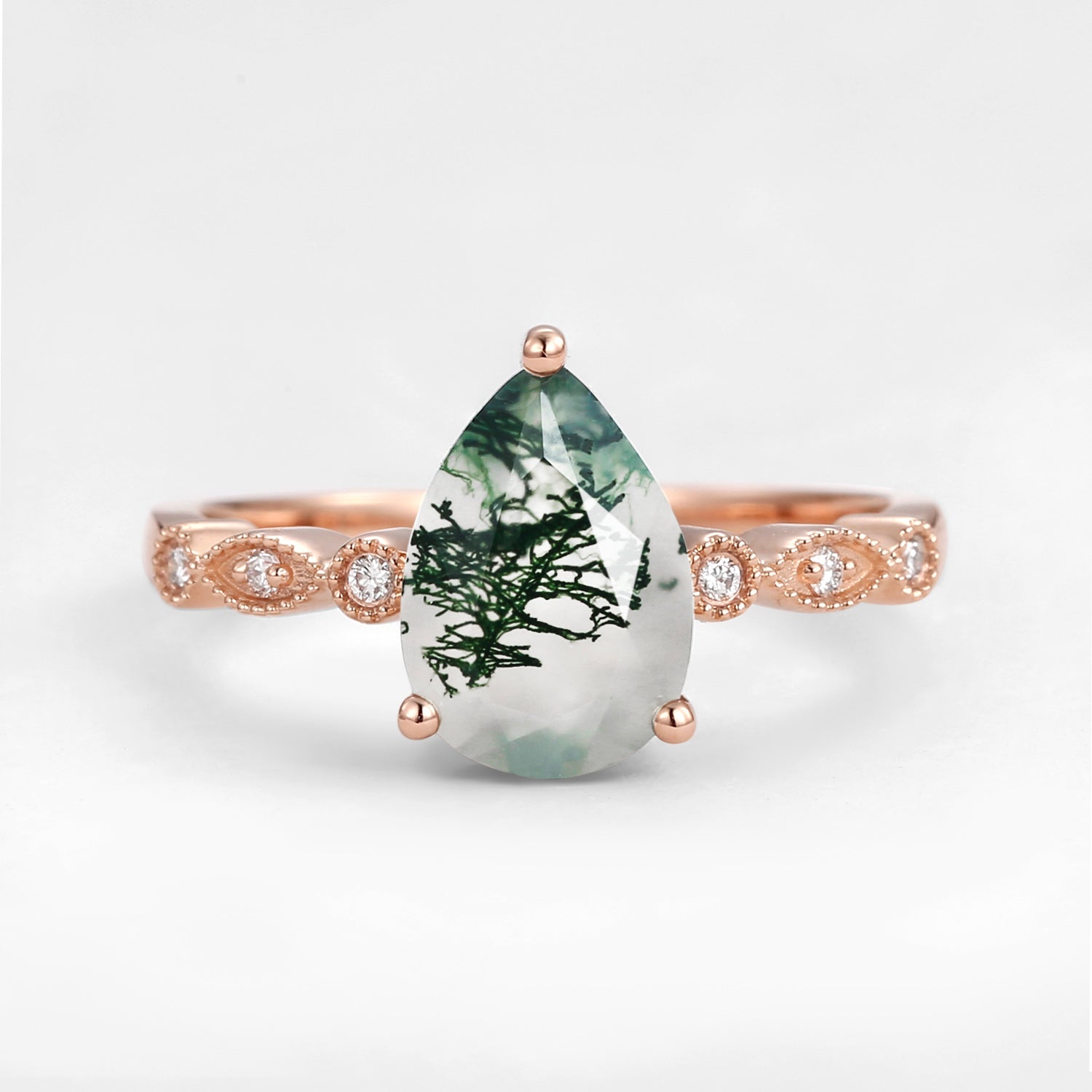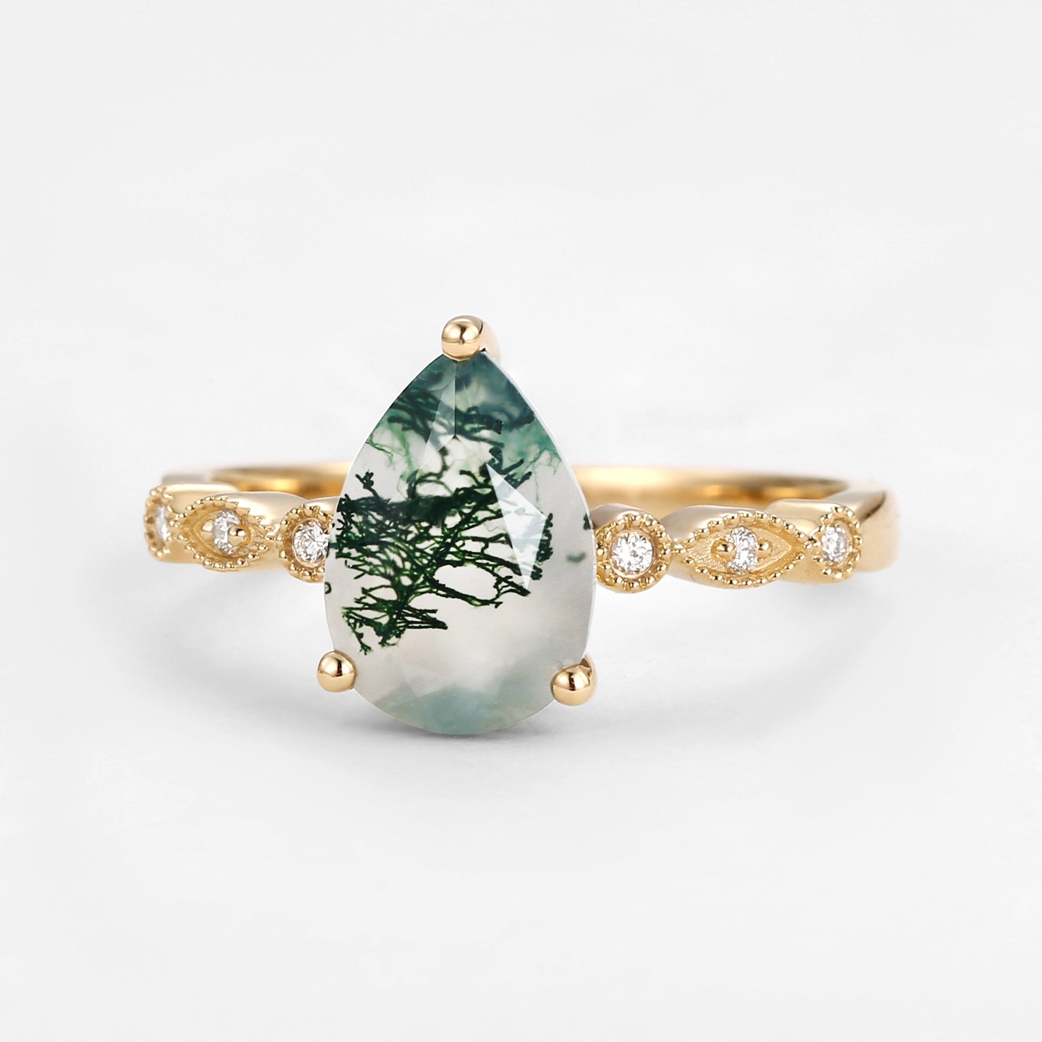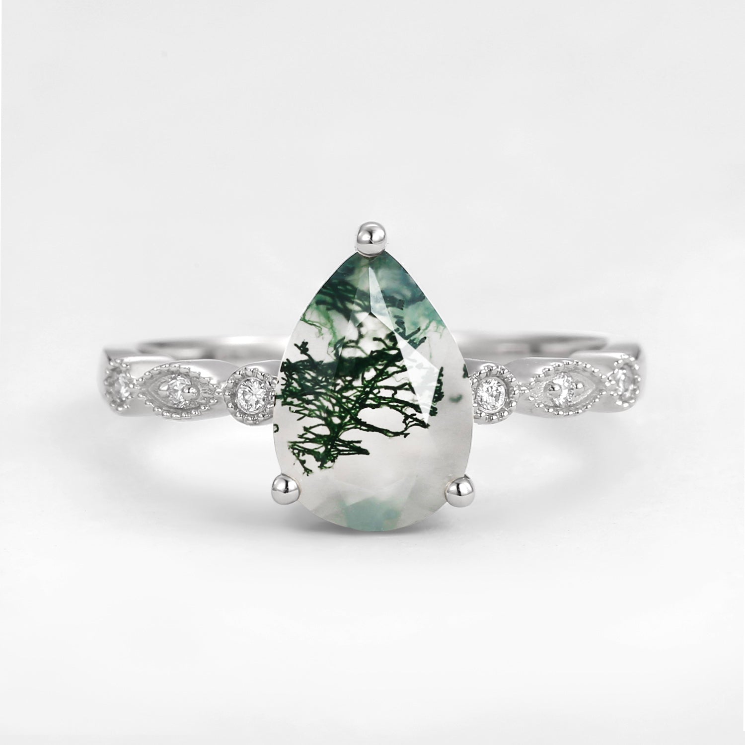 Unique Inspired Pear Shaped Moss Agate Engagement Ring