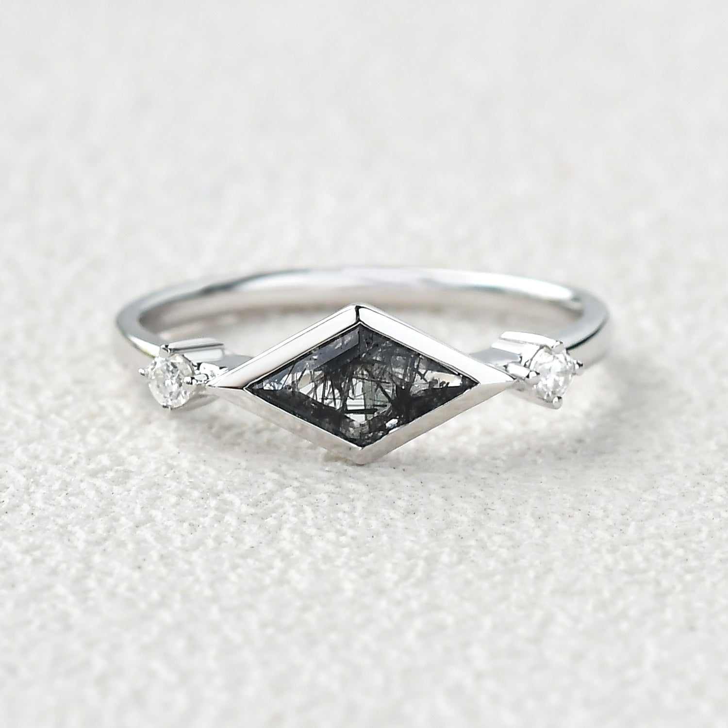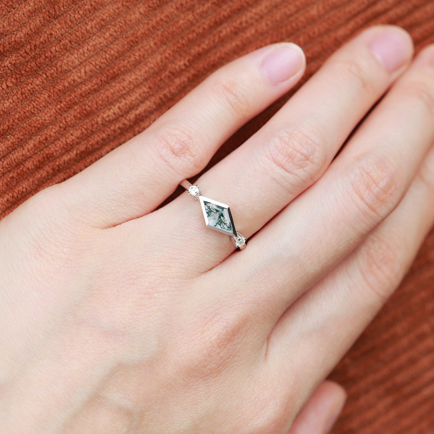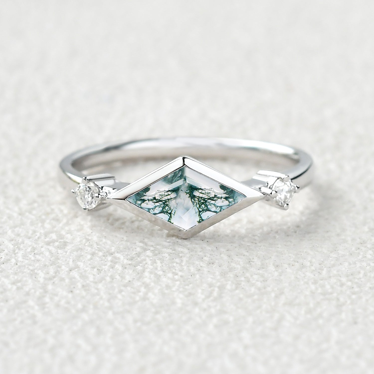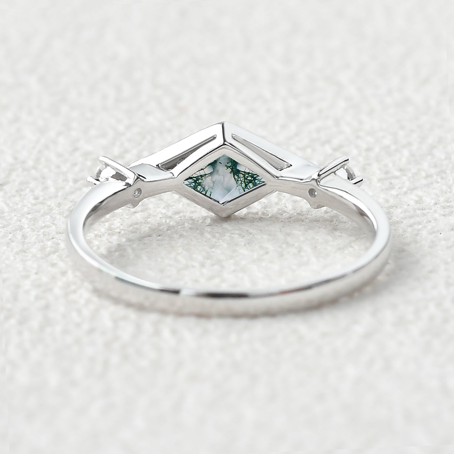 East-West Moss Agate Rhombus Cut Bezel Set Ring