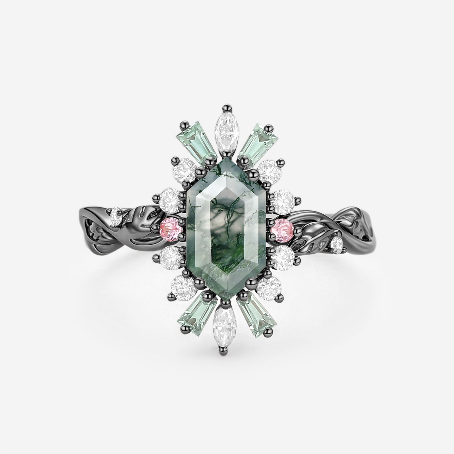 Vintage Halo Moss Agate Elongated Hexagon Engagement Ring - Artemis