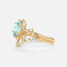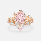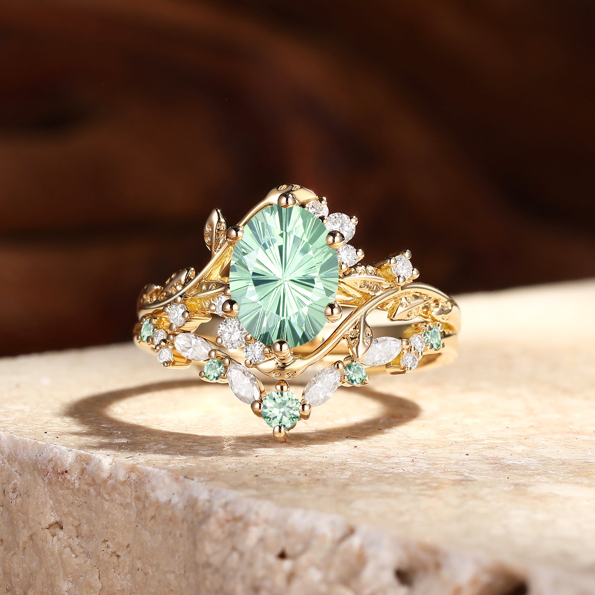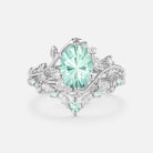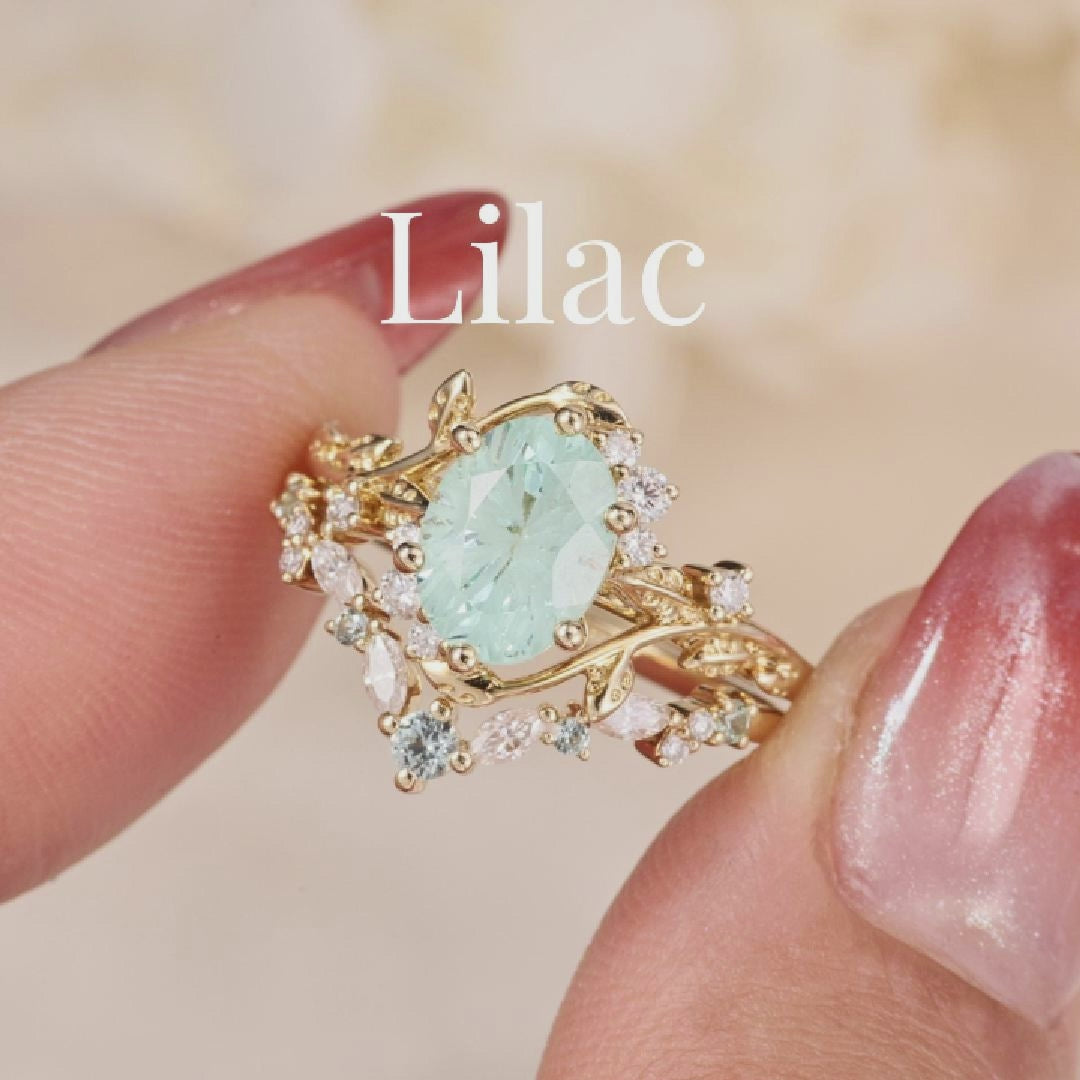 Embrace the dewy freshness of the Lilac engagement ring set. The luminous lab green sapphire at its core, shaped into a sleek oval with a striking firework cut, boasts multi-layered facets that catch light to cast a soft, shimmering glow with every movement. It’s delicately held in refined prongs, while both bands of the 2pcs set are adorned with exquisitely carved leafy patterns—echoing the gentle curl of foliage unfurling in a misty forest at dawn. This intricate detailing lets the set exude understated natural elegance from every angle.
