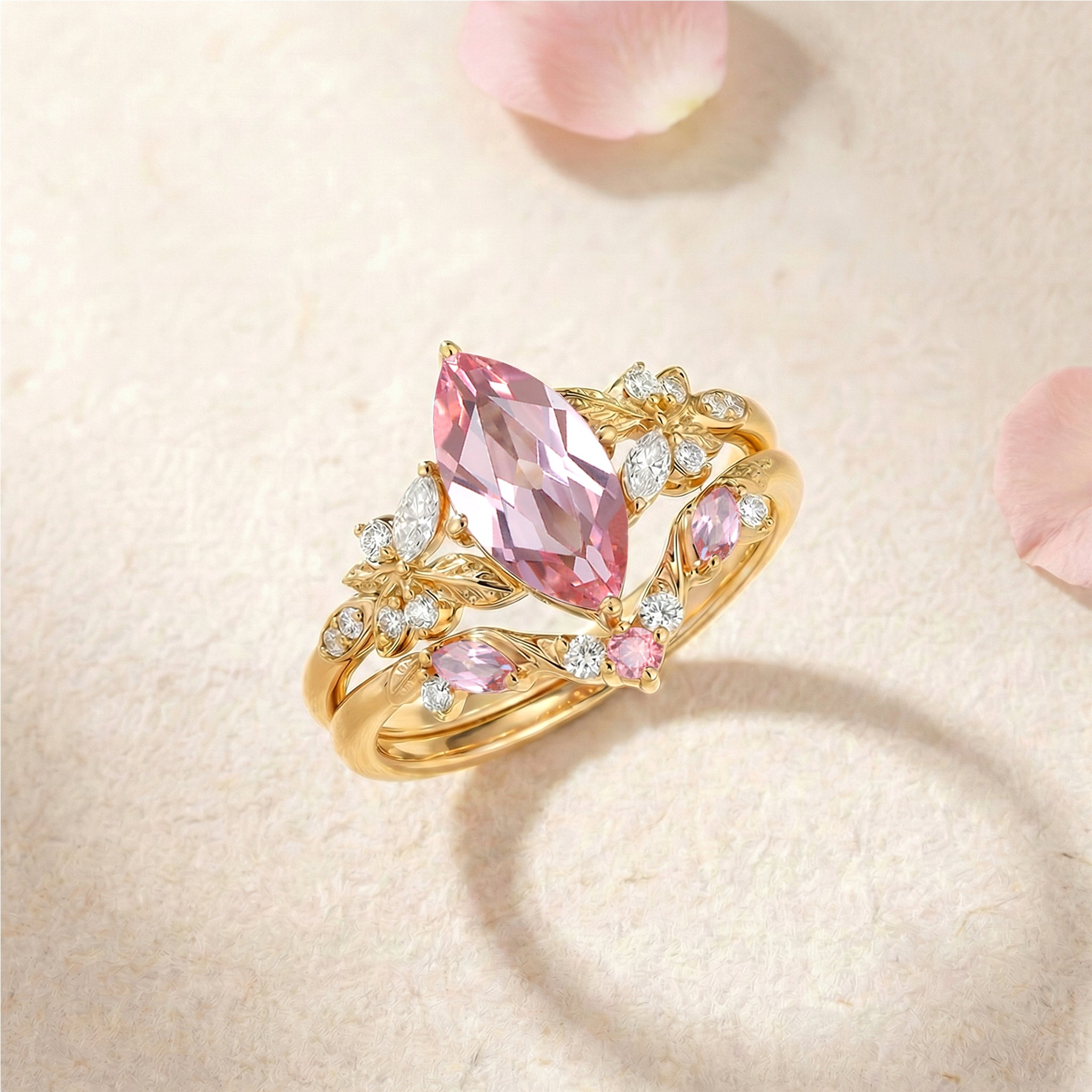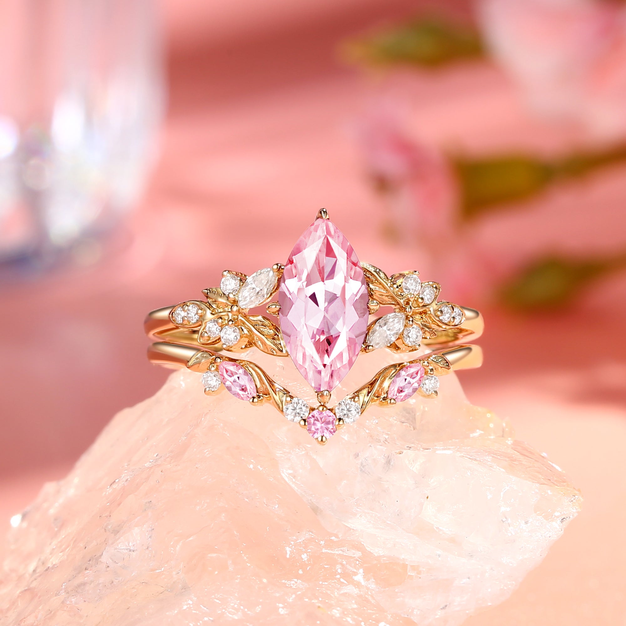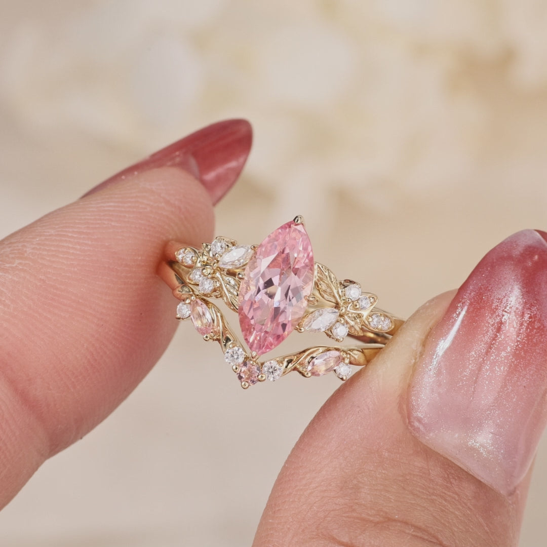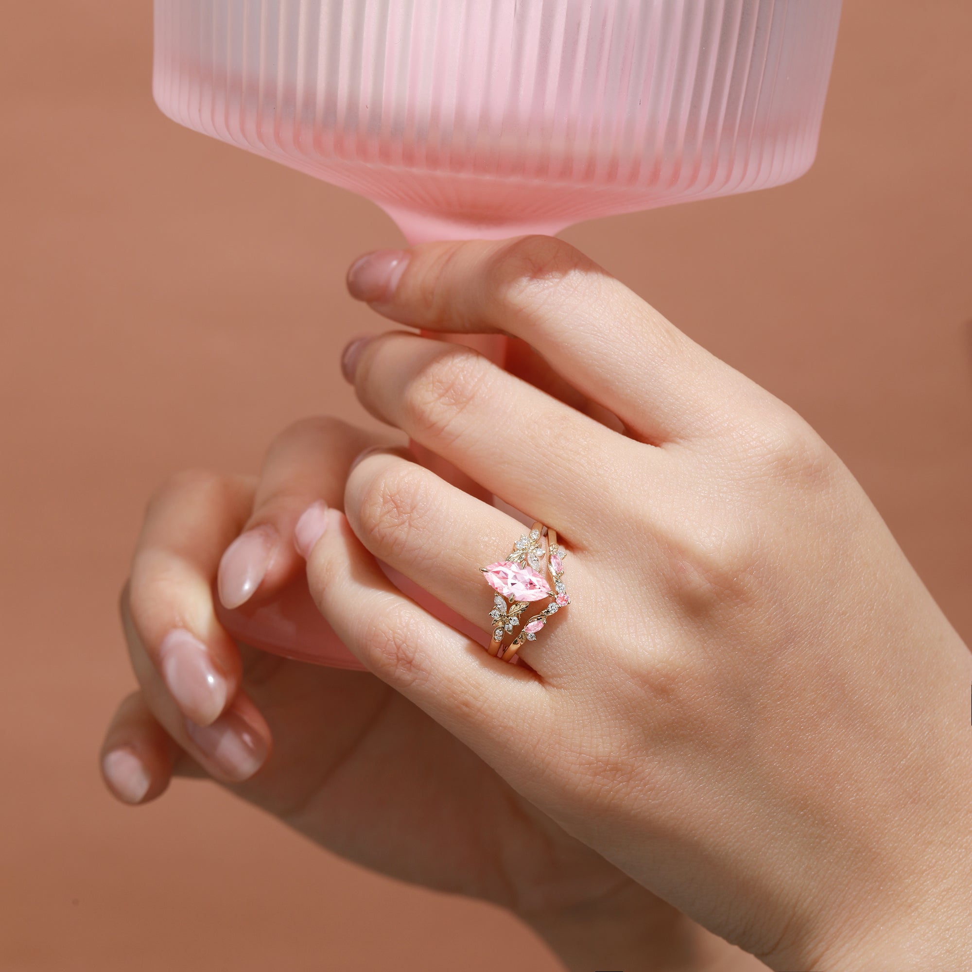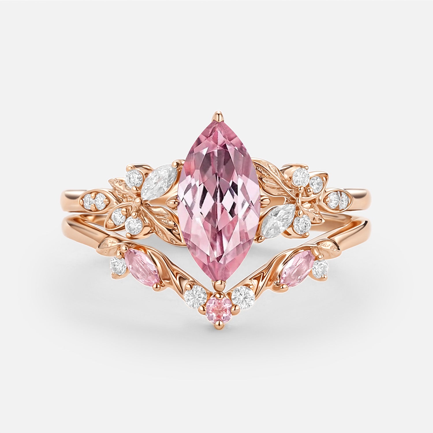 Marquise Lab Pink Sapphire Leafy Engagement Ring Sets 2pcs - Peony