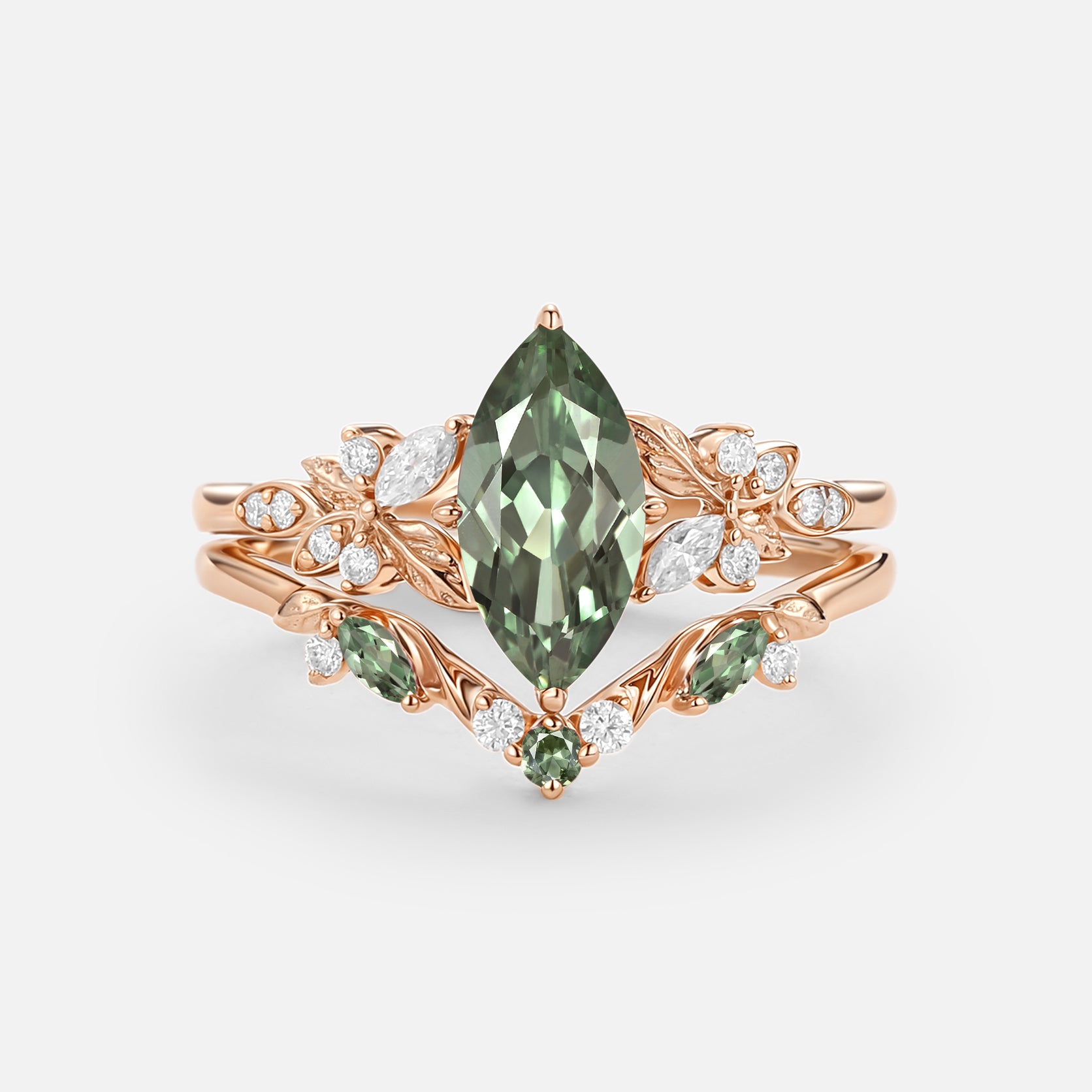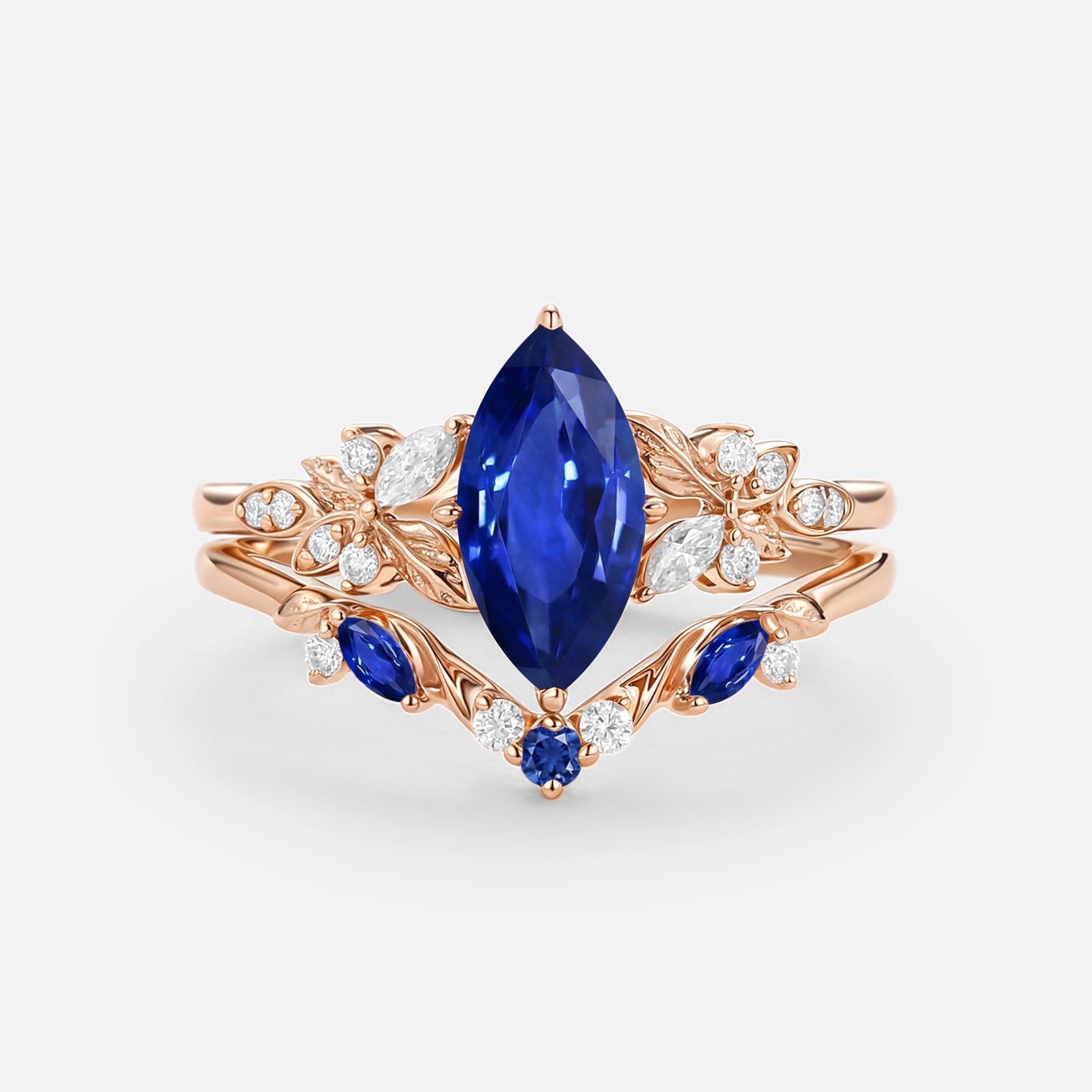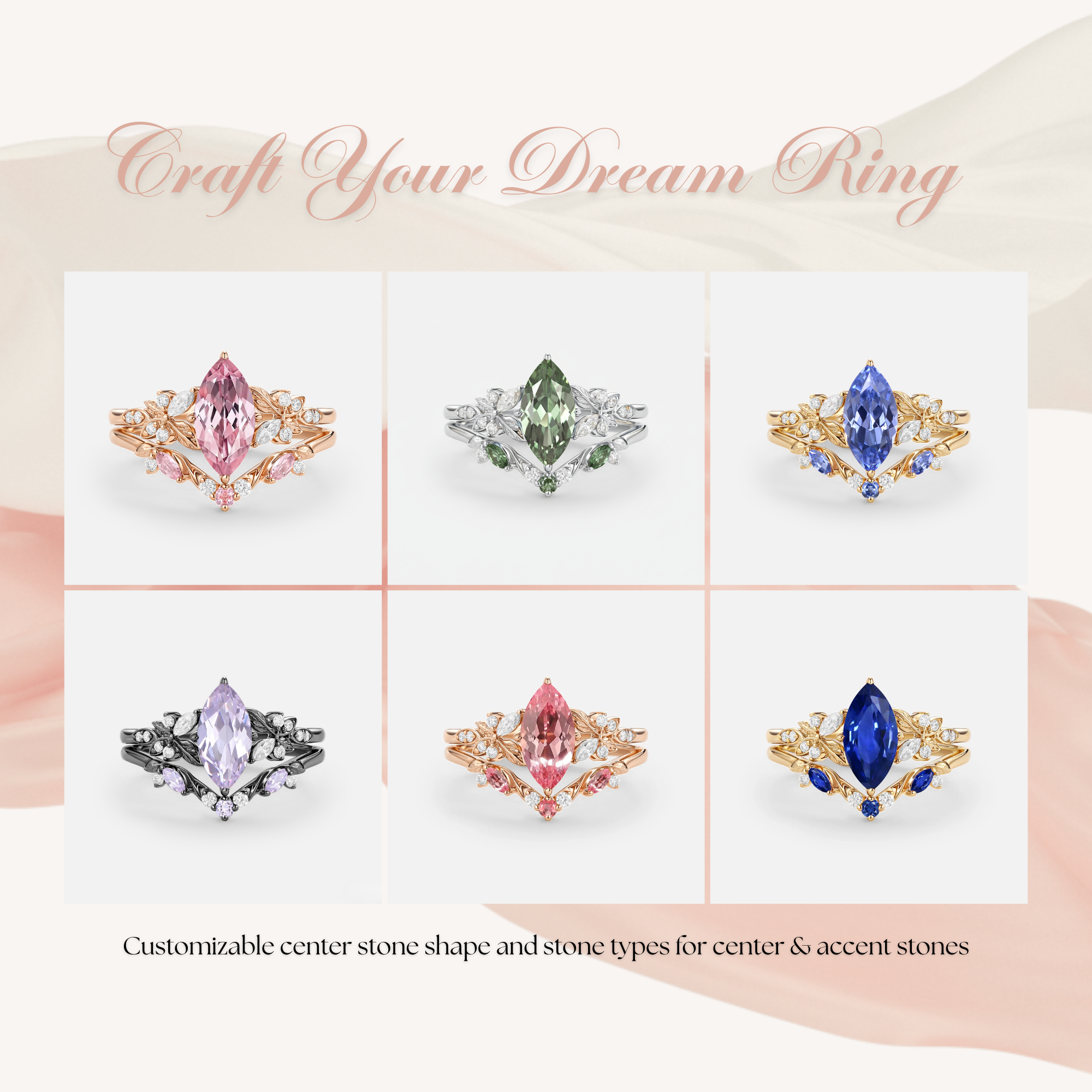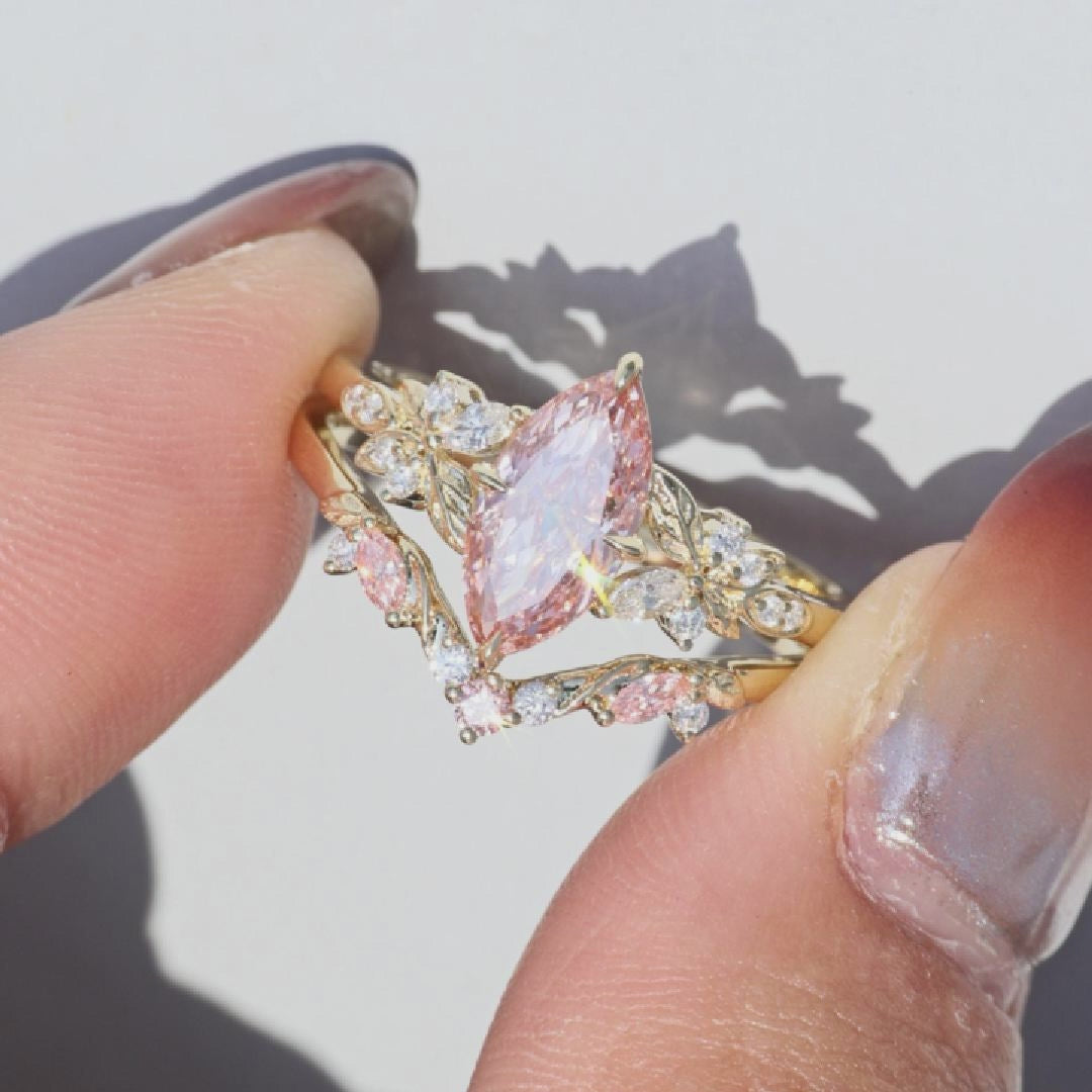 Marquise Lab Pink Sapphire Leafy Engagement Ring Sets 2pcs - Peony
