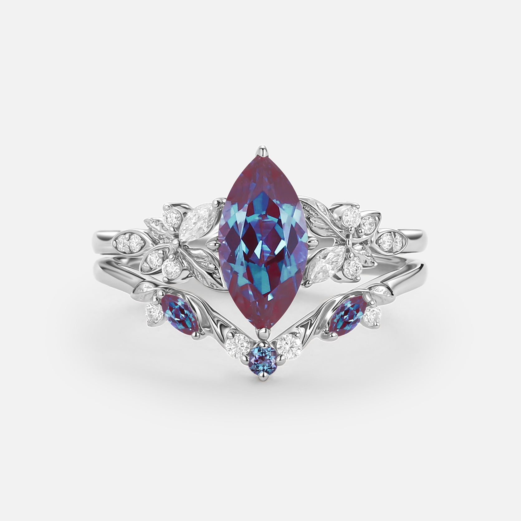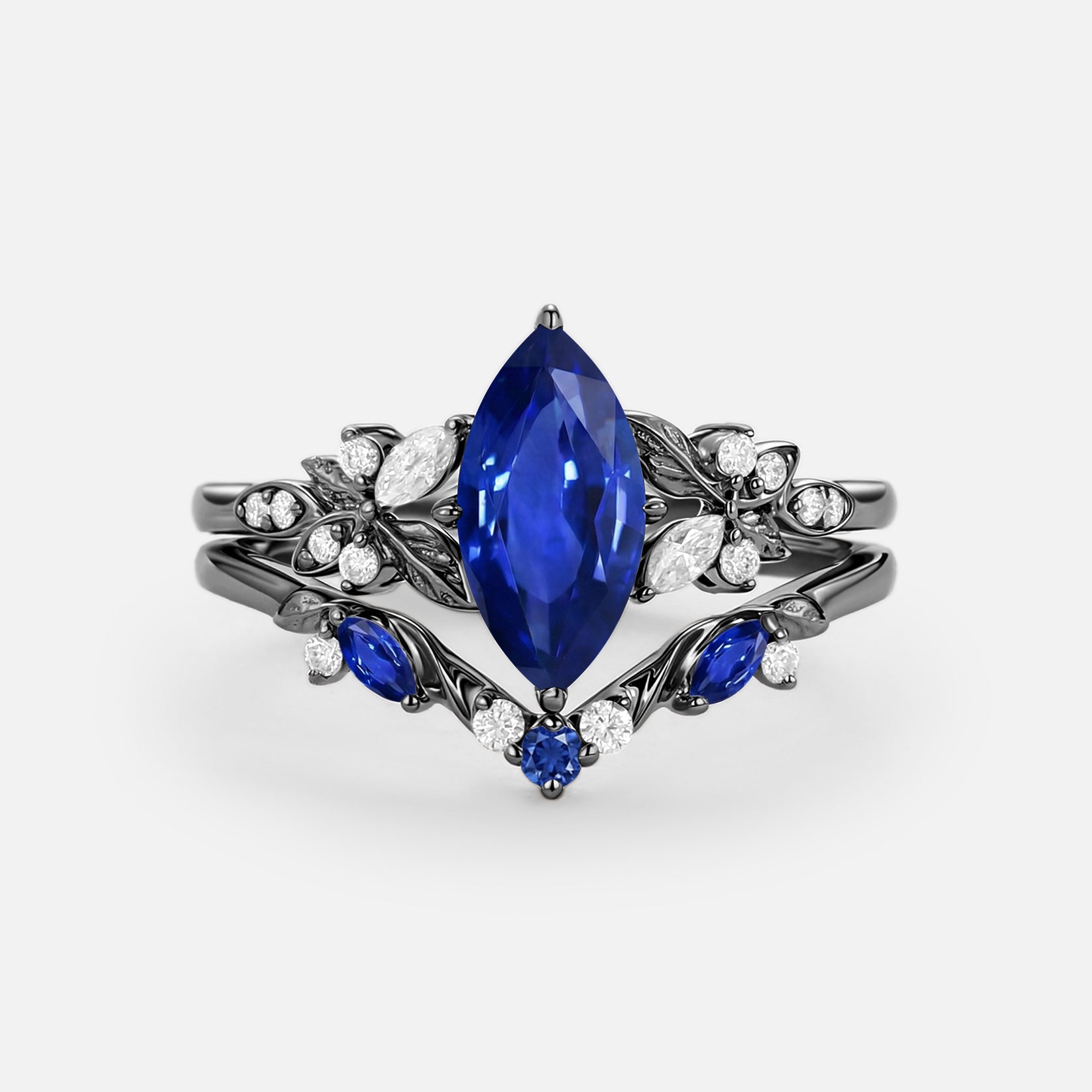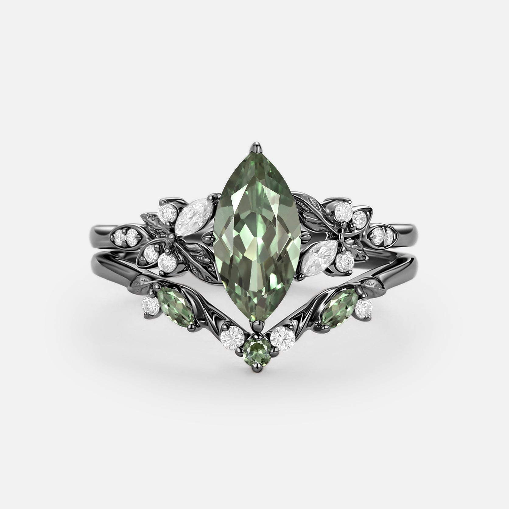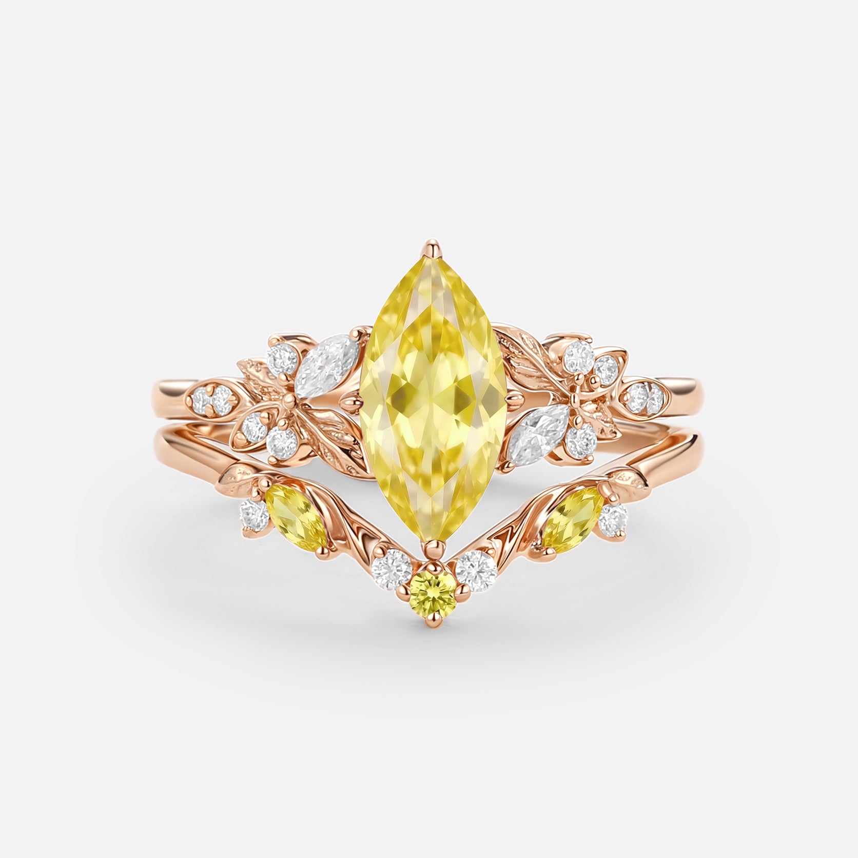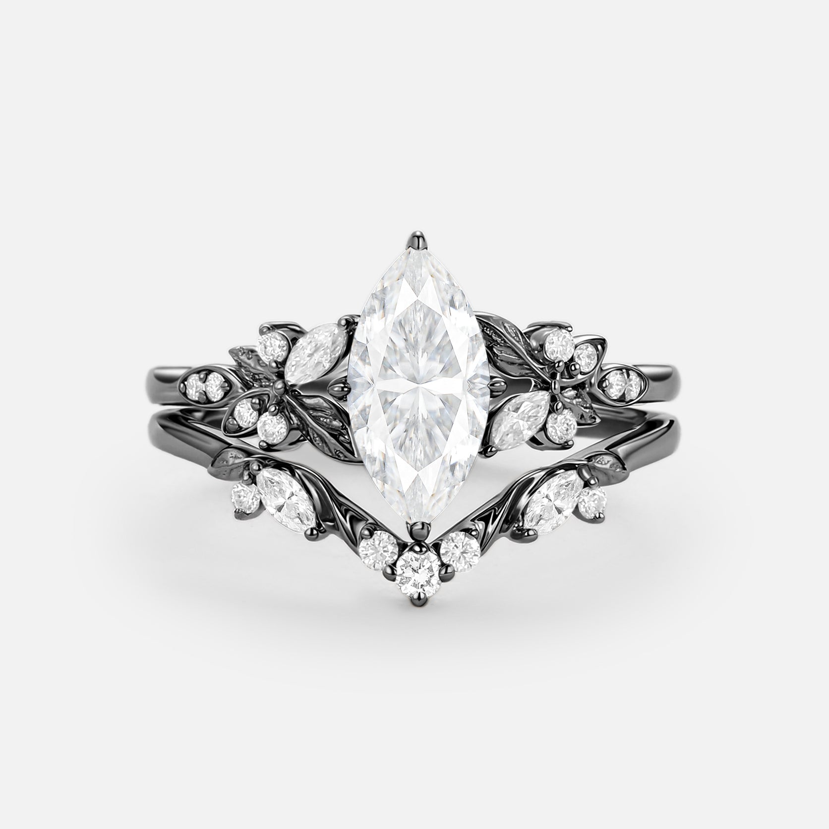Marquise Lab Pink Sapphire Leafy Engagement Ring Sets 2pcs - Peony