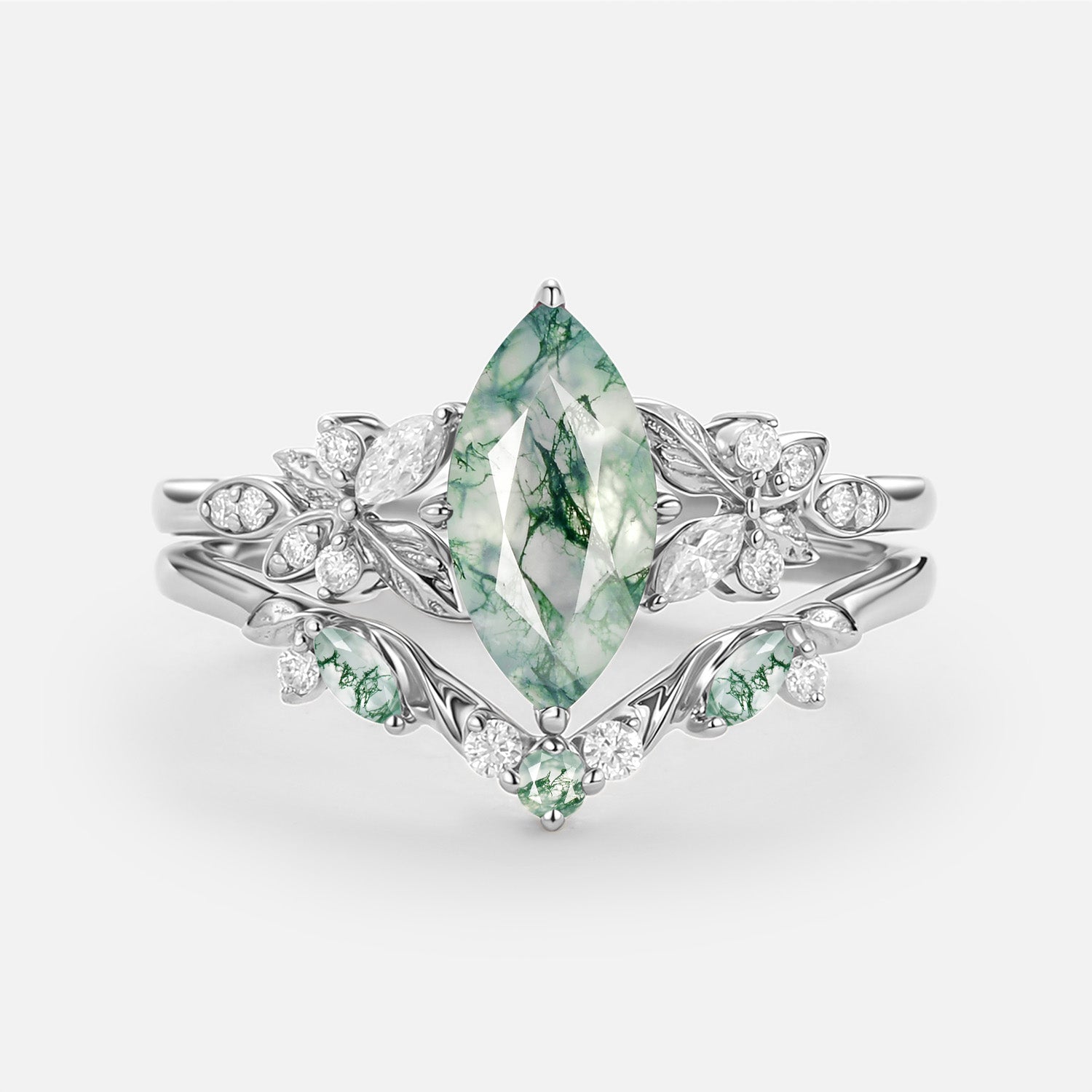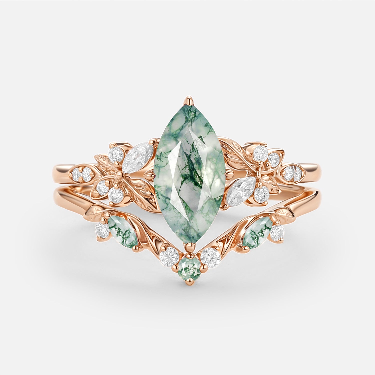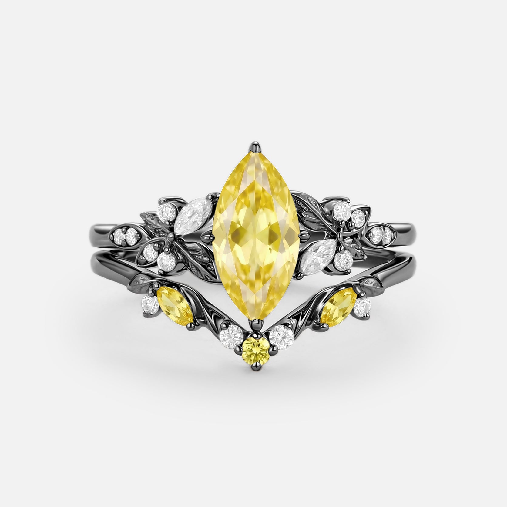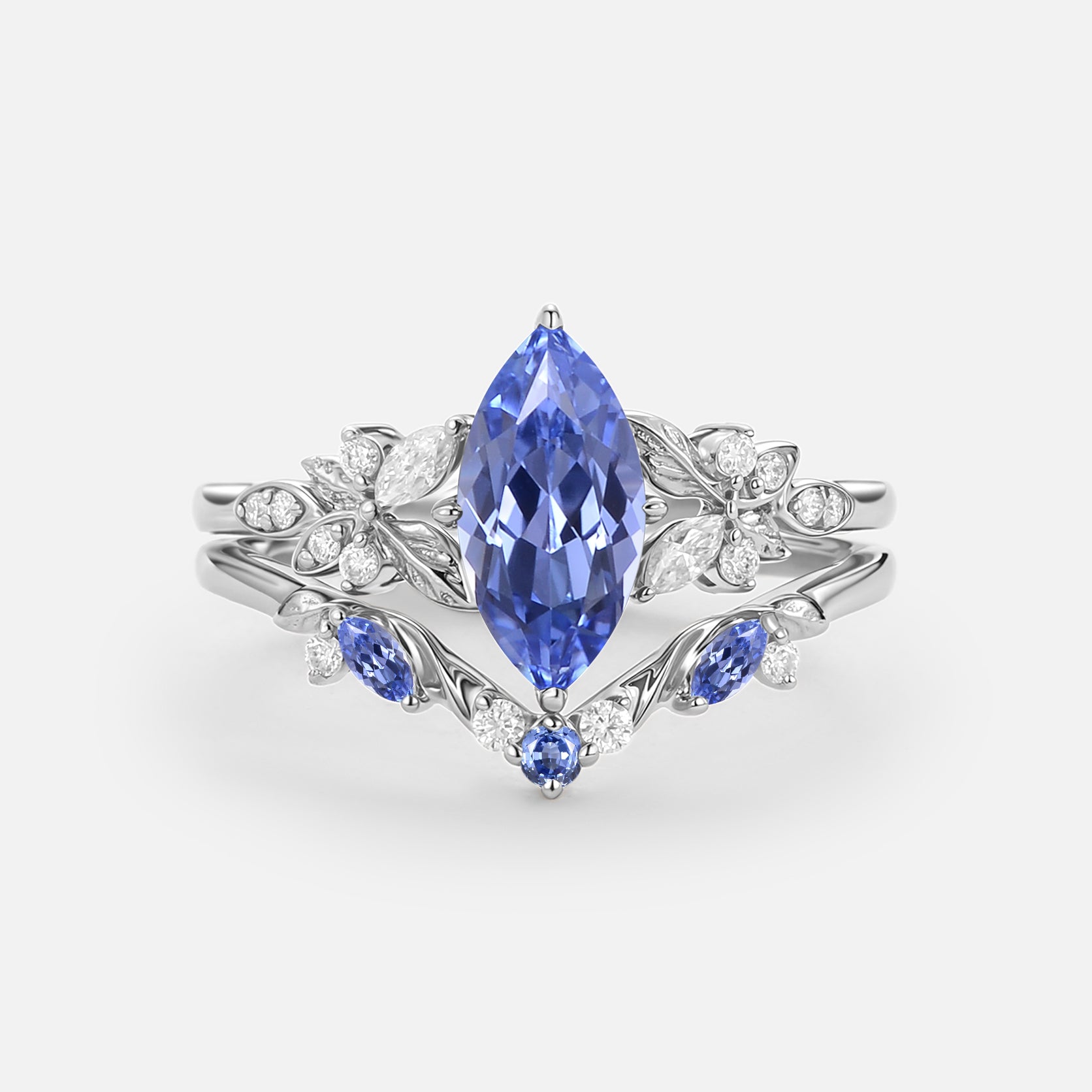 Marquise Lab Pink Sapphire Leafy Engagement Ring Sets 2pcs - Peony